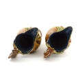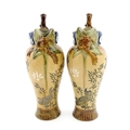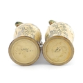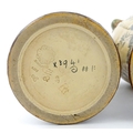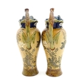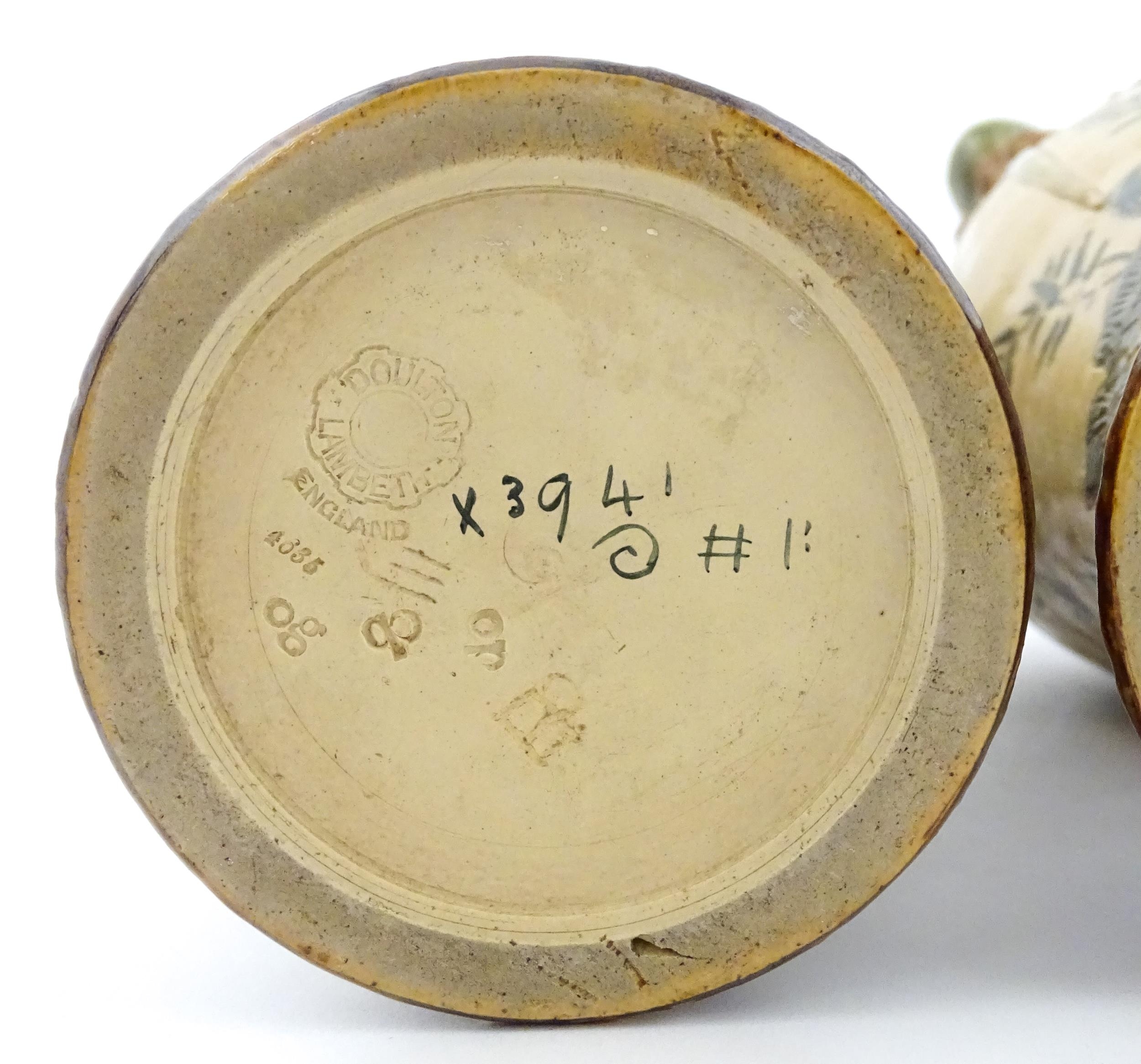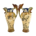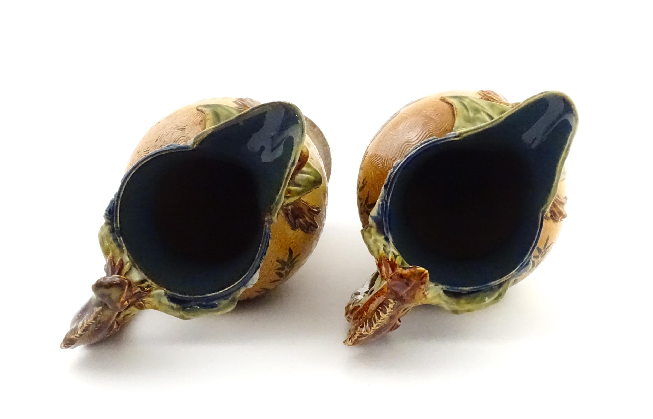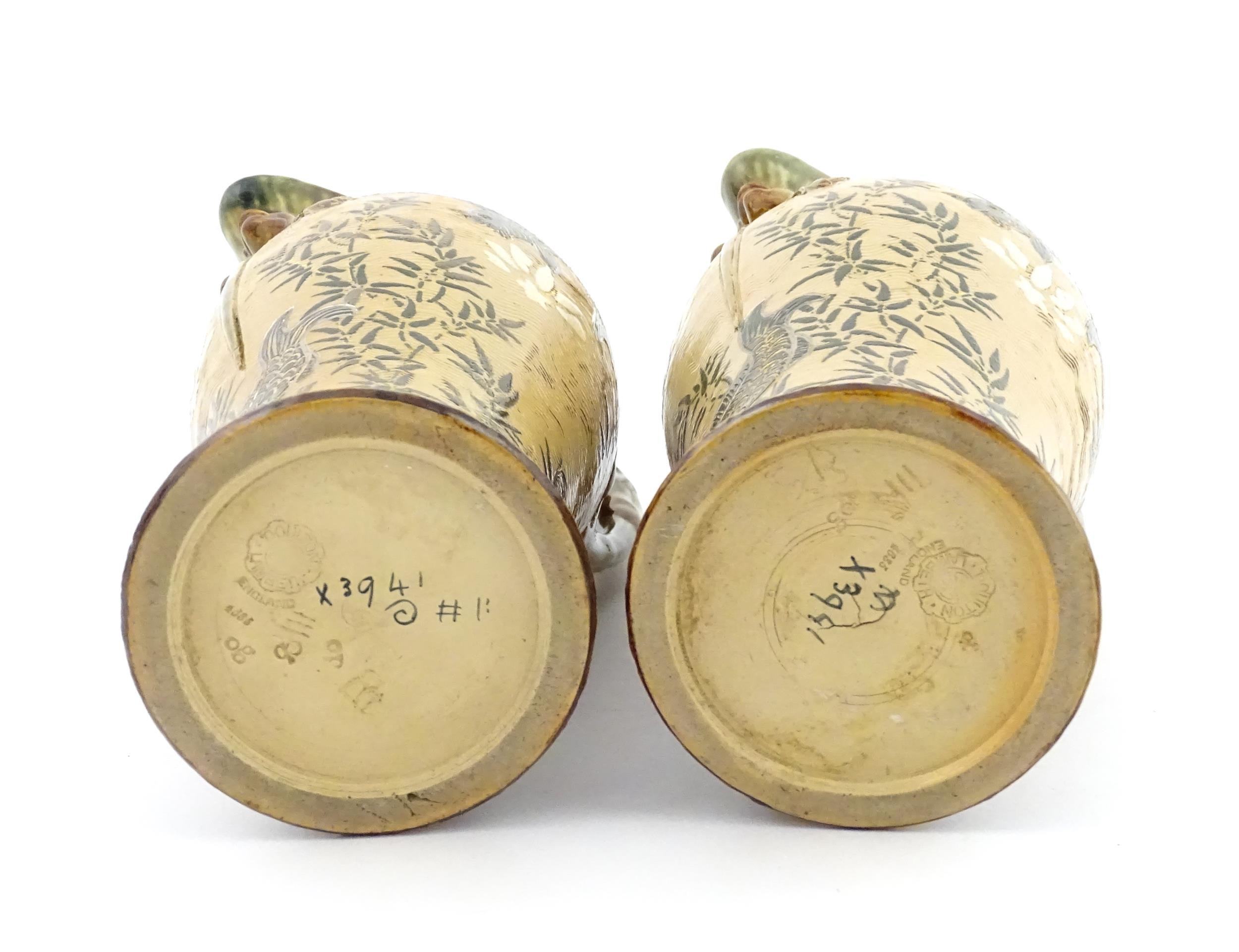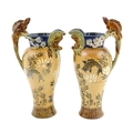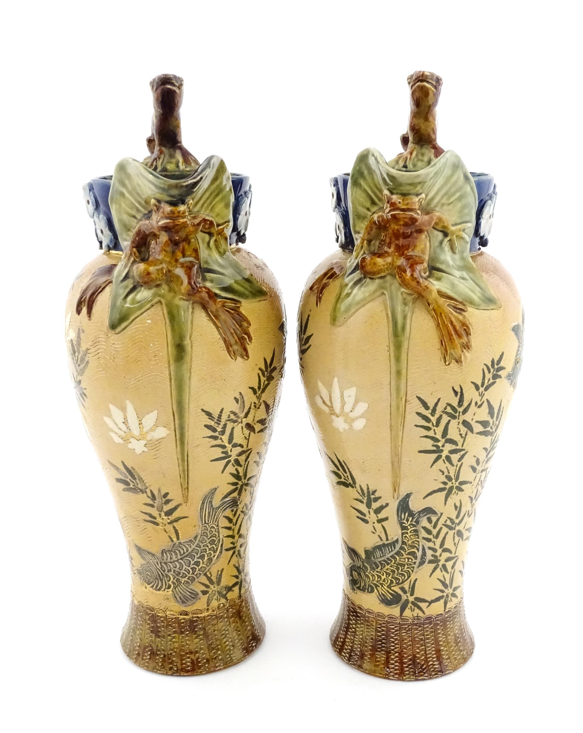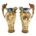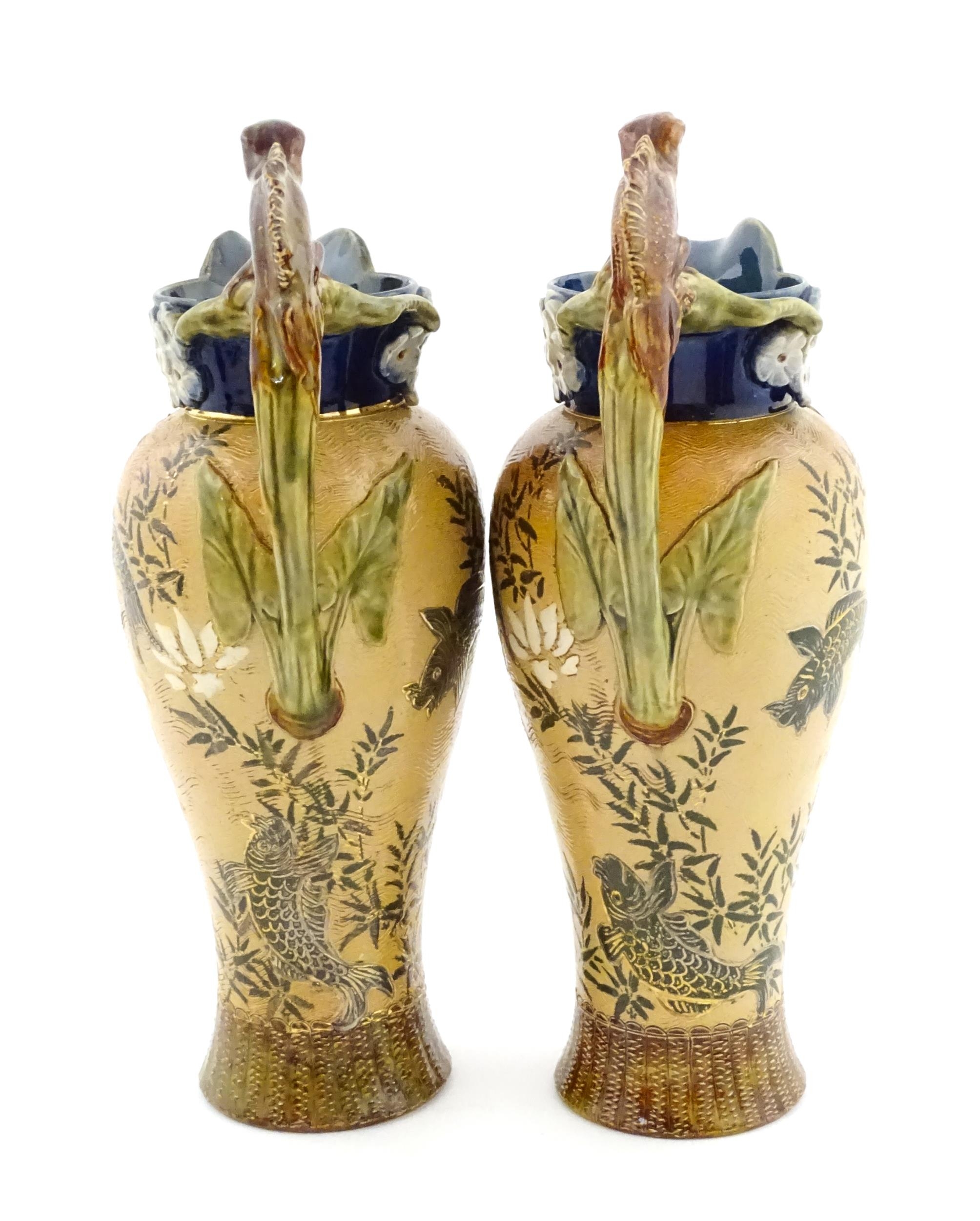 A pair of Doulton Lambeth stoneware grotesque ewers / pitchers, the bodies decorated with carp fish swimming amongst reeds, the spout moulded as a leaf with central frog / toad, with floral detail to neck, the handle surmounted by a lizard. Marked under, numbered 4635, X3941. In the manner of Mark V. Marshall. Approx. 13 1/2" high (2)