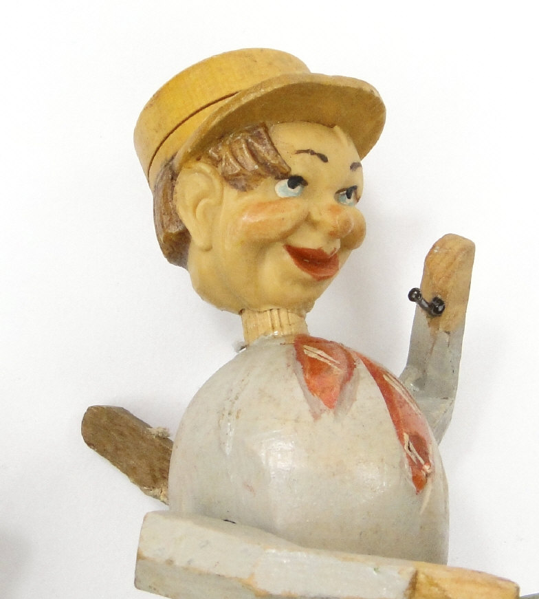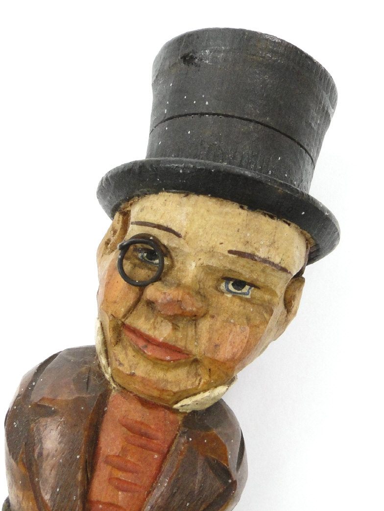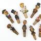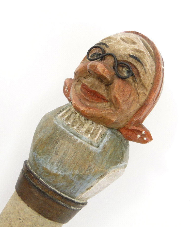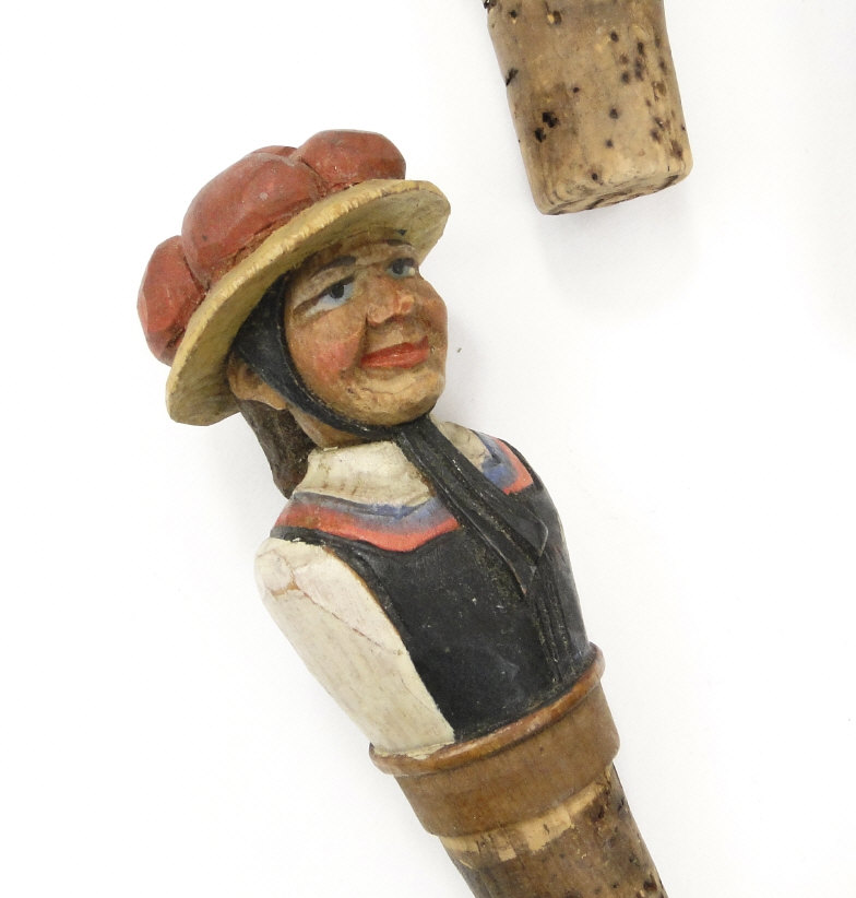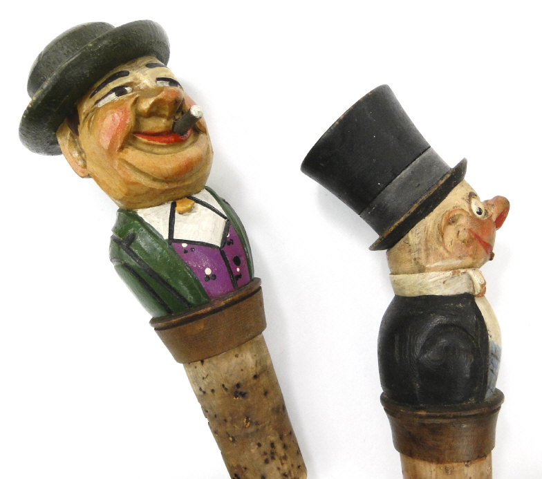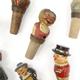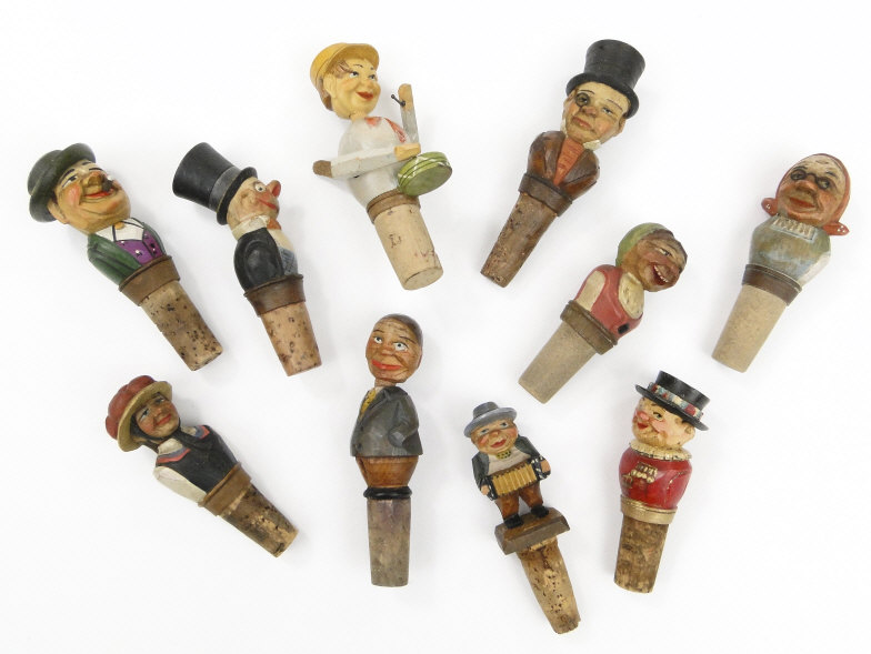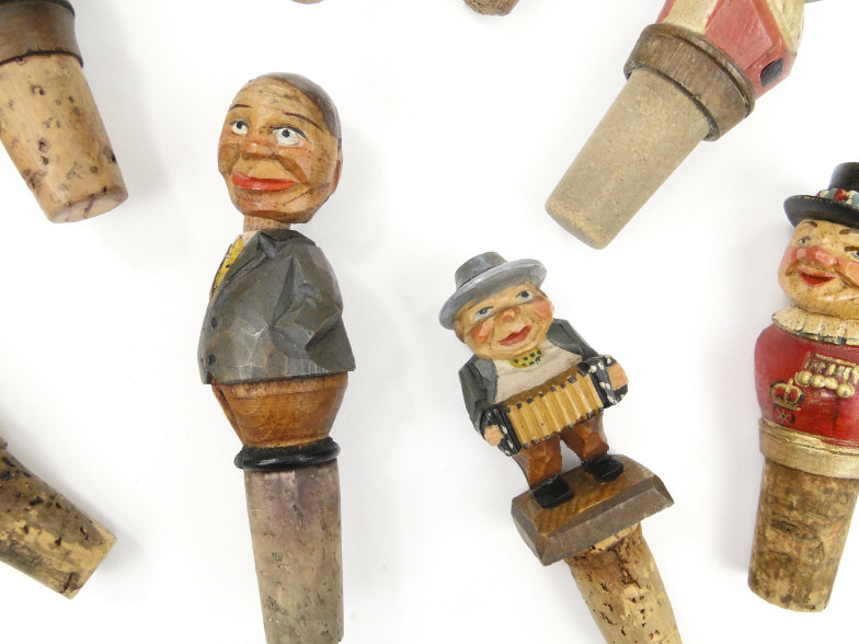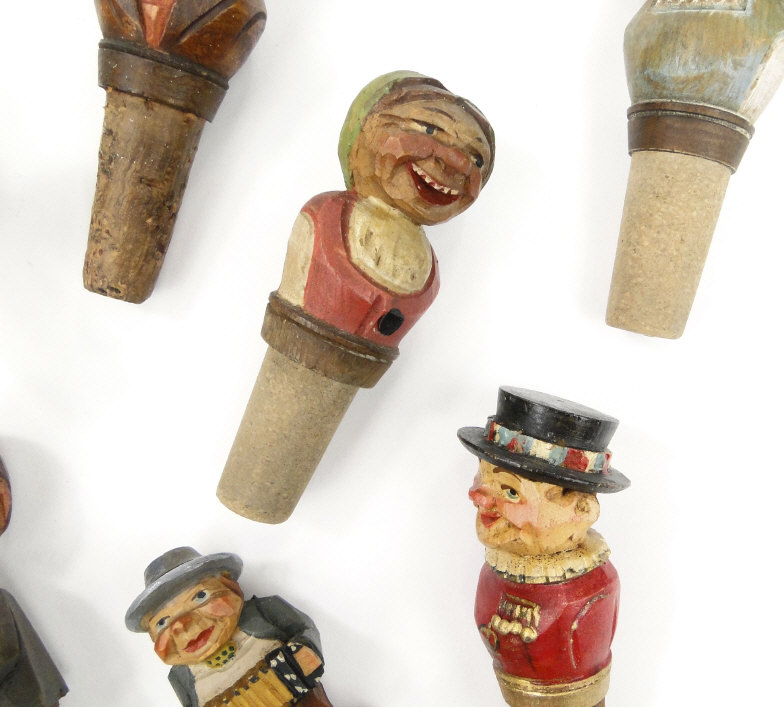 Ten carved and painted Continental wood figural bottle stoppers, each approximately 10cm high