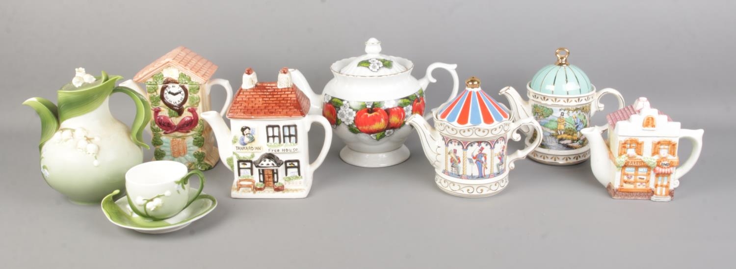 A collection of mainly novelty ceramic teapots, to include two Sadler examples 'Sporting Scenes from the 18th Century, Fishing' and 'Edwardian Entertainments, Band Stand' and Graff Porcelain.