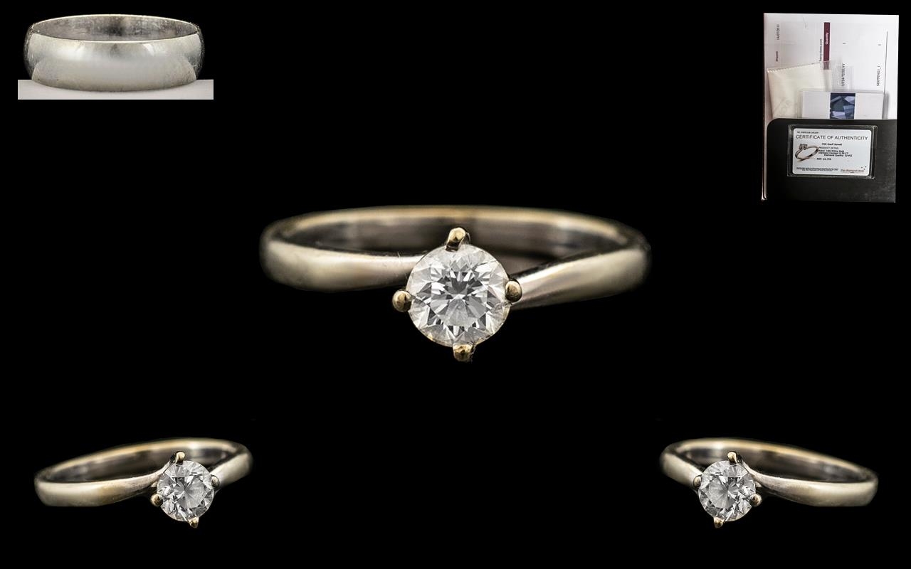 18ct Single Stone Diamond Ring round modern cut diamond in a 4 claw setting together with IGI diamond certificate report stating carat weight to be 0.50 carat, G colour VS2 Clarity, diamond measurement 4.88 x 4.90 x 3.23 mm. Together with a 9ct gold wedding band. Complete with all paperwork and certificate of authenticity.