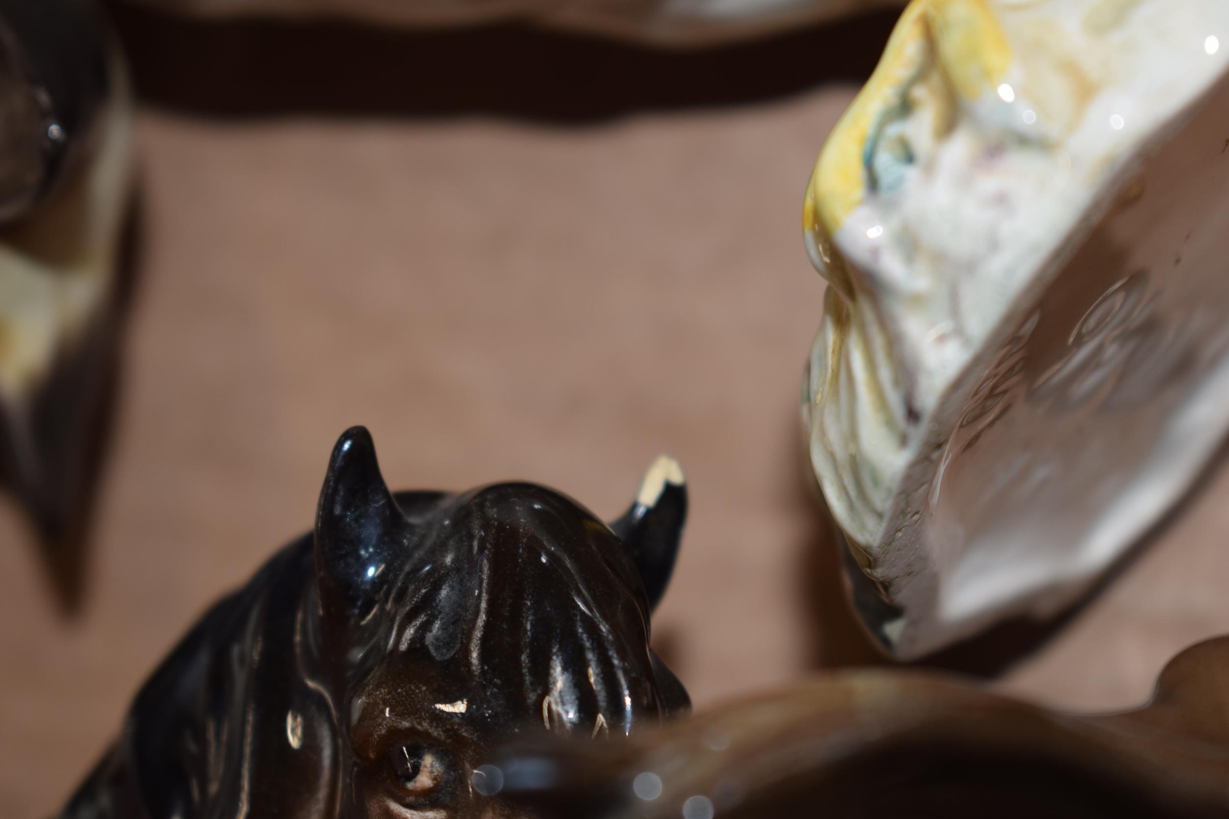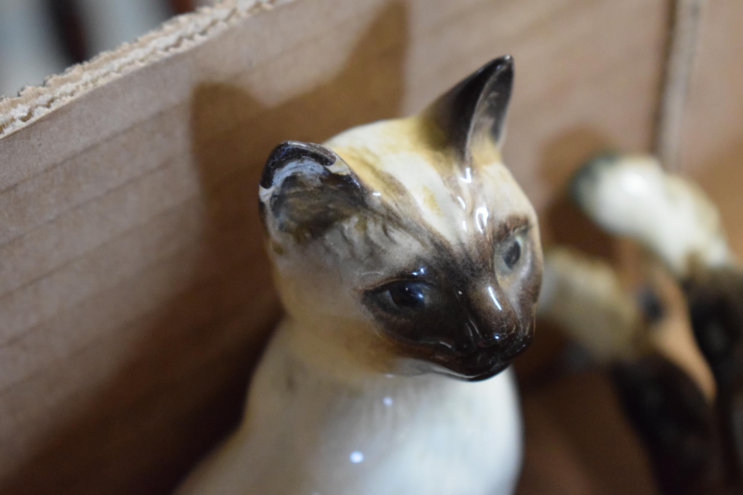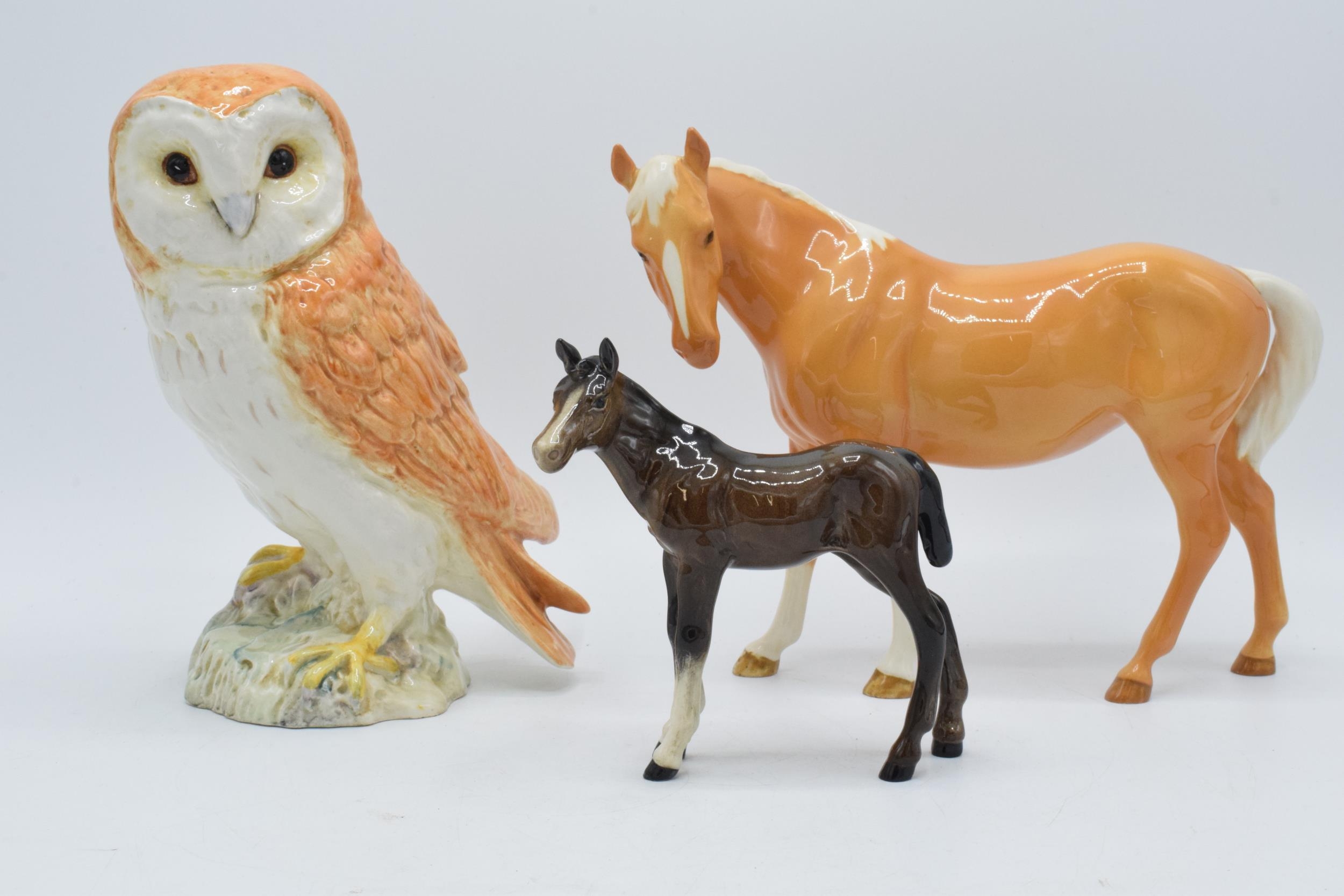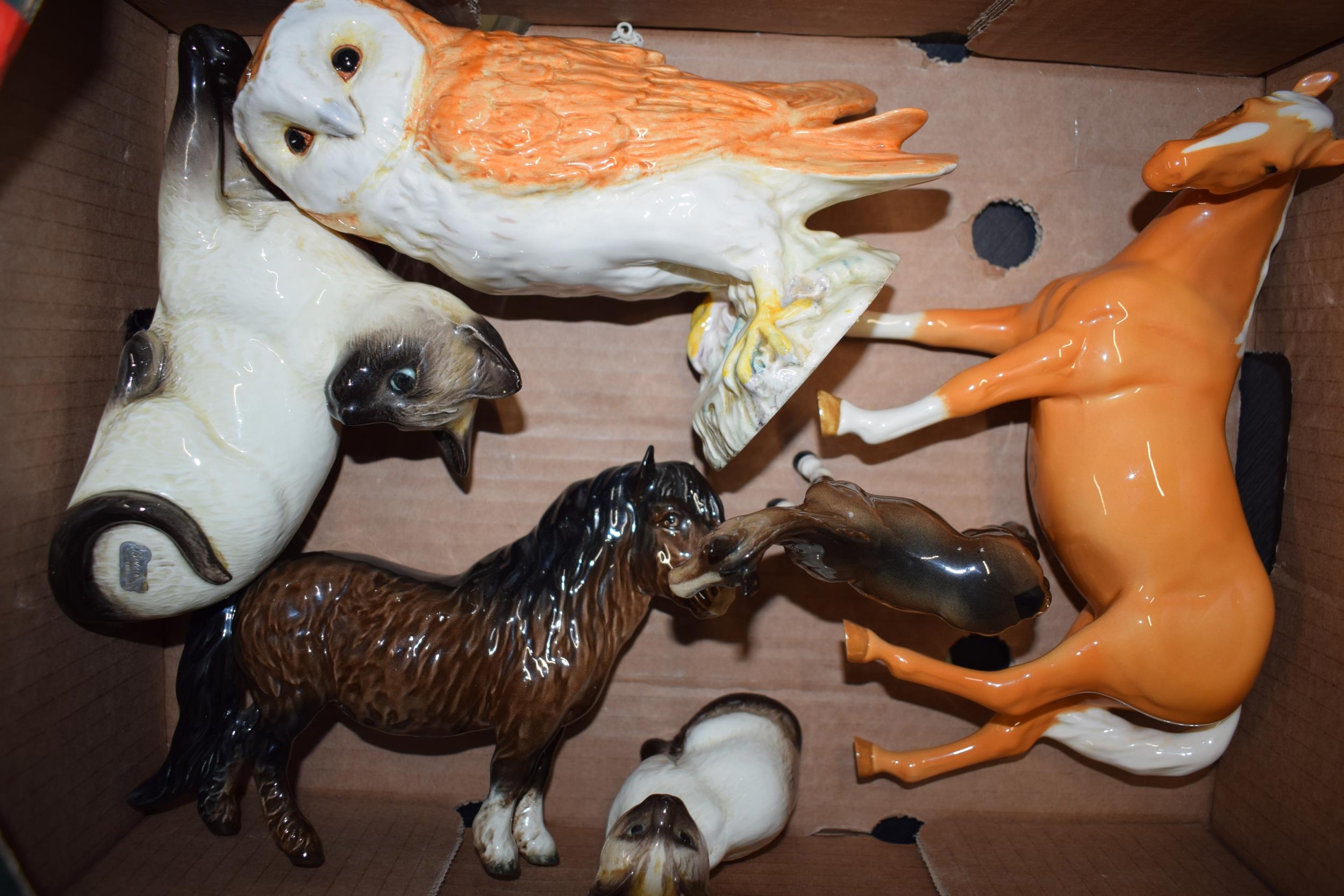 Beswick palomino mare facing left 976, barn owl 1046, a Siamese cat 1558 and a brown foal together with damaged Siamese cat and Shetland (6).