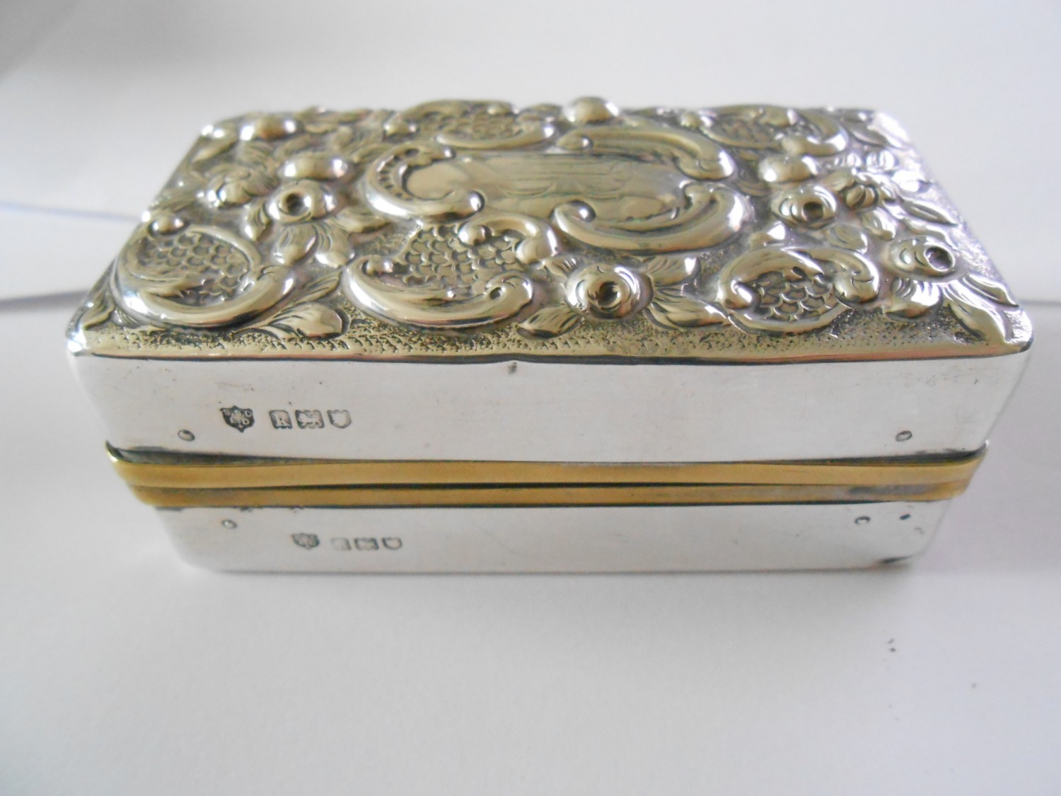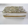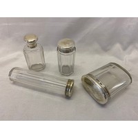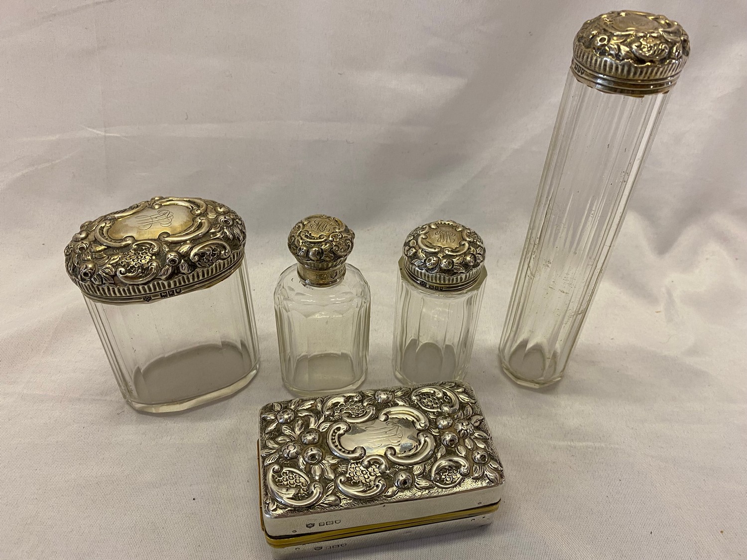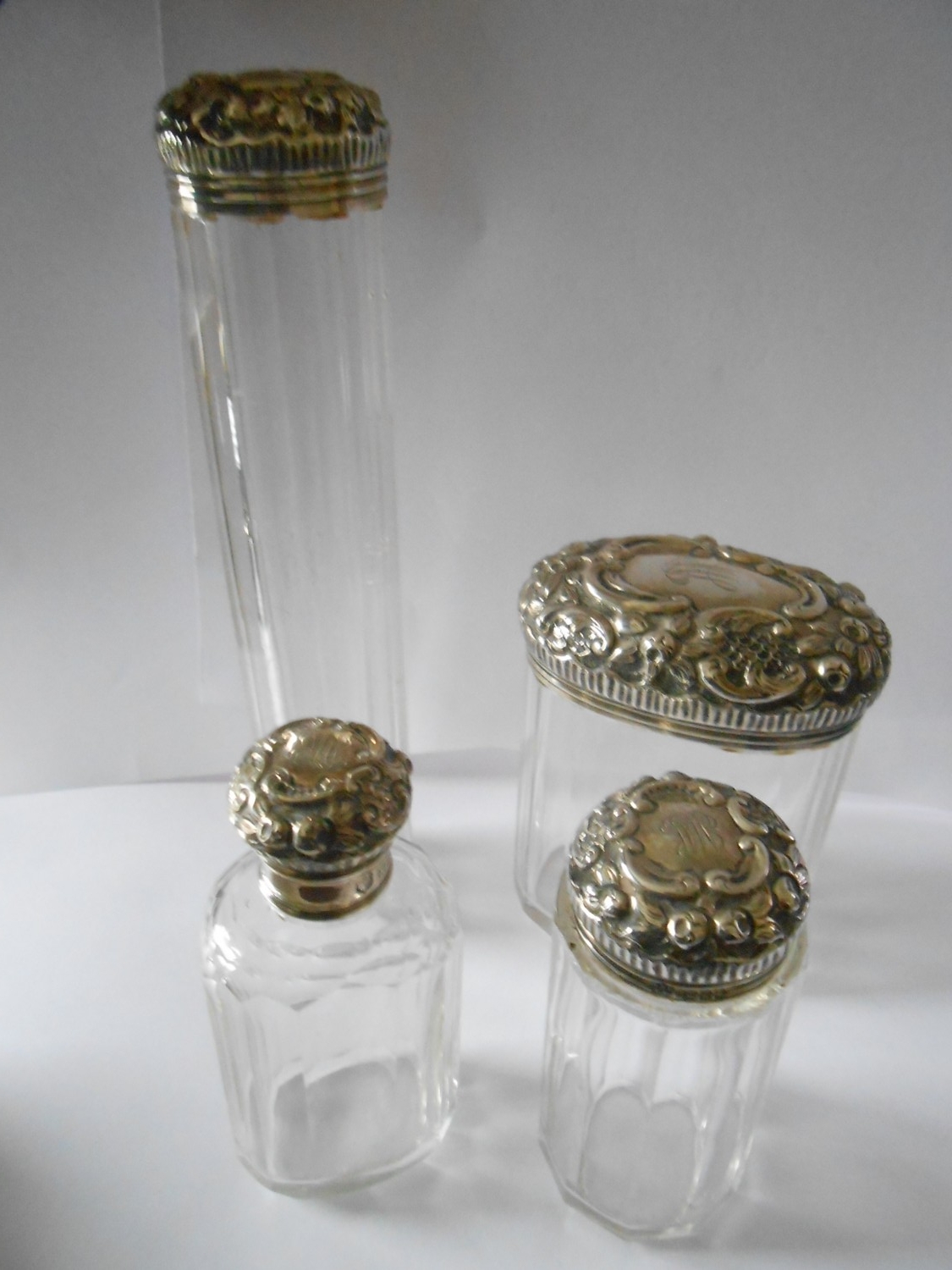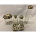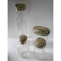 Four glass toilet bottles with repousse decorated silver lids and a matching rectangular silver covered travelling spirit burner - London 1904 and 1905, makers marks for Drew & Sons