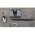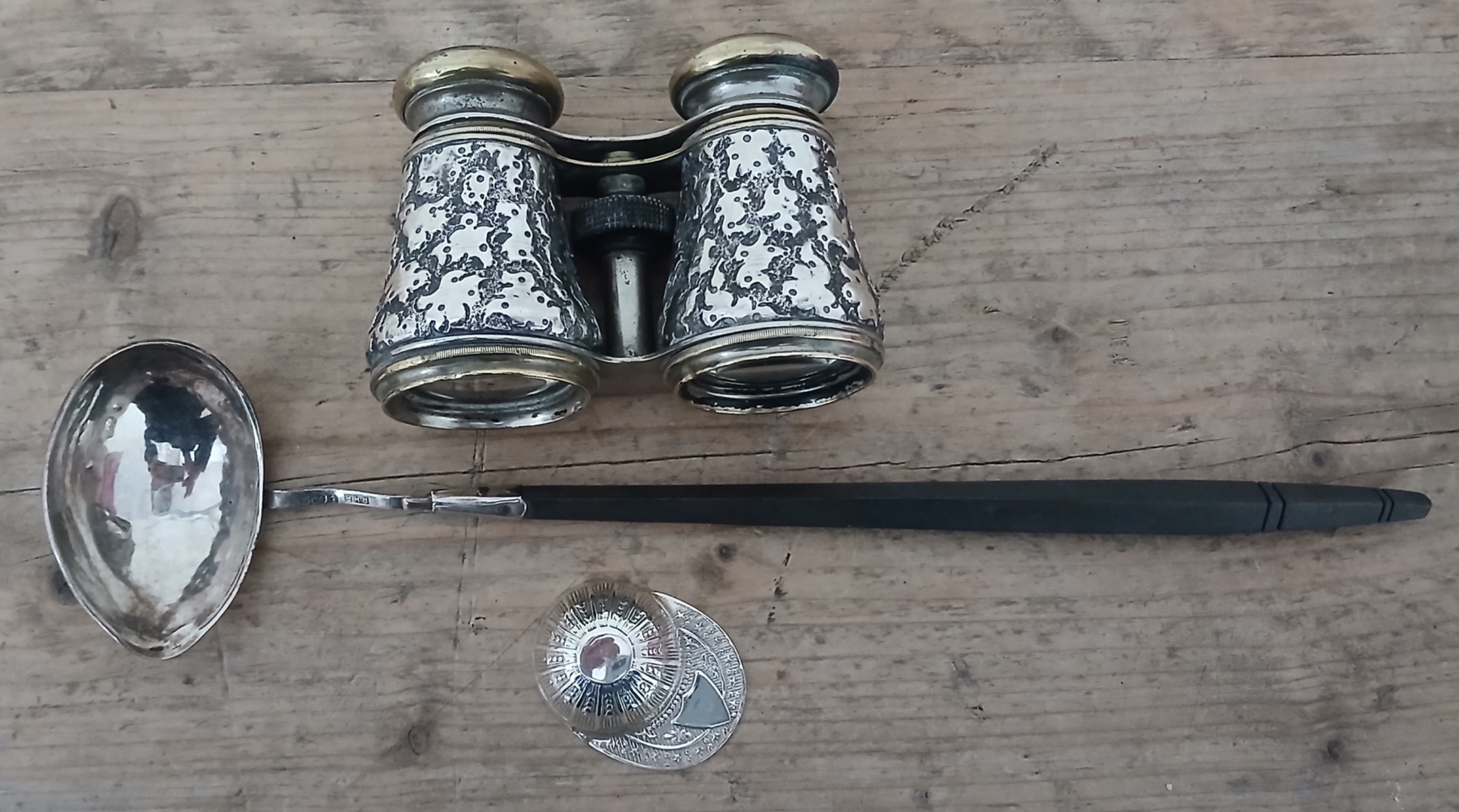 A mixed lot comprising an Elizabeth II silver punch ladle with wood handle, Ray Harvey Foster, Birmingham 1990, length 32cm, a pair of hallmarked silver mounted opera glasses and a novelty caddy spoon modelled as a jockey's cap and marked '925'.