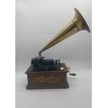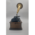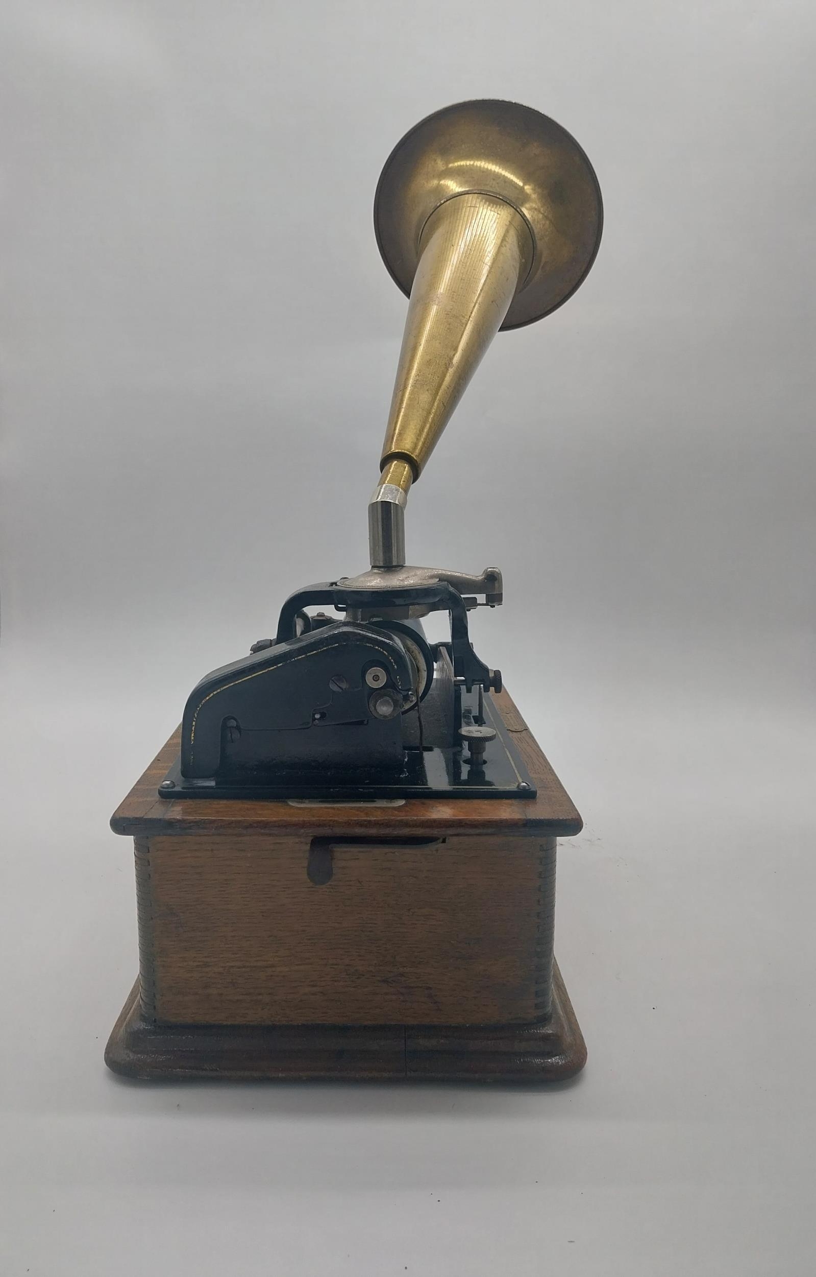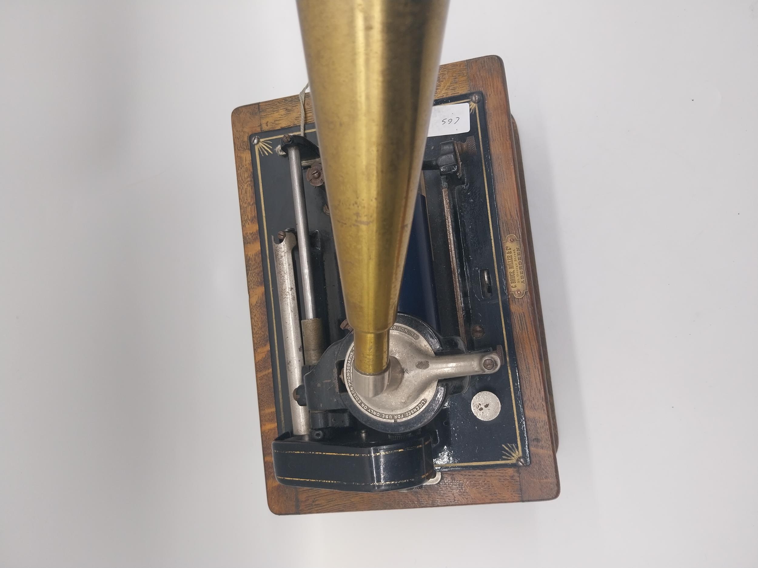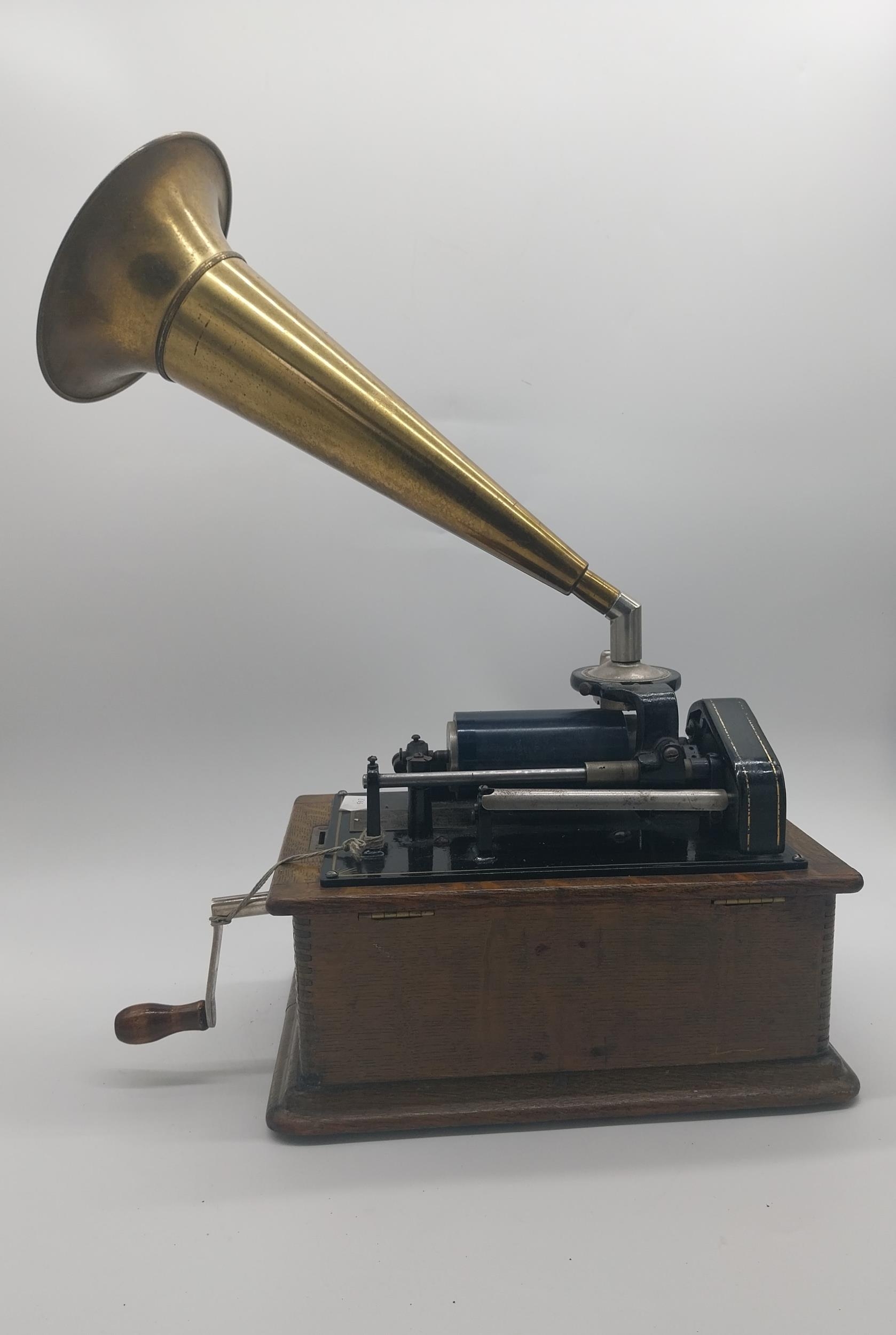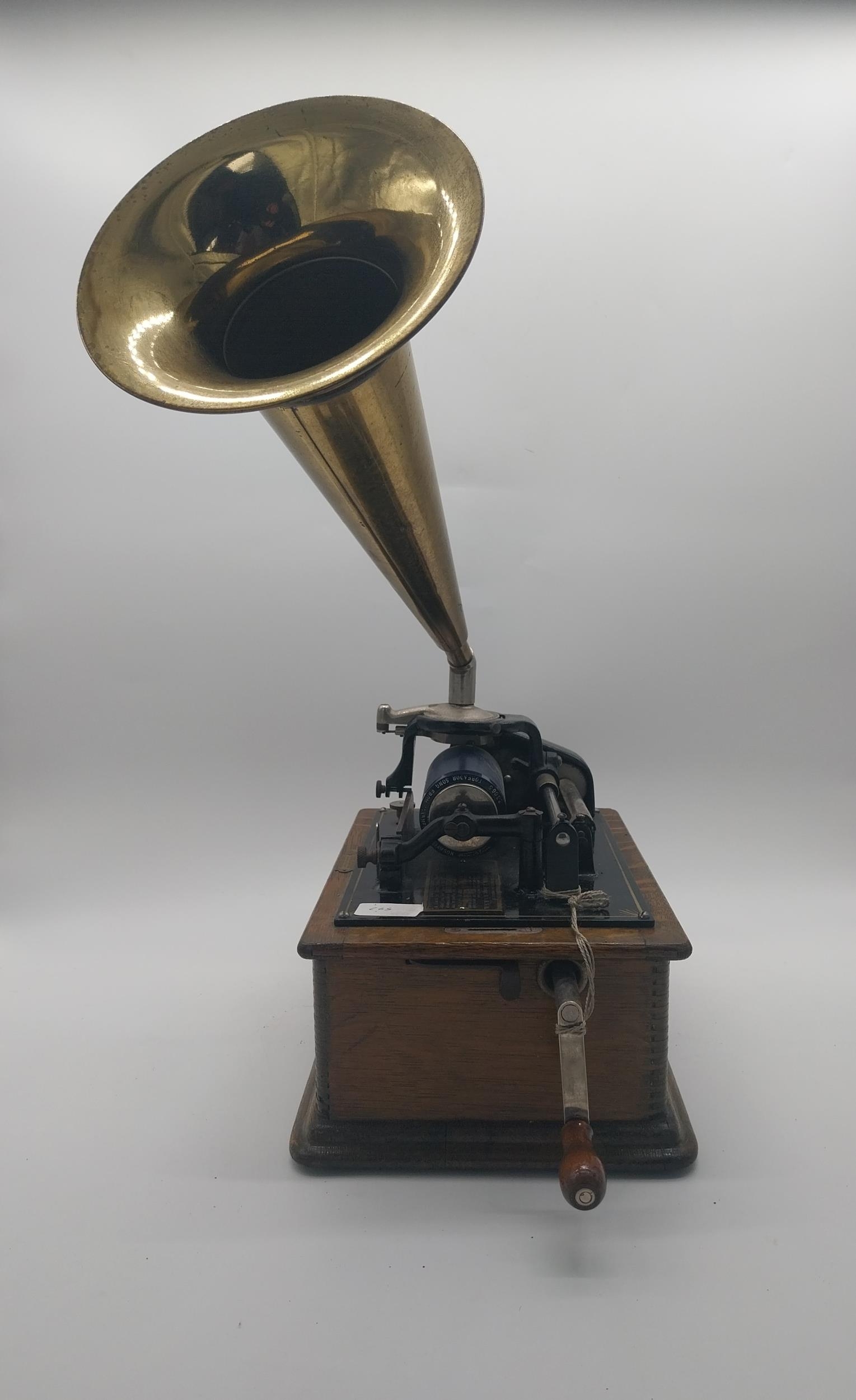 Early 20th C. Edison standard phonograph in oak case with brass horn {55 cm H x 43 cm W x 32 cm D}.
