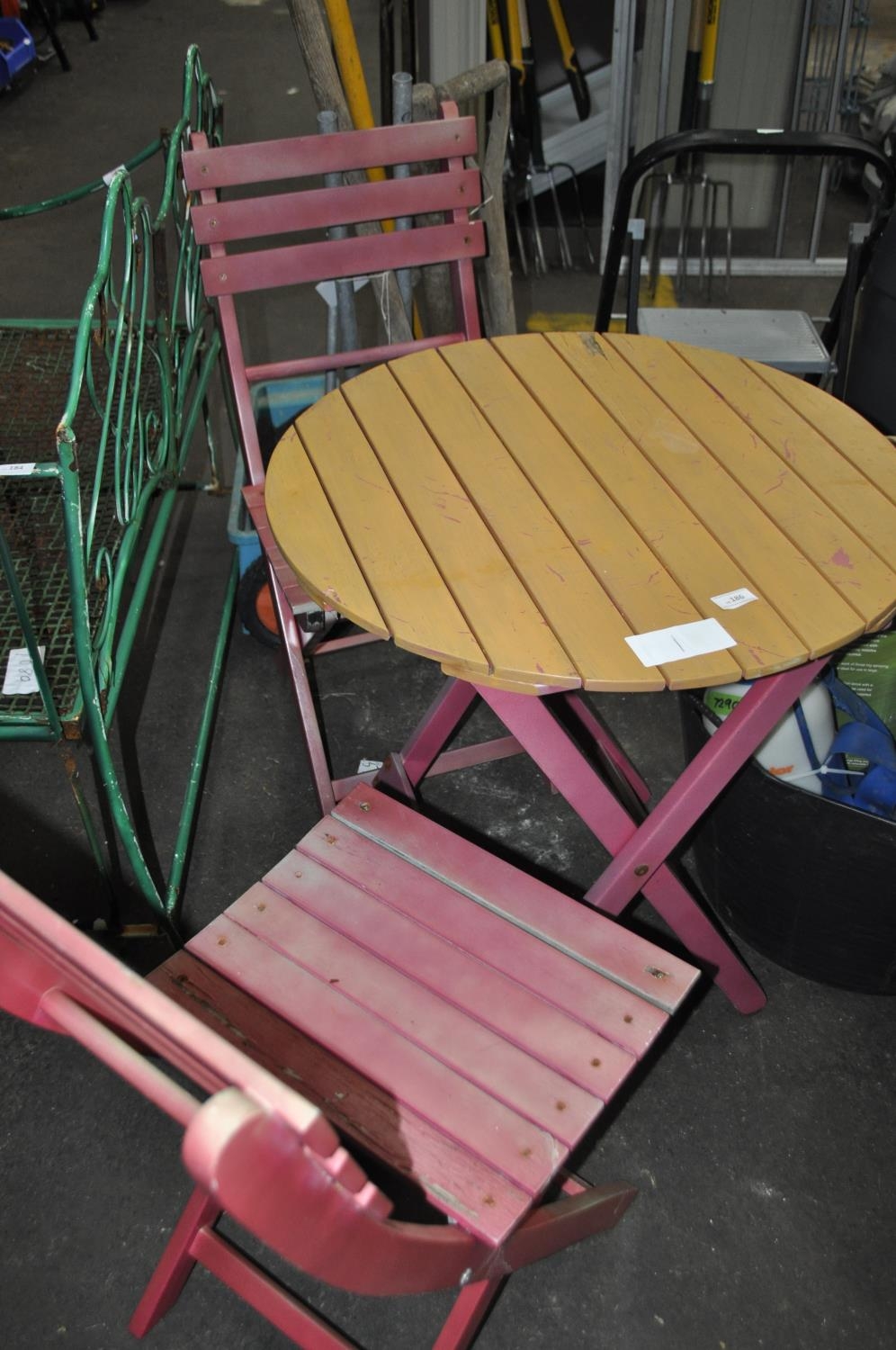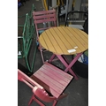 EXTERNAL CIRCULAR GARDEN TABLE AND TWO MATCHING WOODEN CHAIRS`