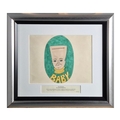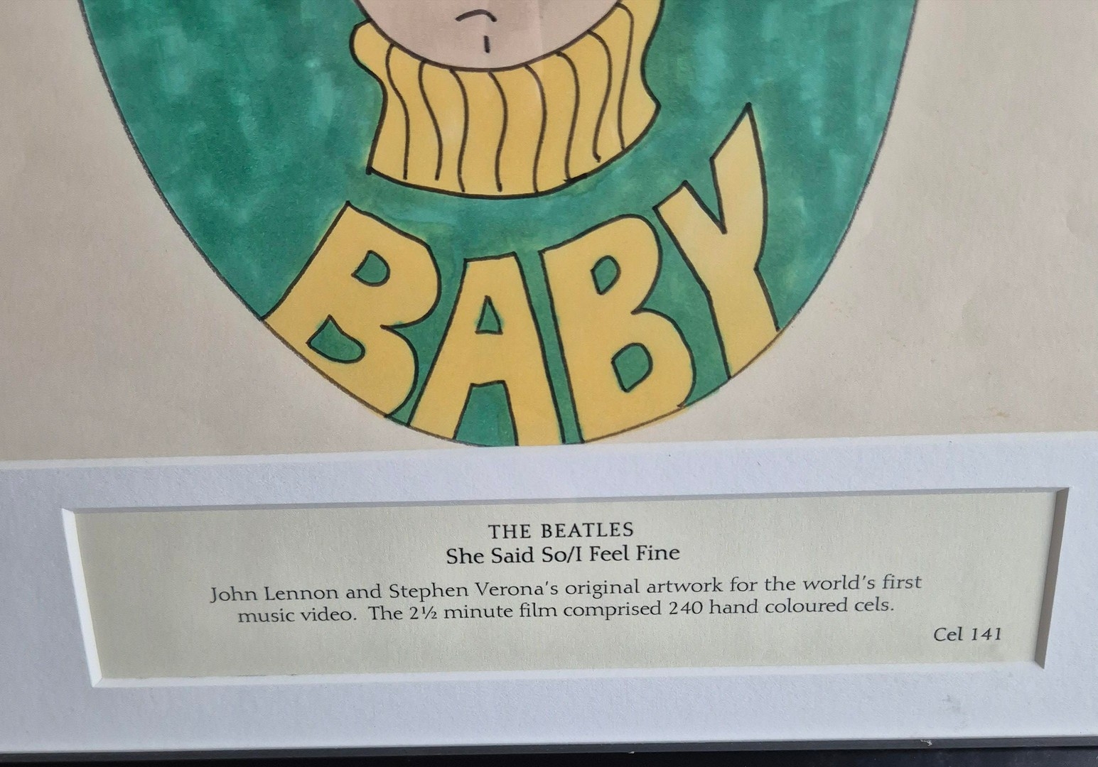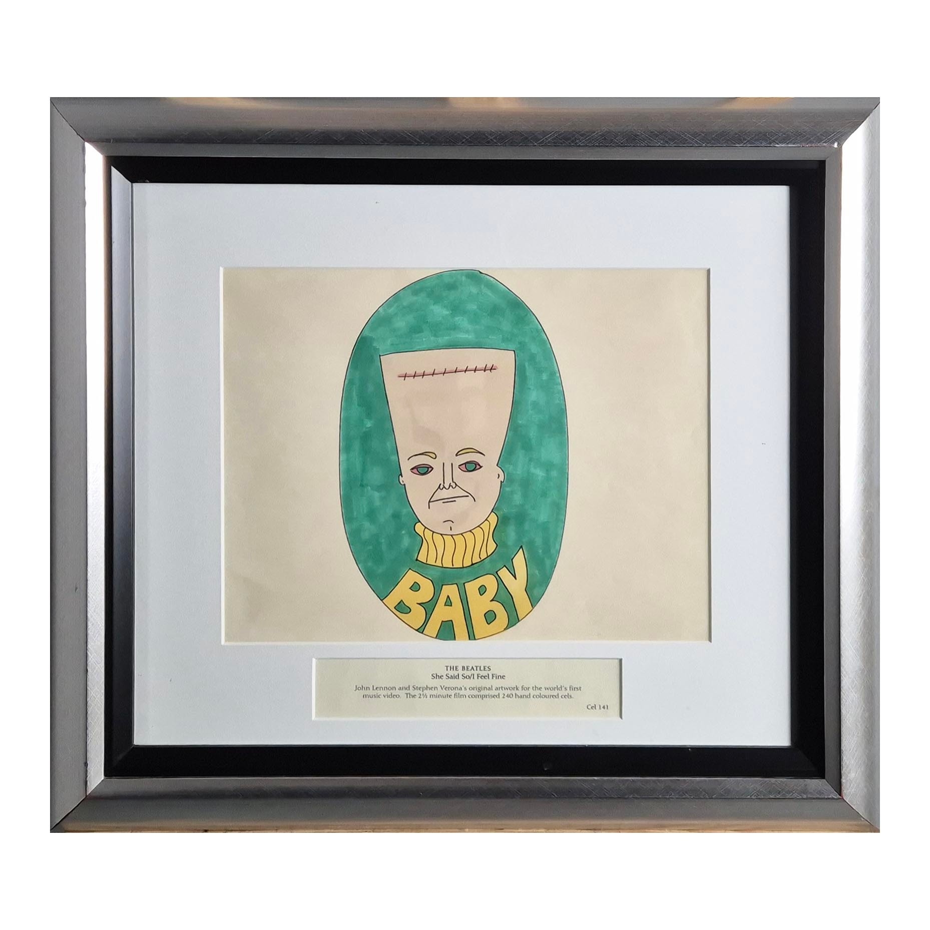 JOHN LENNON, STEPHEN VERONA. 'SHE SAID SO' / 'I FEEL FINE', CEL 141 ORIGINAL ARTWORK. An original drawing by Steven Verona and John Lennon used in The Beatles' music video SHE SAID SO. The 2 1/2 minute film is comprised of 240 hand-coloured pop cartoon images. With a printed caption below with the title and cel number. Framed, 54cm x 48cm.