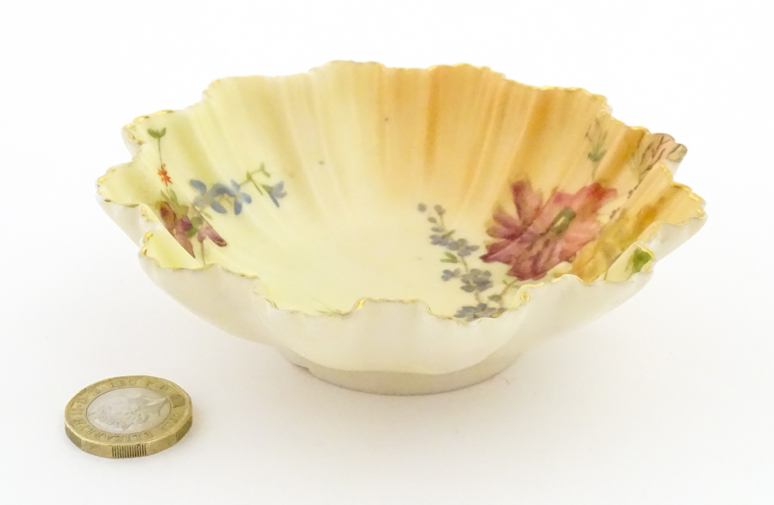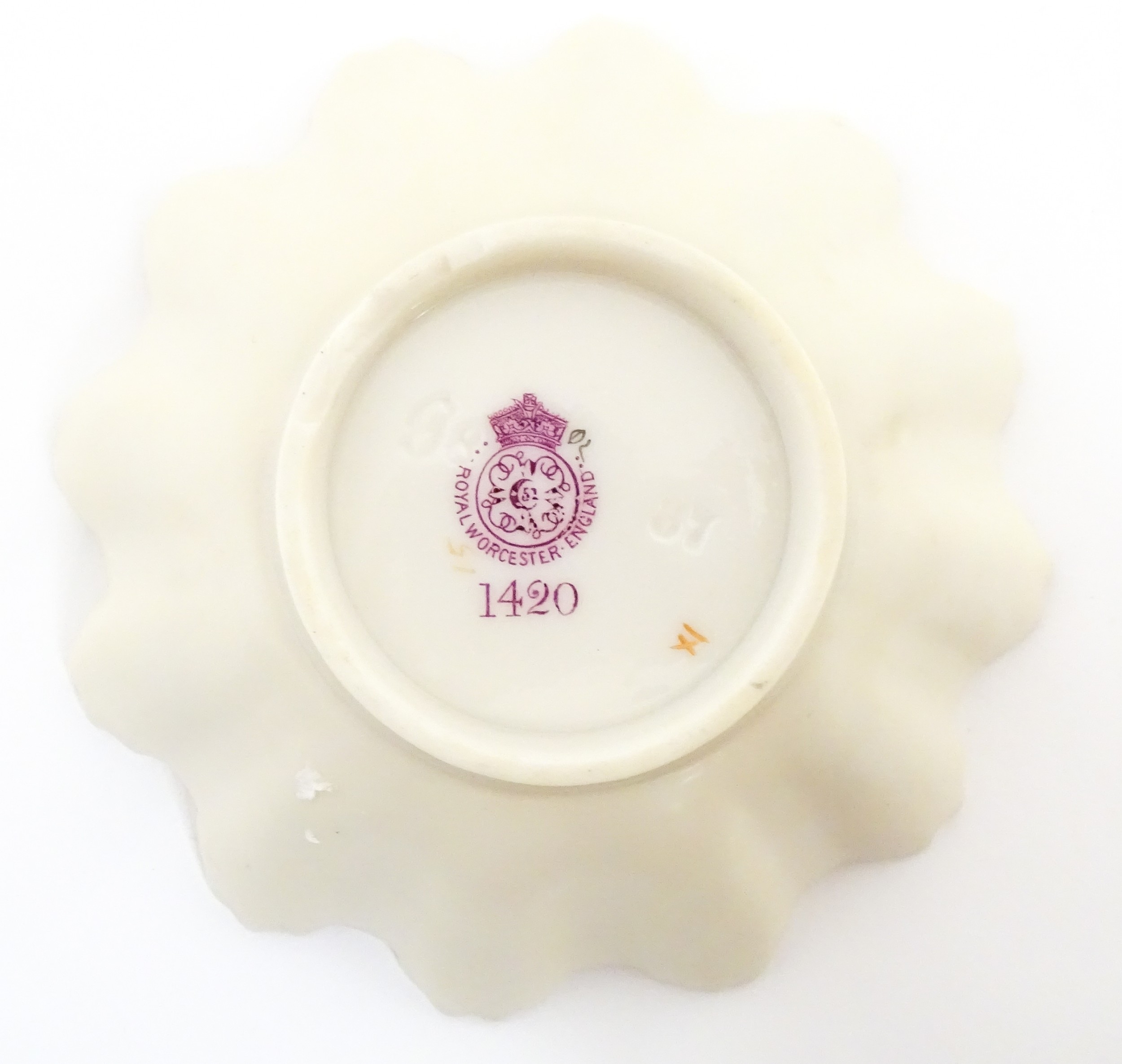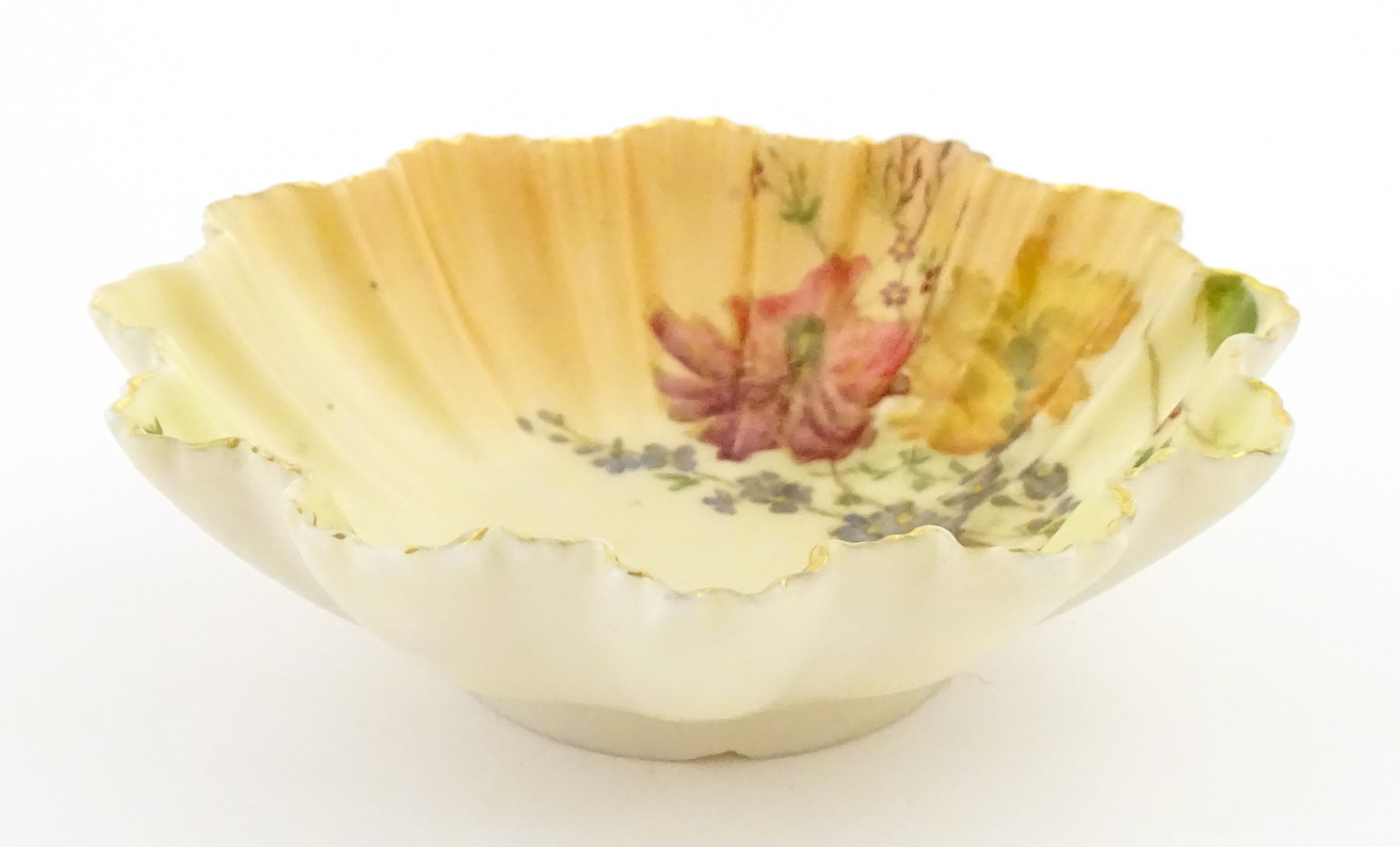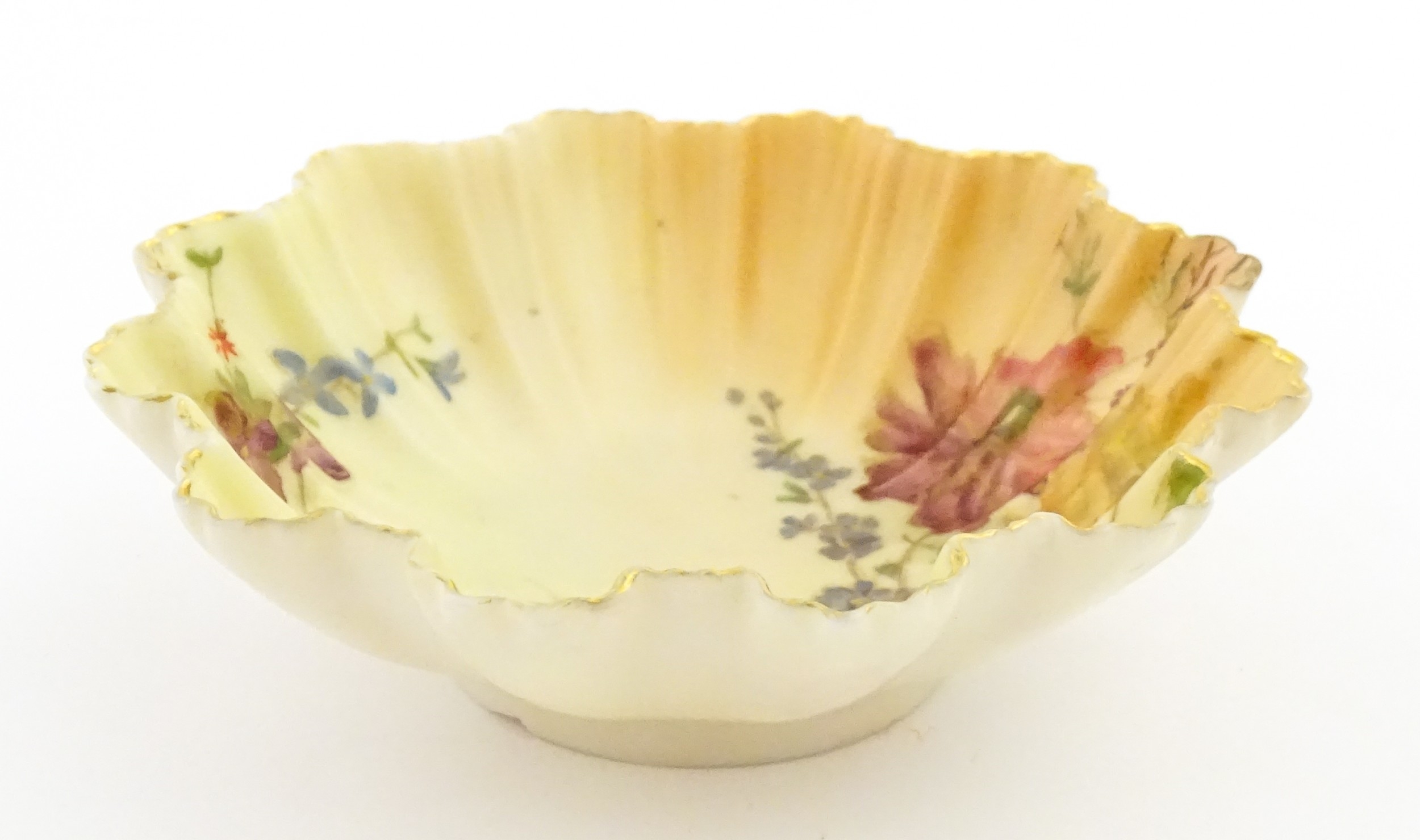 A Royal Worcester blush ivory dish of frilled shell form decorated with flowers. Marked under and numbered 1420. Approx. 4 3/4" wide