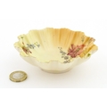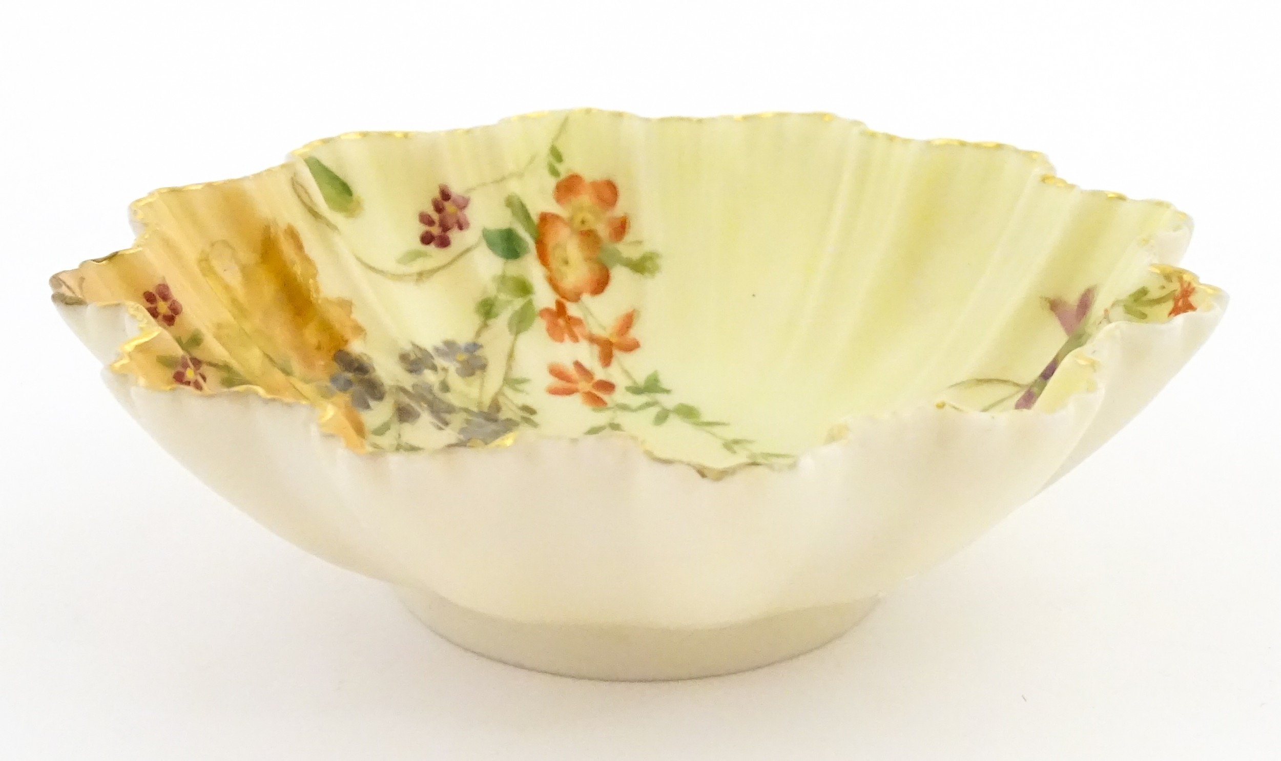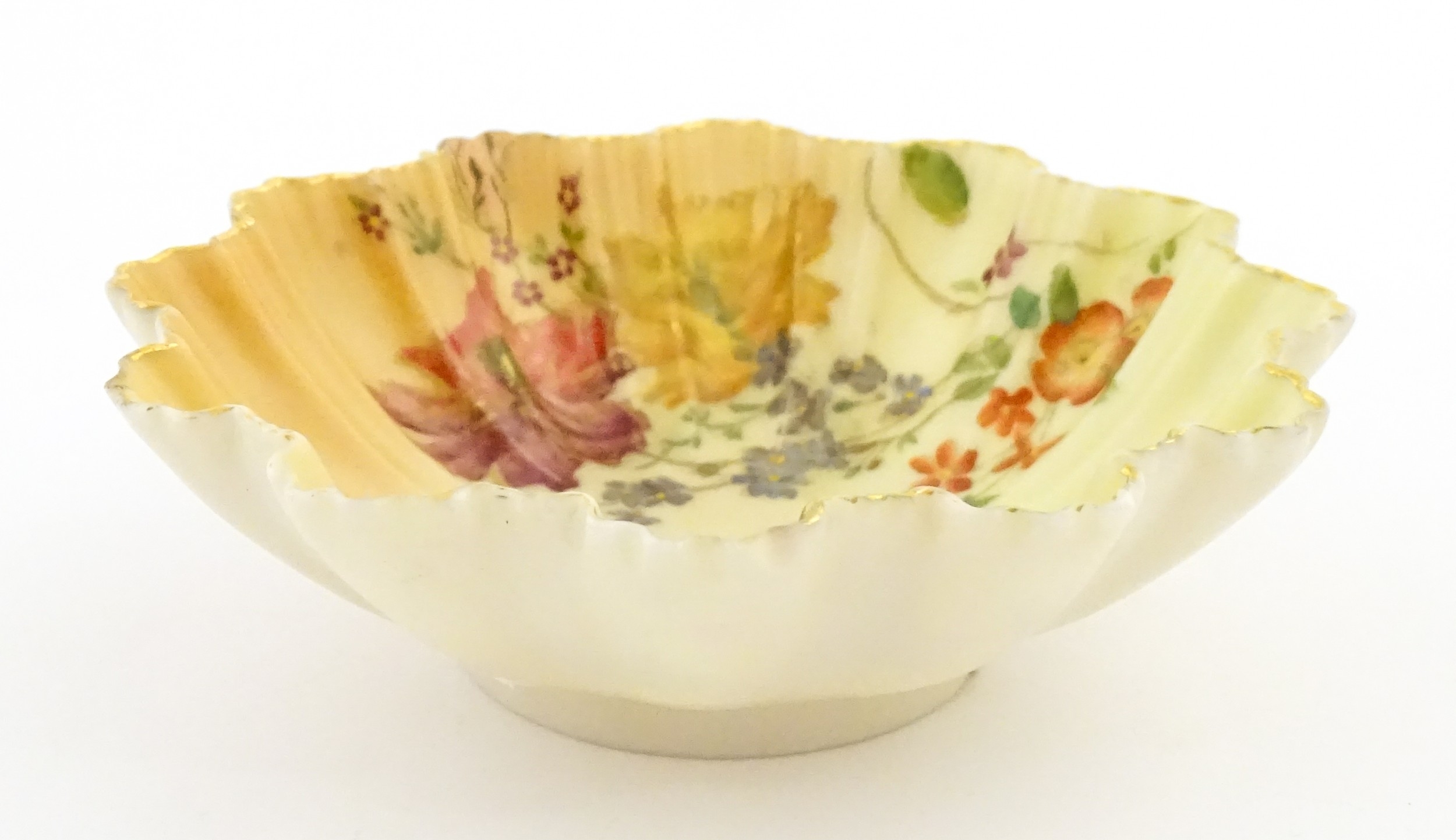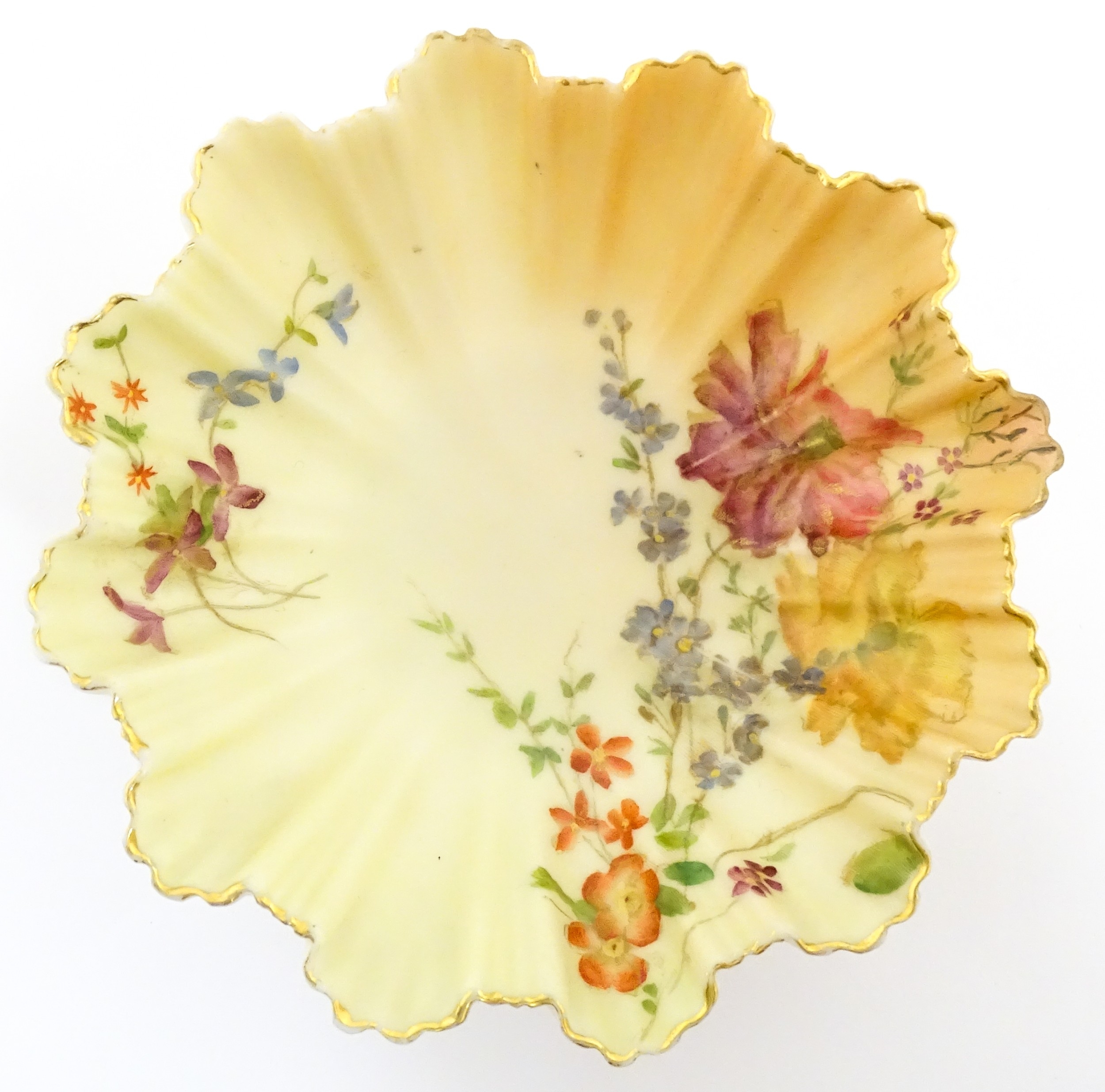 A Royal Worcester blush ivory dish of frilled shell form decorated with flowers. Marked under and numbered 1420. Approx. 4 3/4" wide