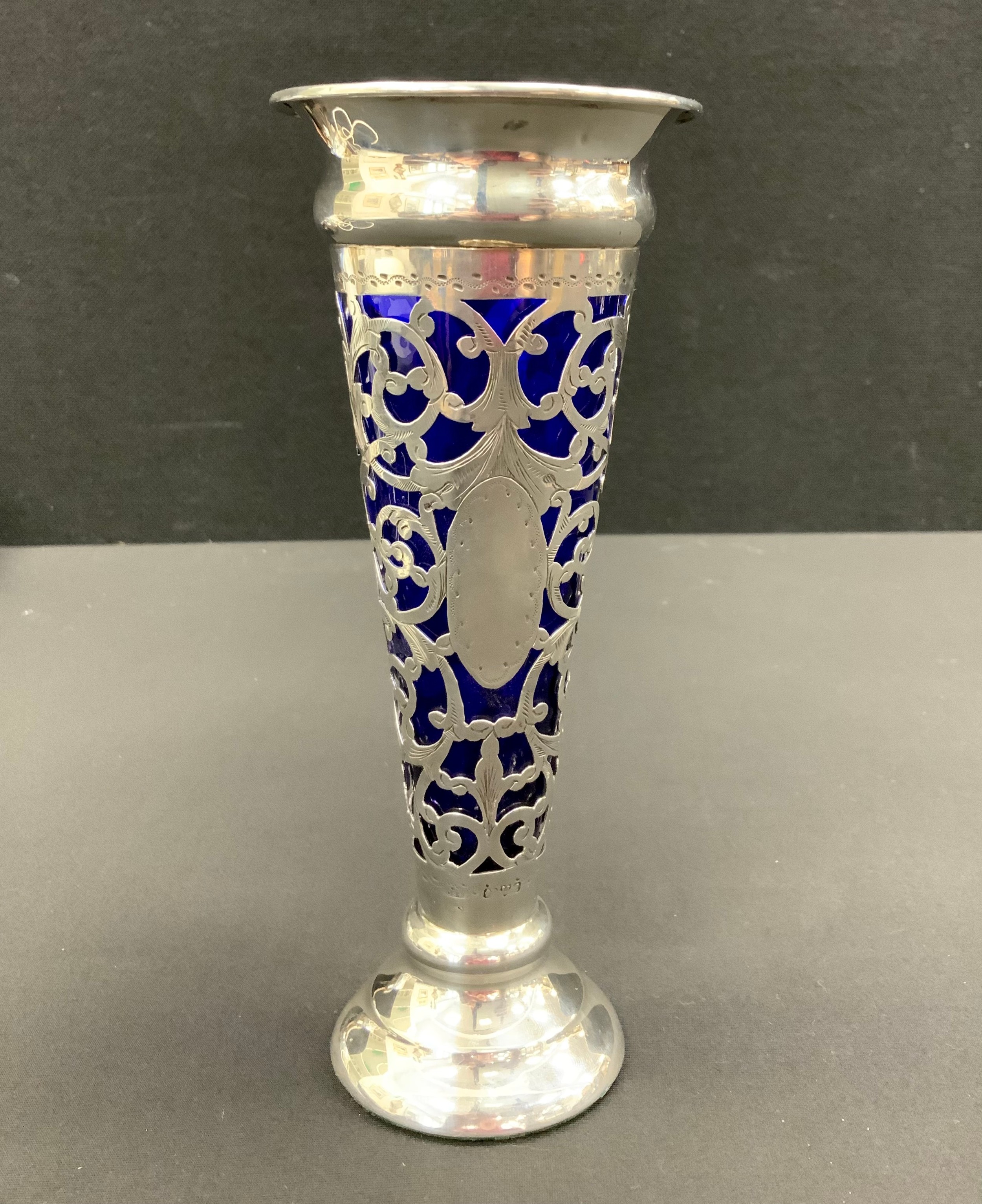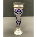 An Edwardian silver and blue glass trumpet form bud vase, pierced scrolling body, stepped foot, 18cm high, Chester 1904, weighted base, 233g gross