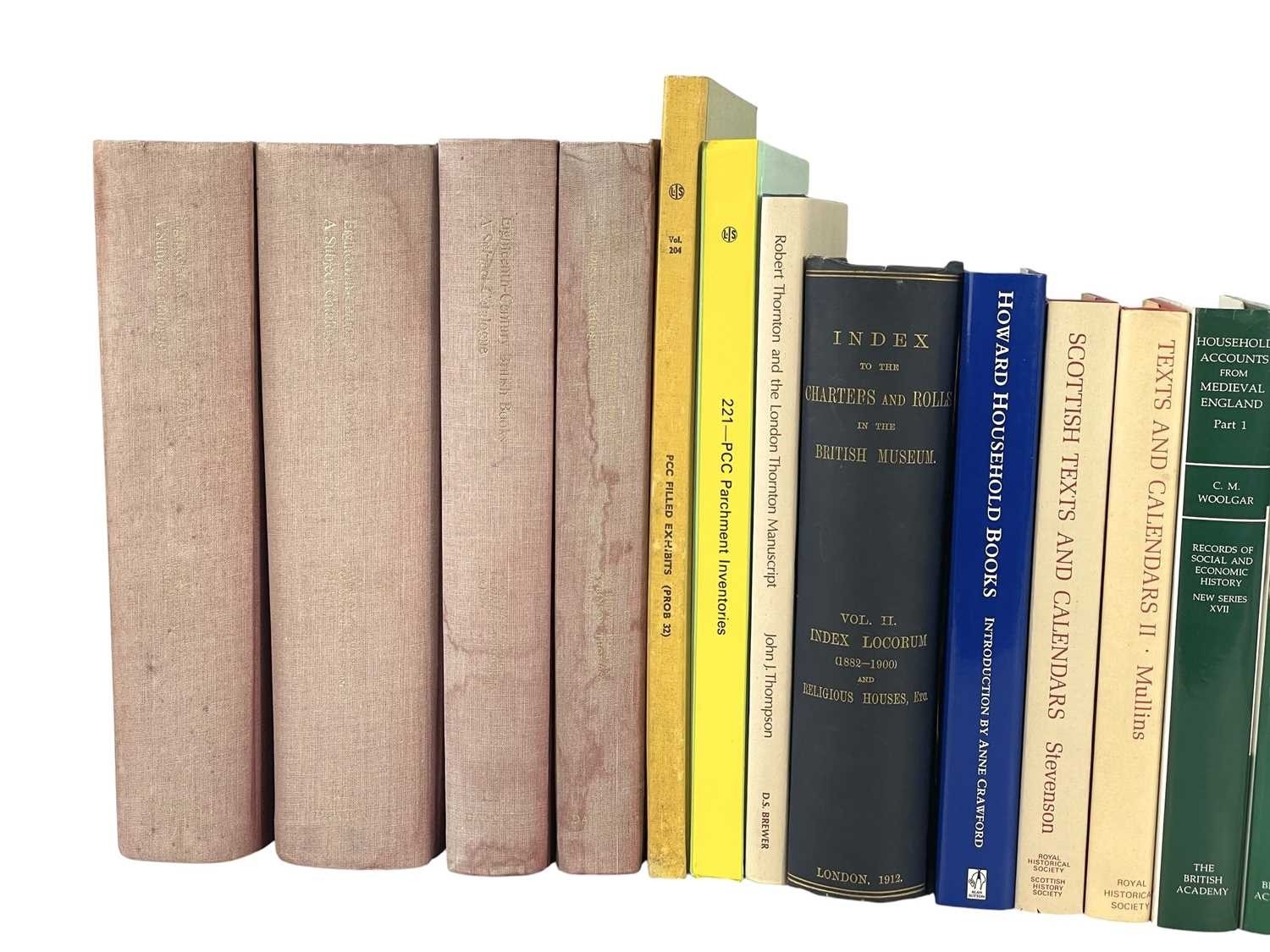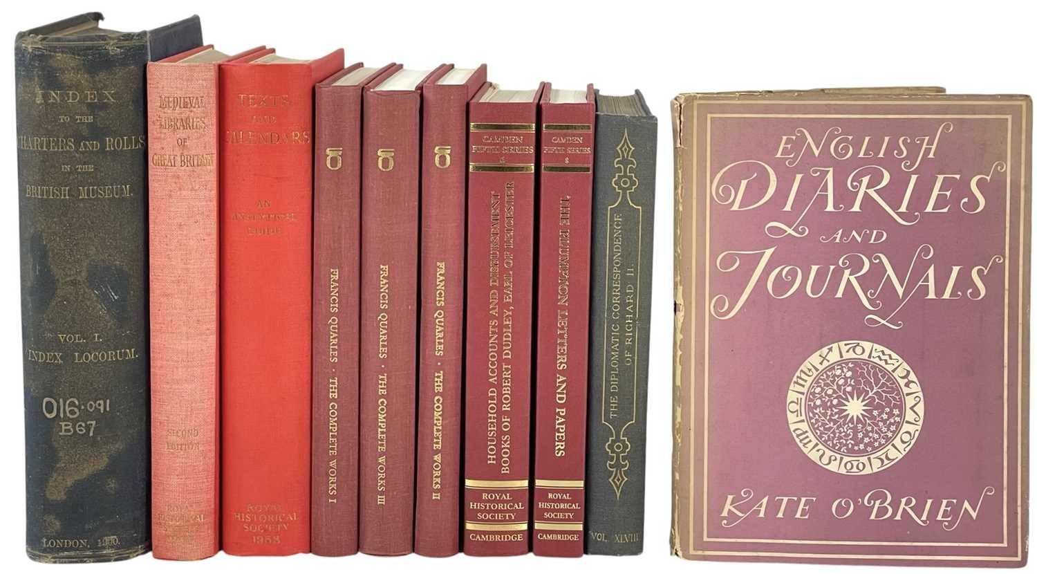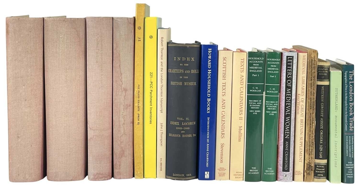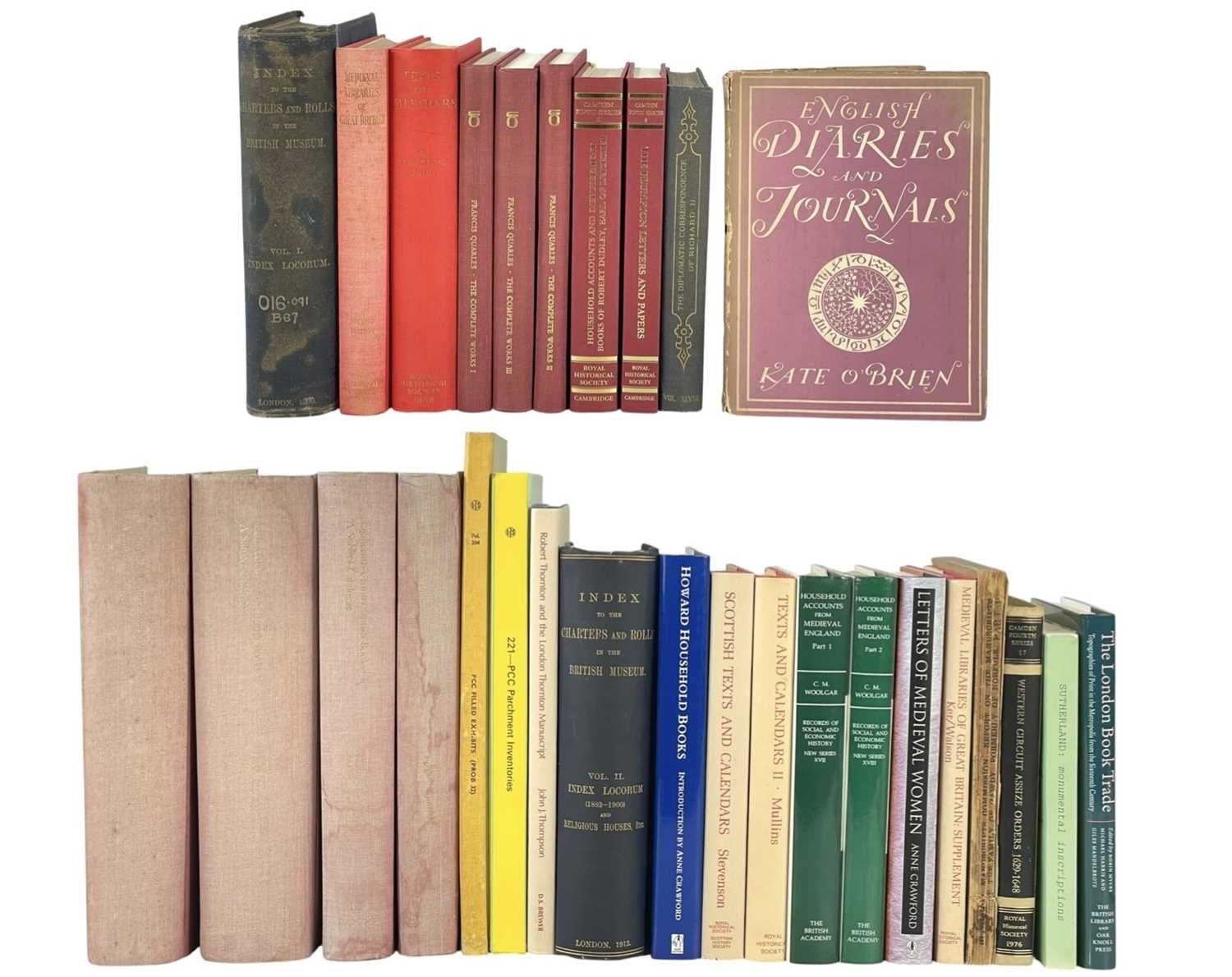 (Art of the Book) Twenty-nine works Including four volumes of G. Averley et al, 'British Museums General Catalogue of Printed Books', Dawson & Sons, 1979, with red spines and taupe cloth cover, tide marks to covers, with spotting to edge, otherwise textblock vg; Kate O'Brien, 'Diaries and Journals', William Collins of London, 1943; Anne Crawford, 'Letters of Medieval Women', Sutton Publishing, 2002; Edouard Perroy, 'The Diplomatic Correspondence of Richard II', Office of the Society, London 1933, with fold-out maps; together with other works on the London book trade, medieval libraries, Calendars and household accounts, all good/vg. (29)