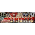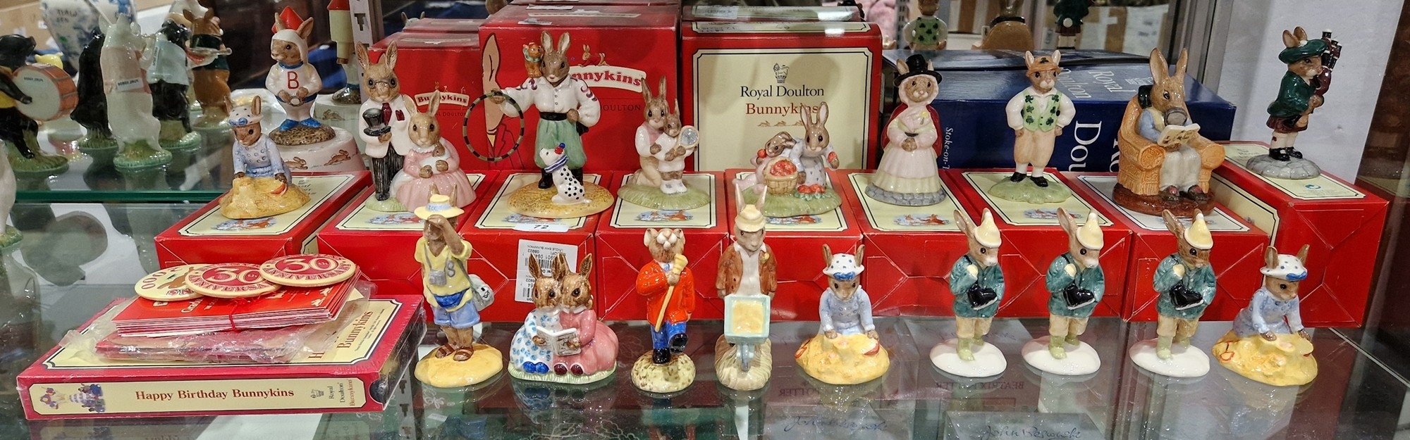 Collection of Royal Doulton Bunnykins figures, some boxed, including Seaside Bunnykins, Family Photograph signed in gilding, Tino the Trix Star, Tennis Bunnykins, Strawberry Irishmen Collector, Seaside, Gardener, Drum Major, Storytime and others, with three badges, various certificates and a Happy Birthday Bunnykins