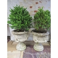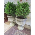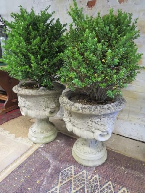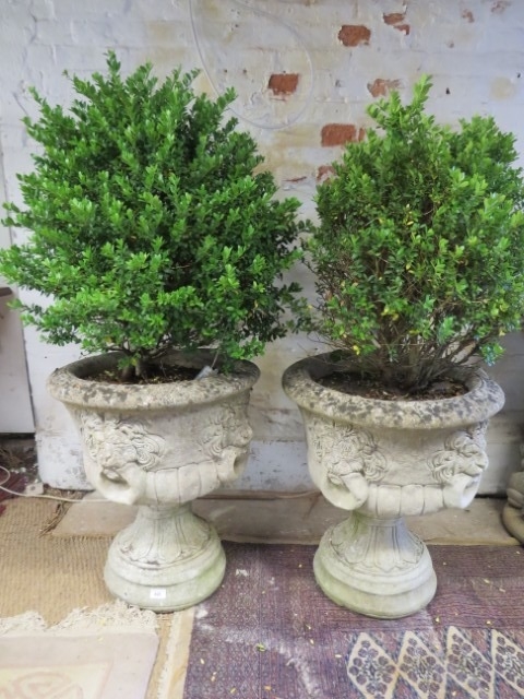 A pair of reconstituted stone lion mask planters, each containing live Ball Box trees (pair). Planters H62cm x Diameter 54cm approx. Overall height 125cm approx.