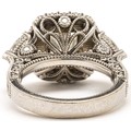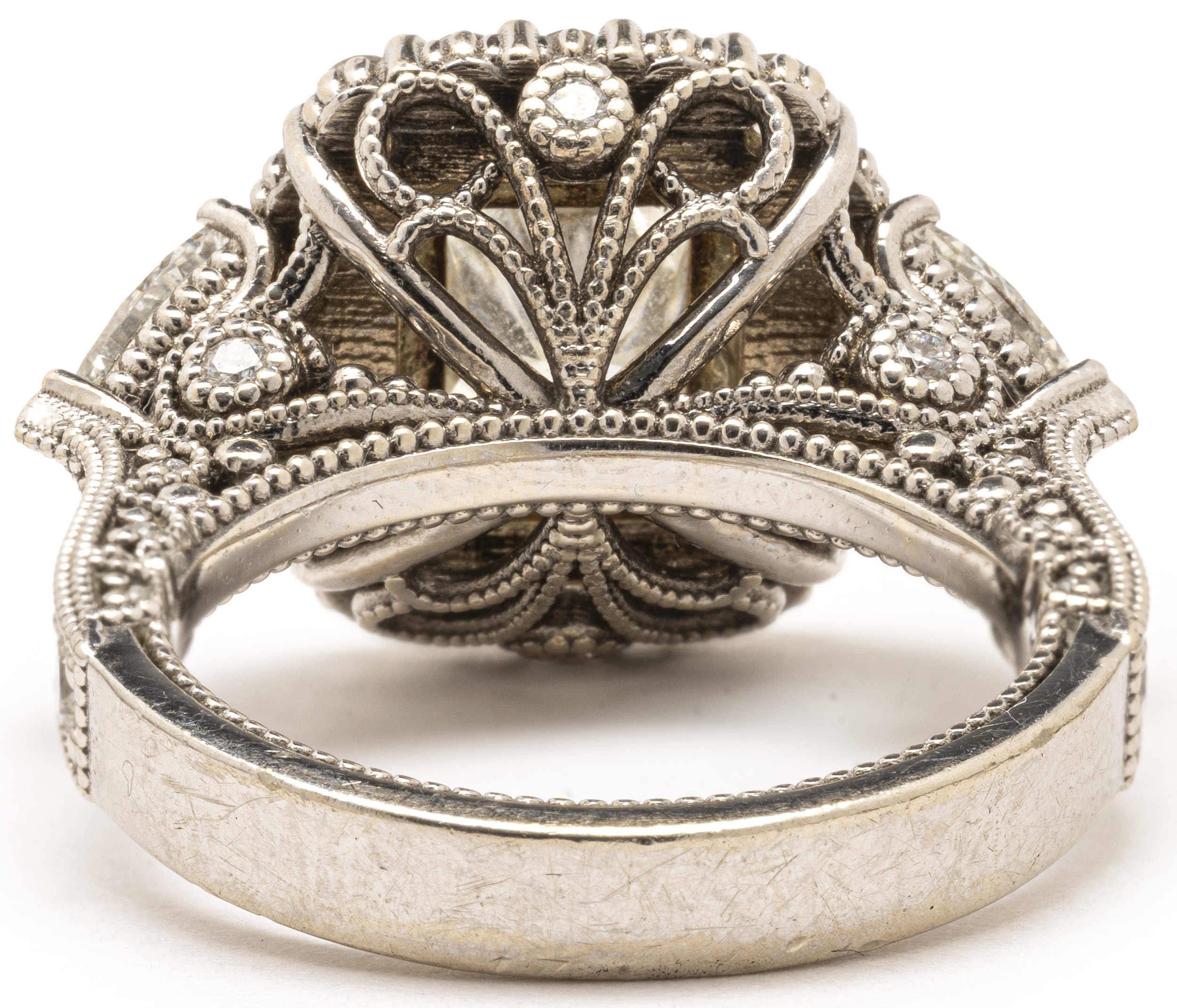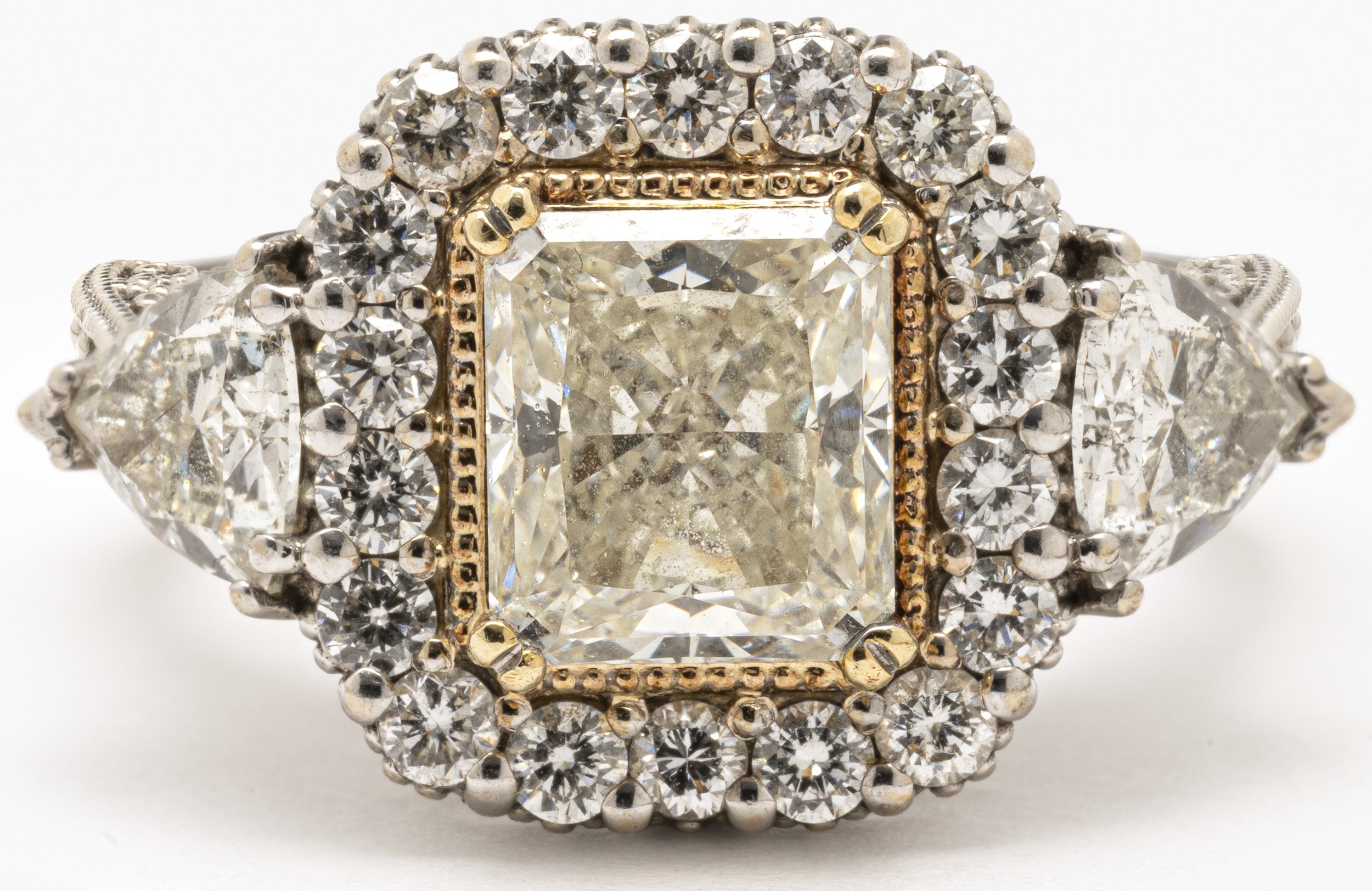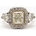 Claw set to the centre, the cut cornered modified rectangular brilliant diamond weighing 2.14 carats, colour K, clarity SI1, accompanied by G.I.A. certificate number 2298295343, flanked on each side by a trilliant cut diamond weighing 1.02 carats combined , colour H, clarity VS, embellished by pave set diamonds with a combined weight of 0.53 carats, colour H, clarity VS, in 18ct white gold, size L, 9,2g all in