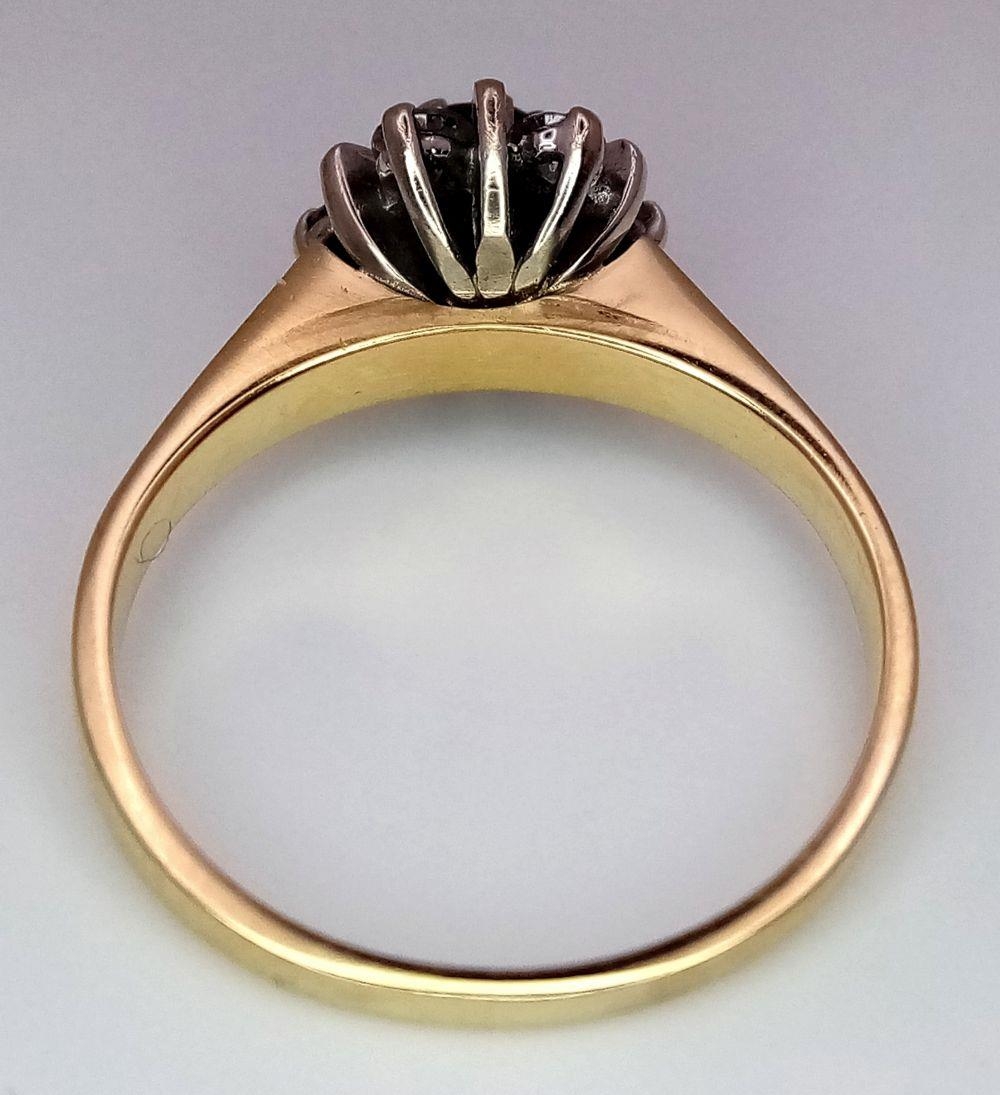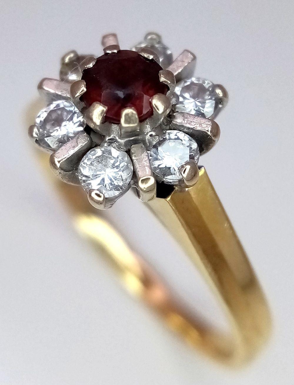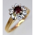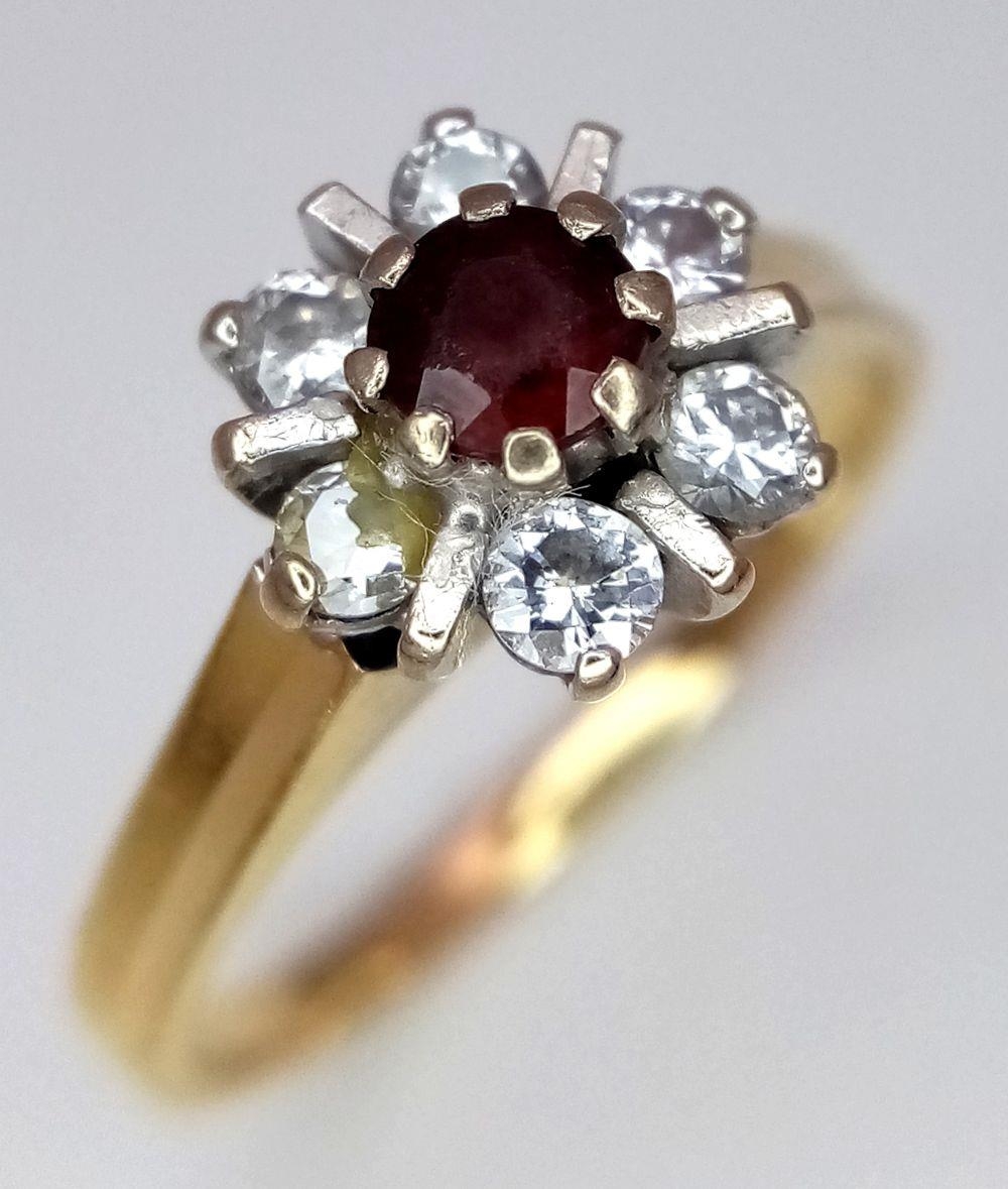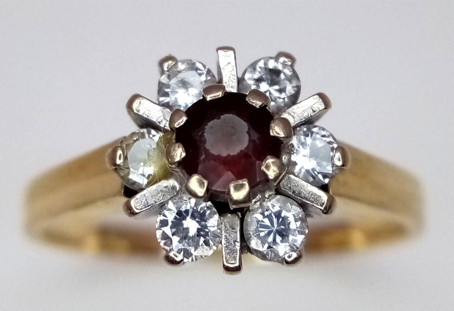 AN 18K YELLOW GOLD DIAMOND AND RED STONE RING. 0.20CT. 3.4G. SIZE K. SC3064.