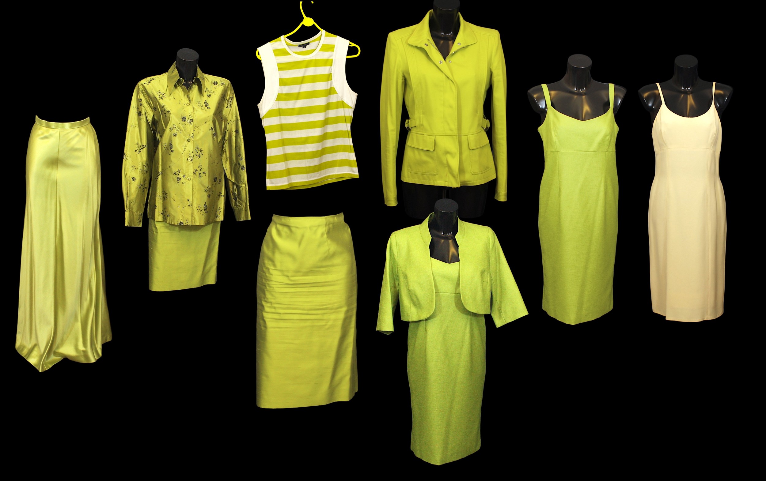 Designer Fashion: A collection of eight garments, in lime green colour,