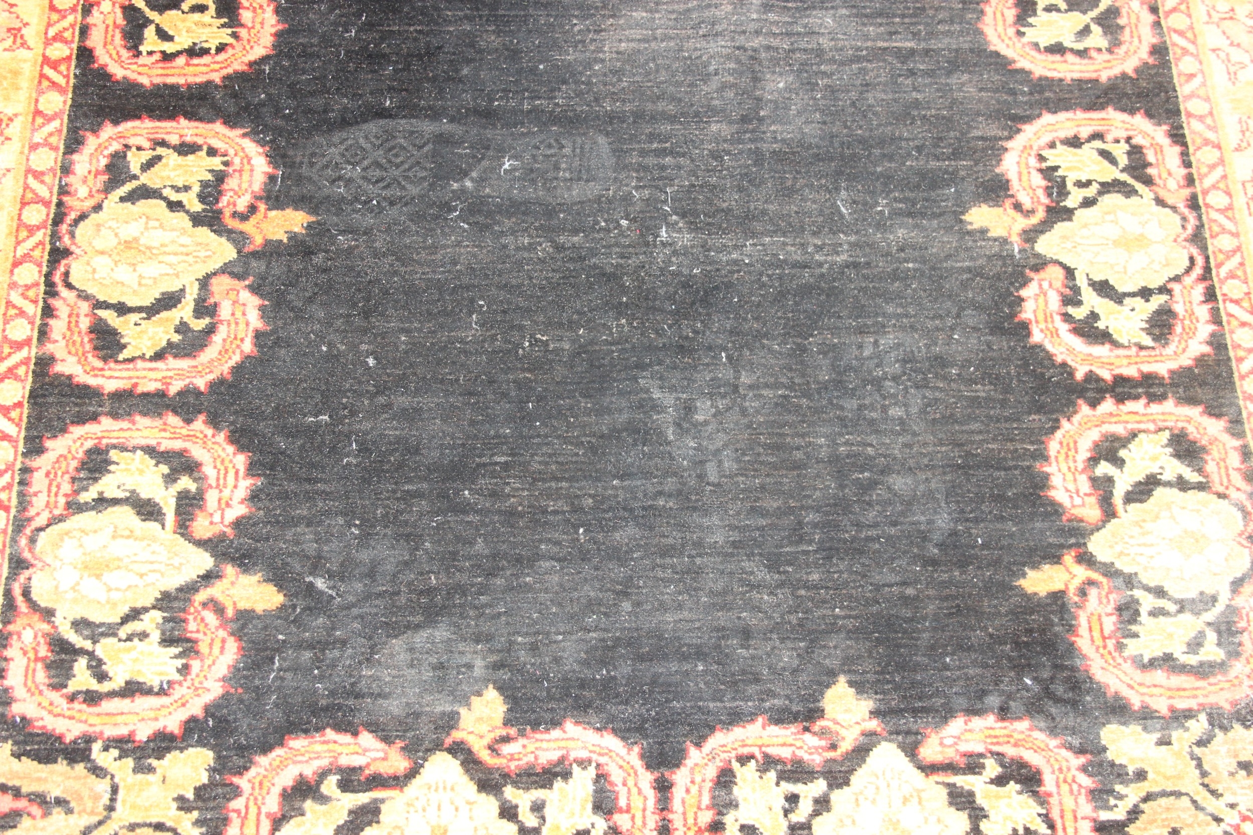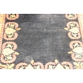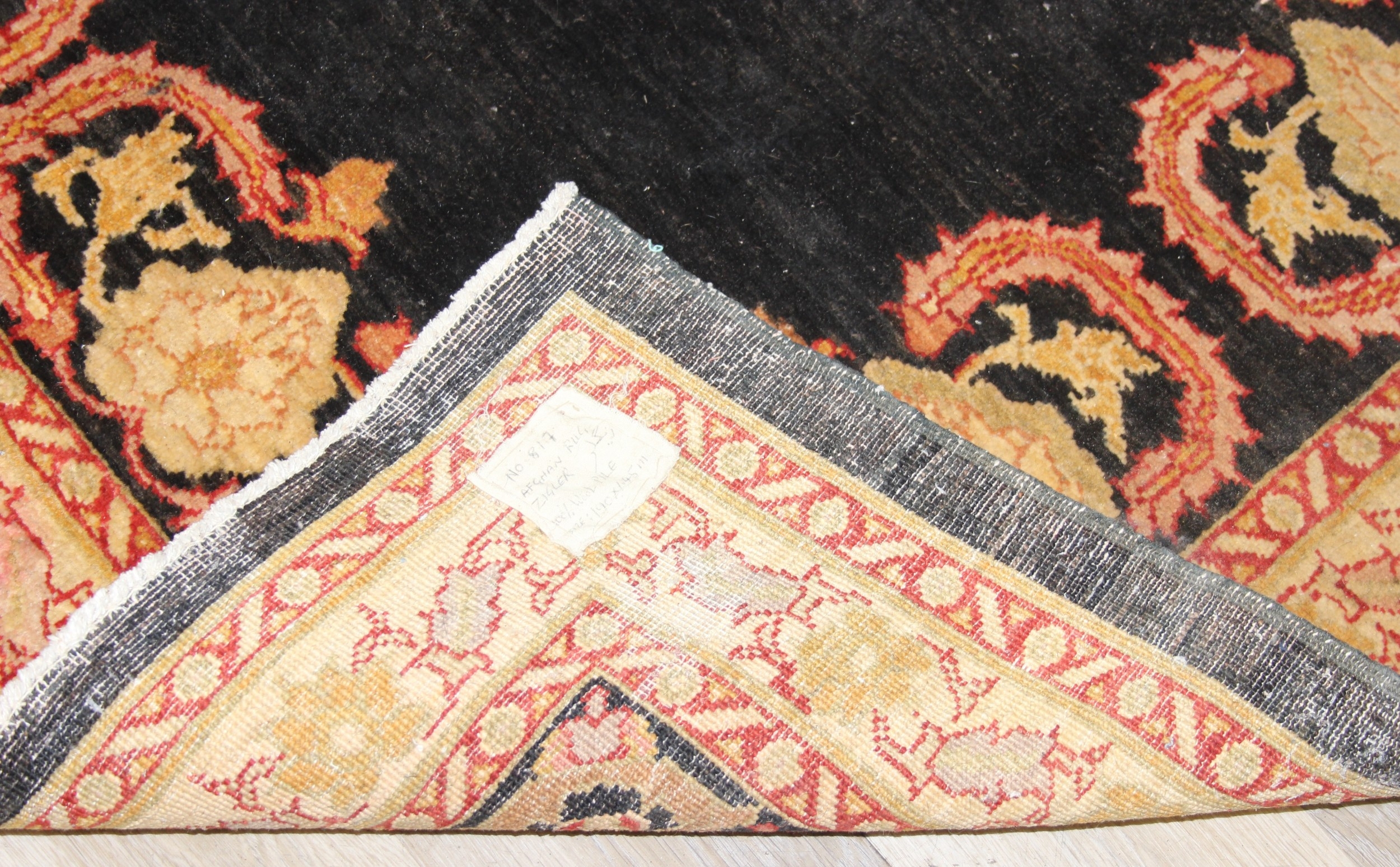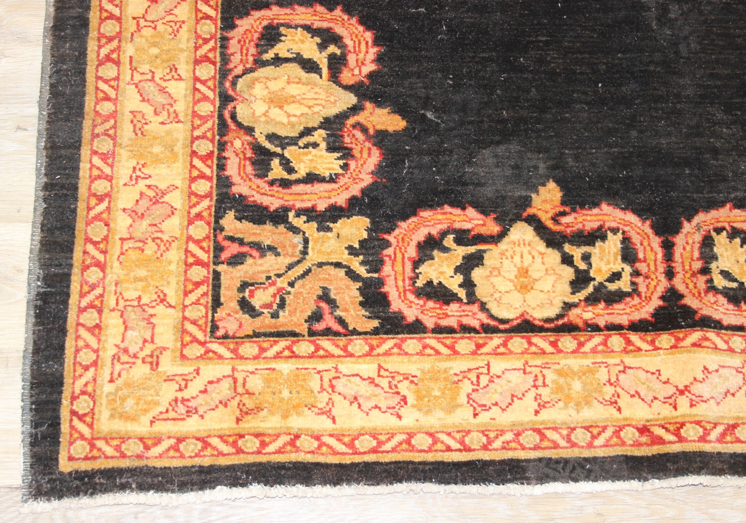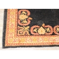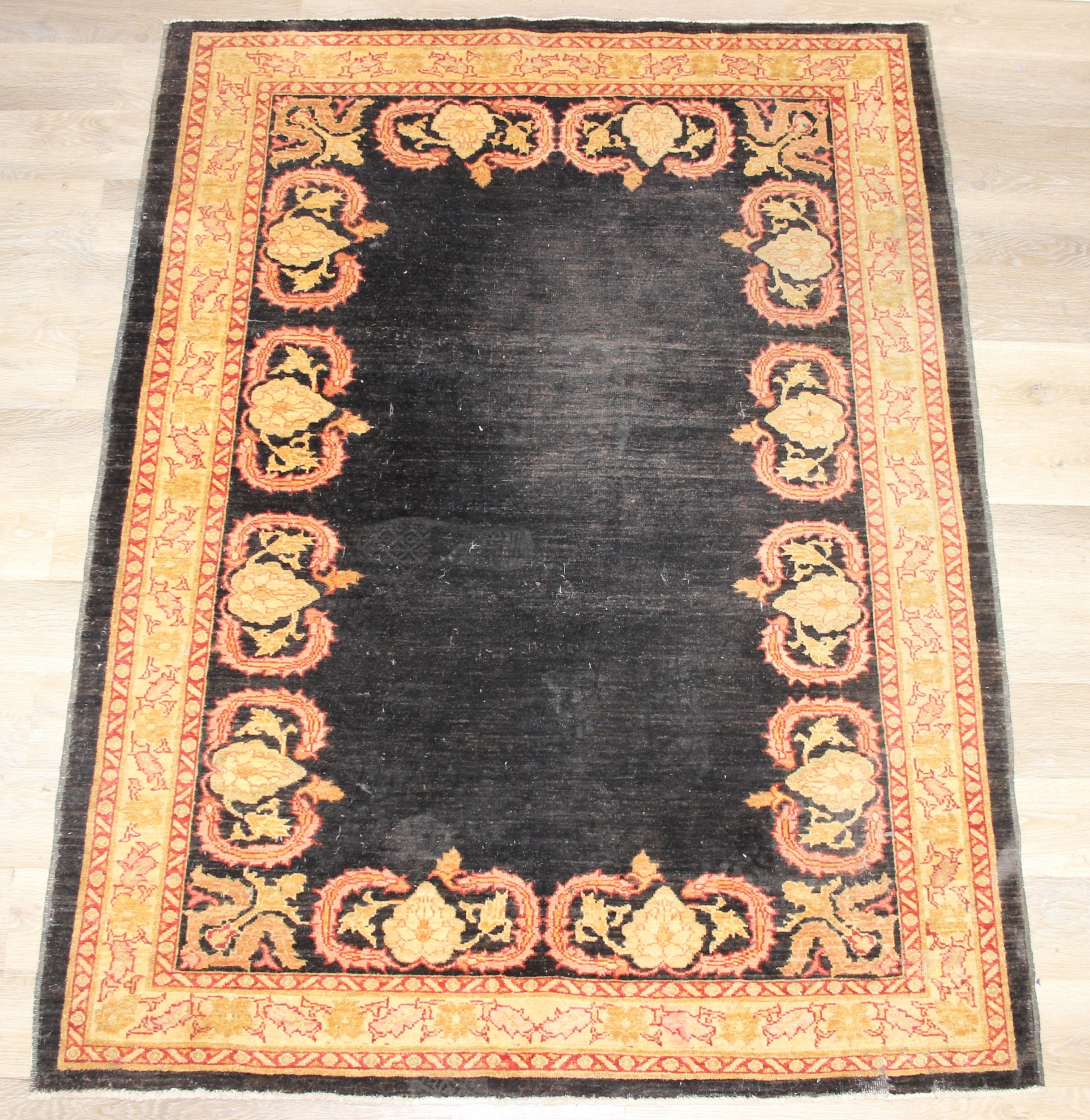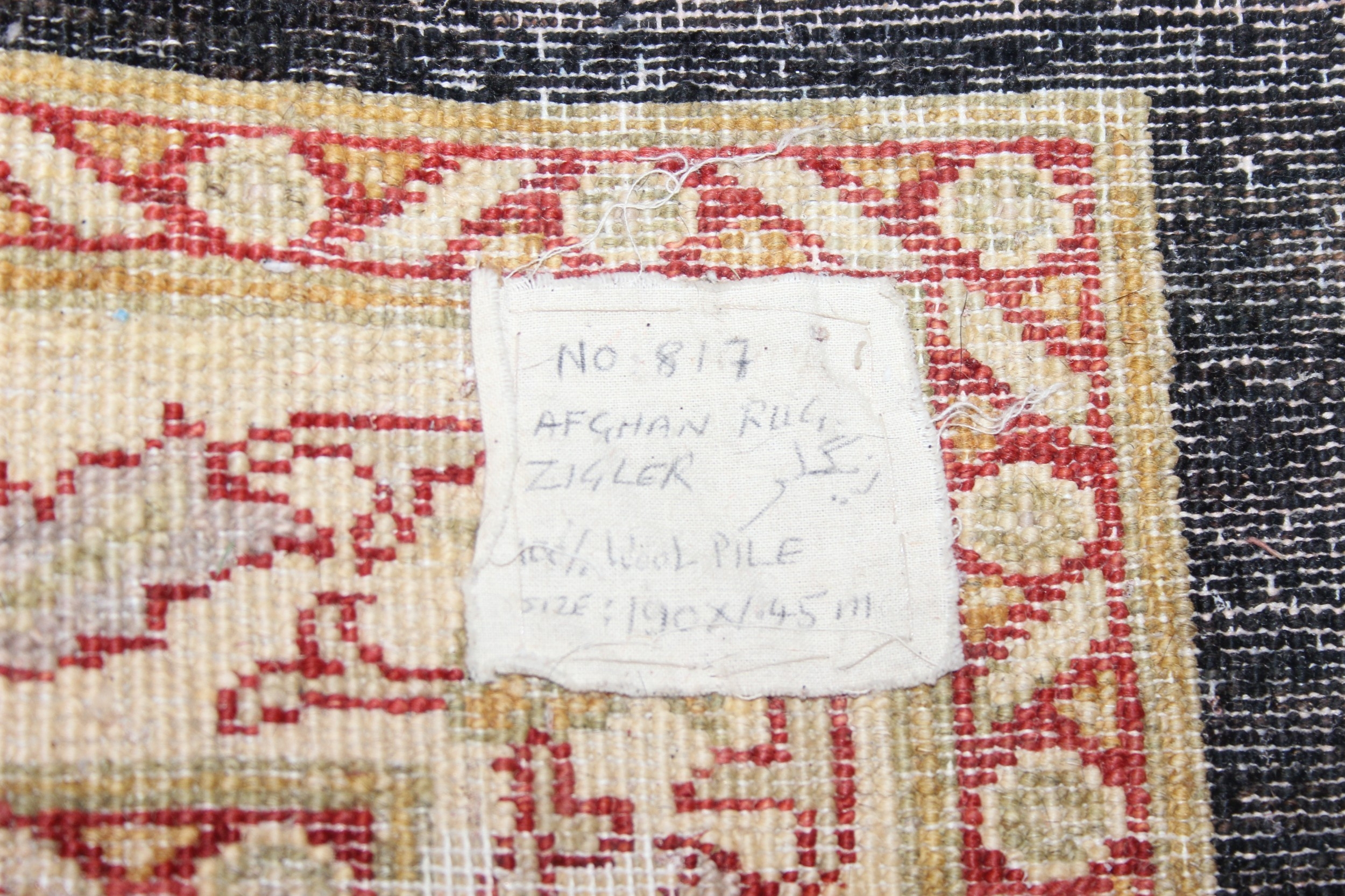 A vintage Afghan rug of black ground with decorative gold border, label verso marked Zigler, 192cm x 145cm