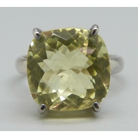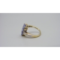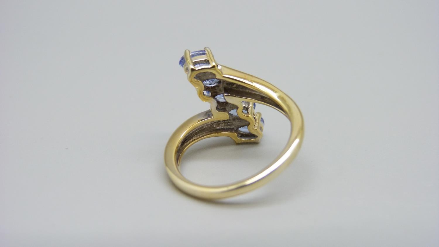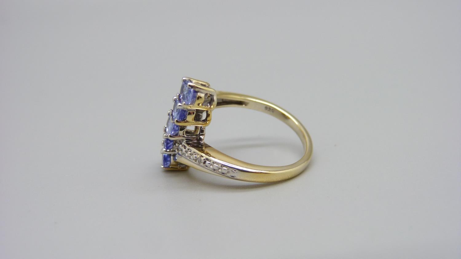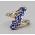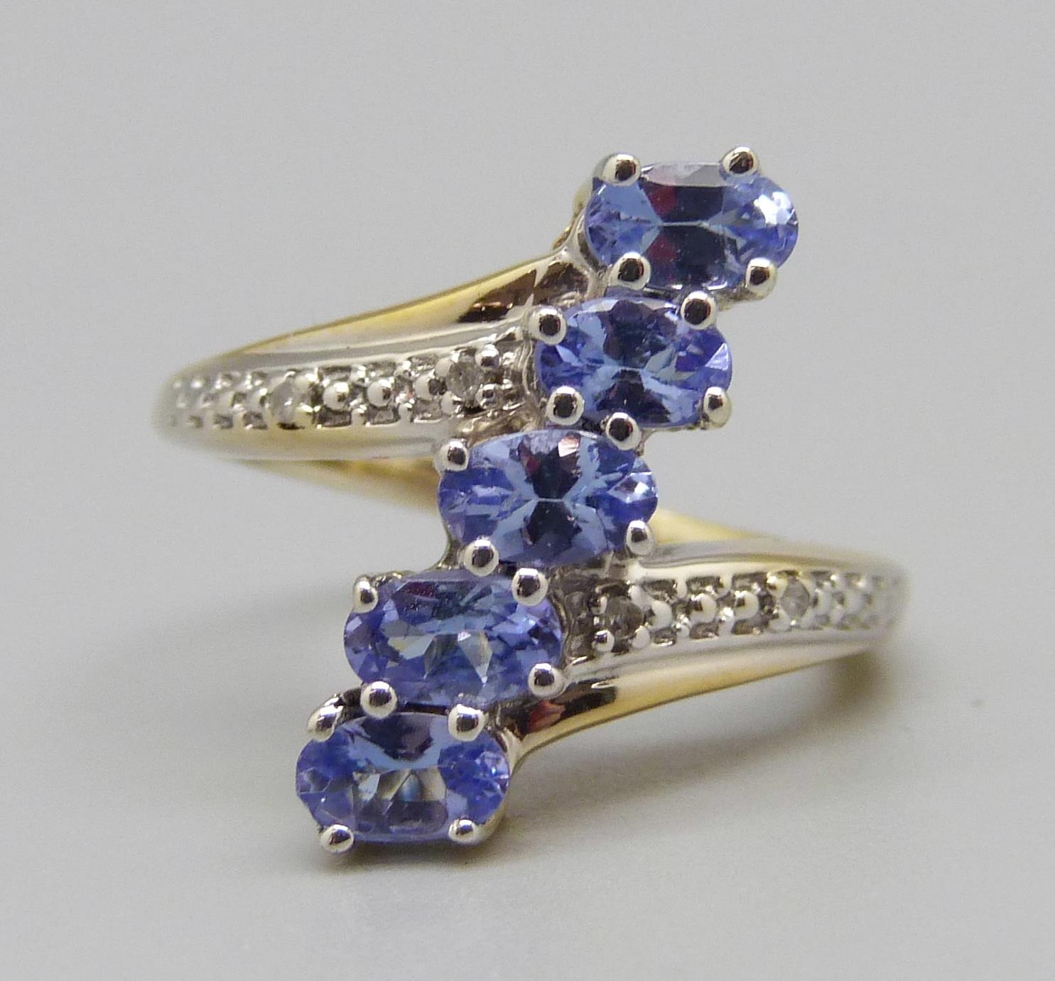 A silver gilt, five stone tanzanite ring with diamond accents, L