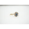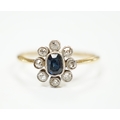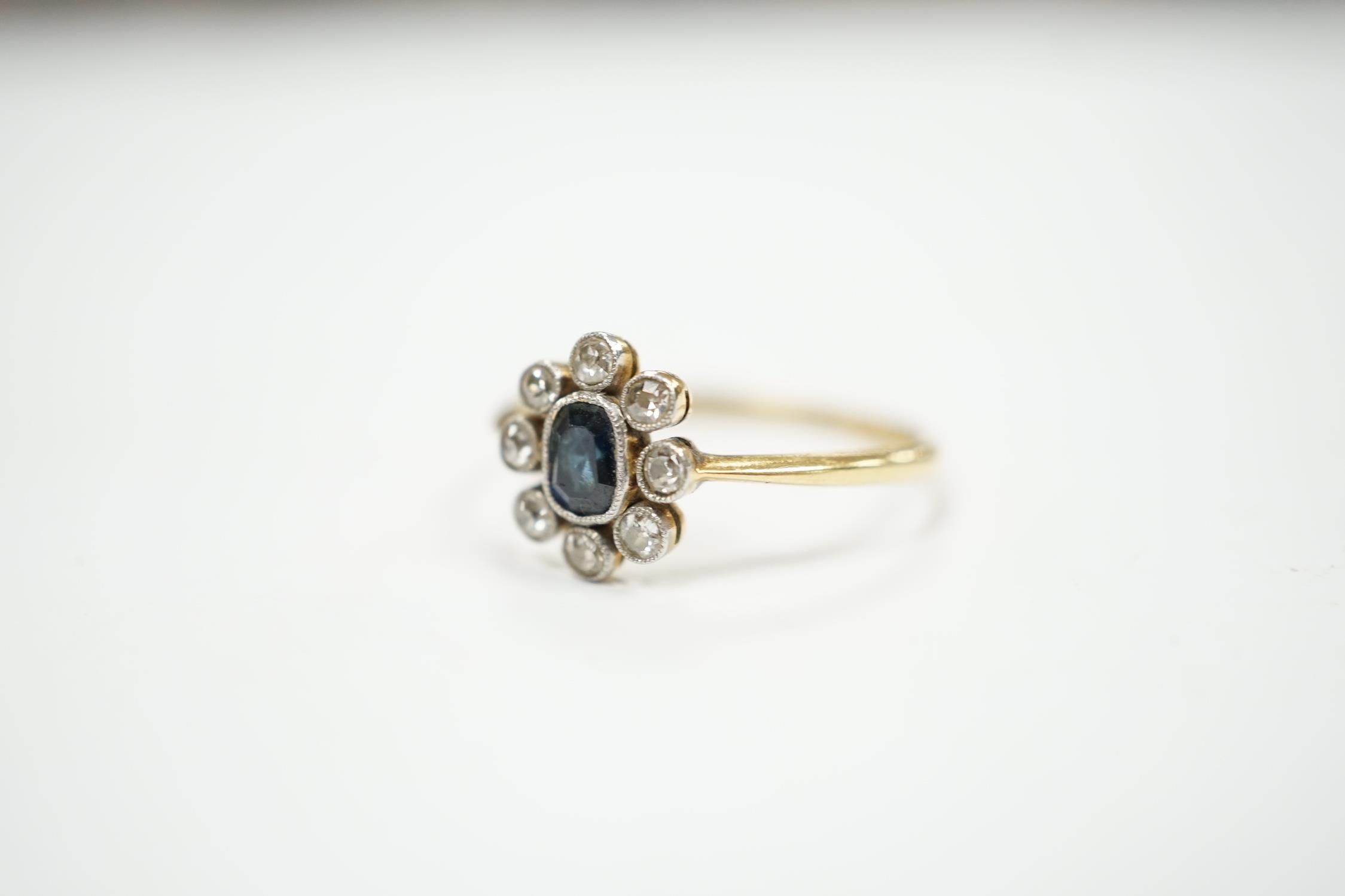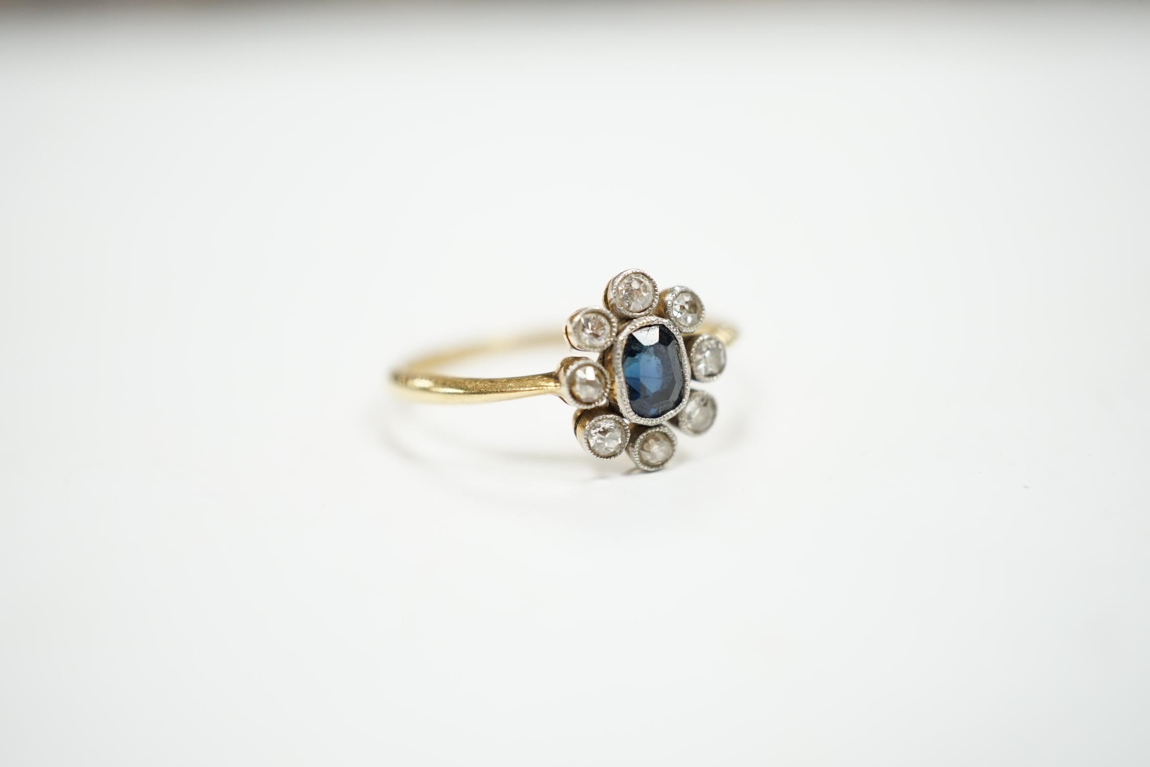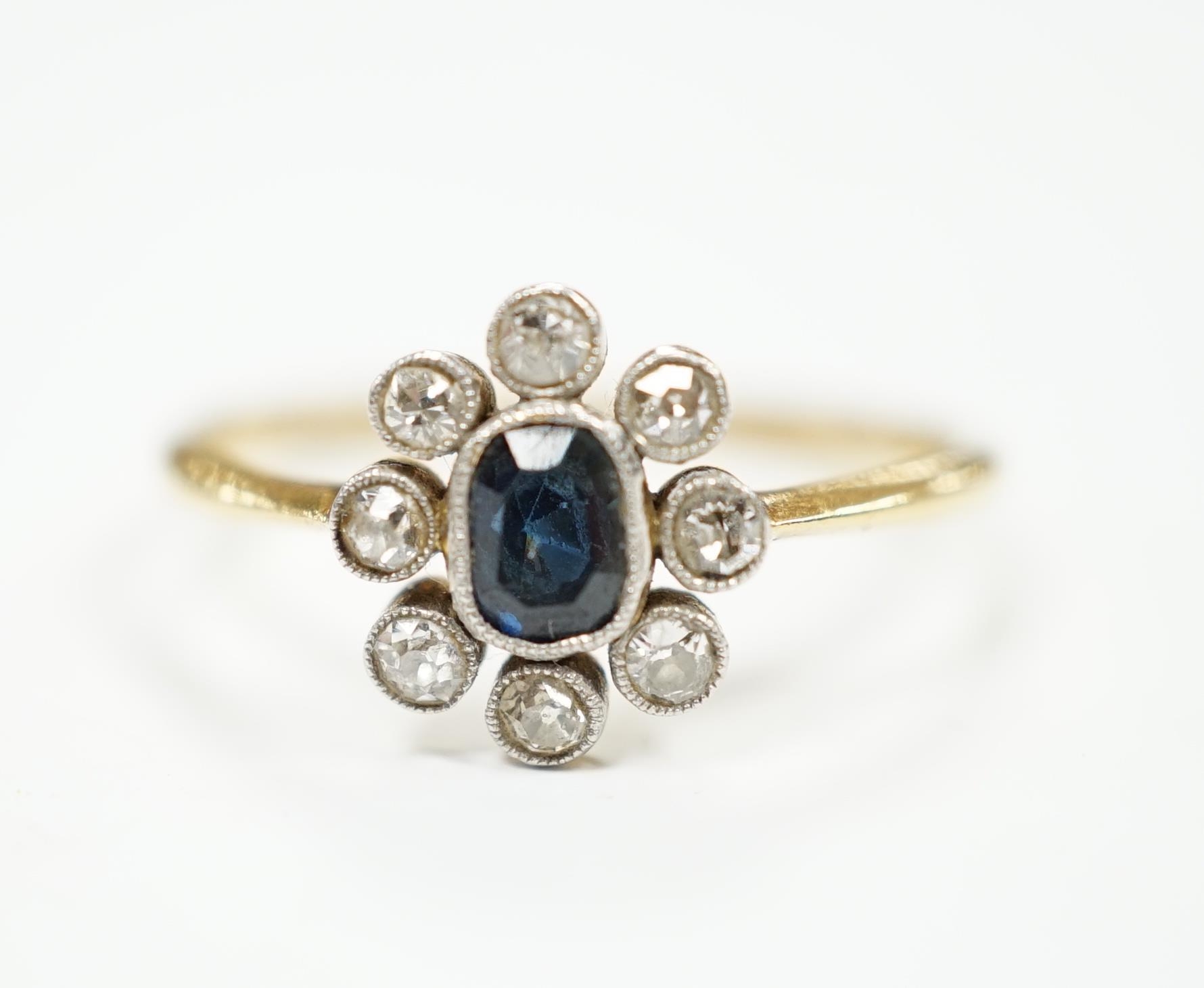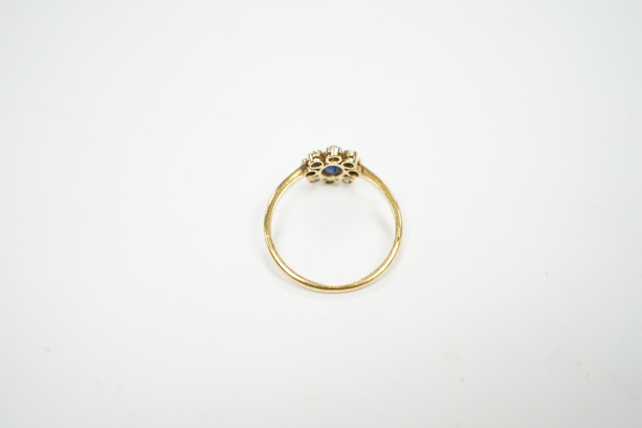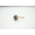 An 18ct, sapphire and diamond cluster set oval ring, size M, gross weight 2 grams.