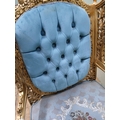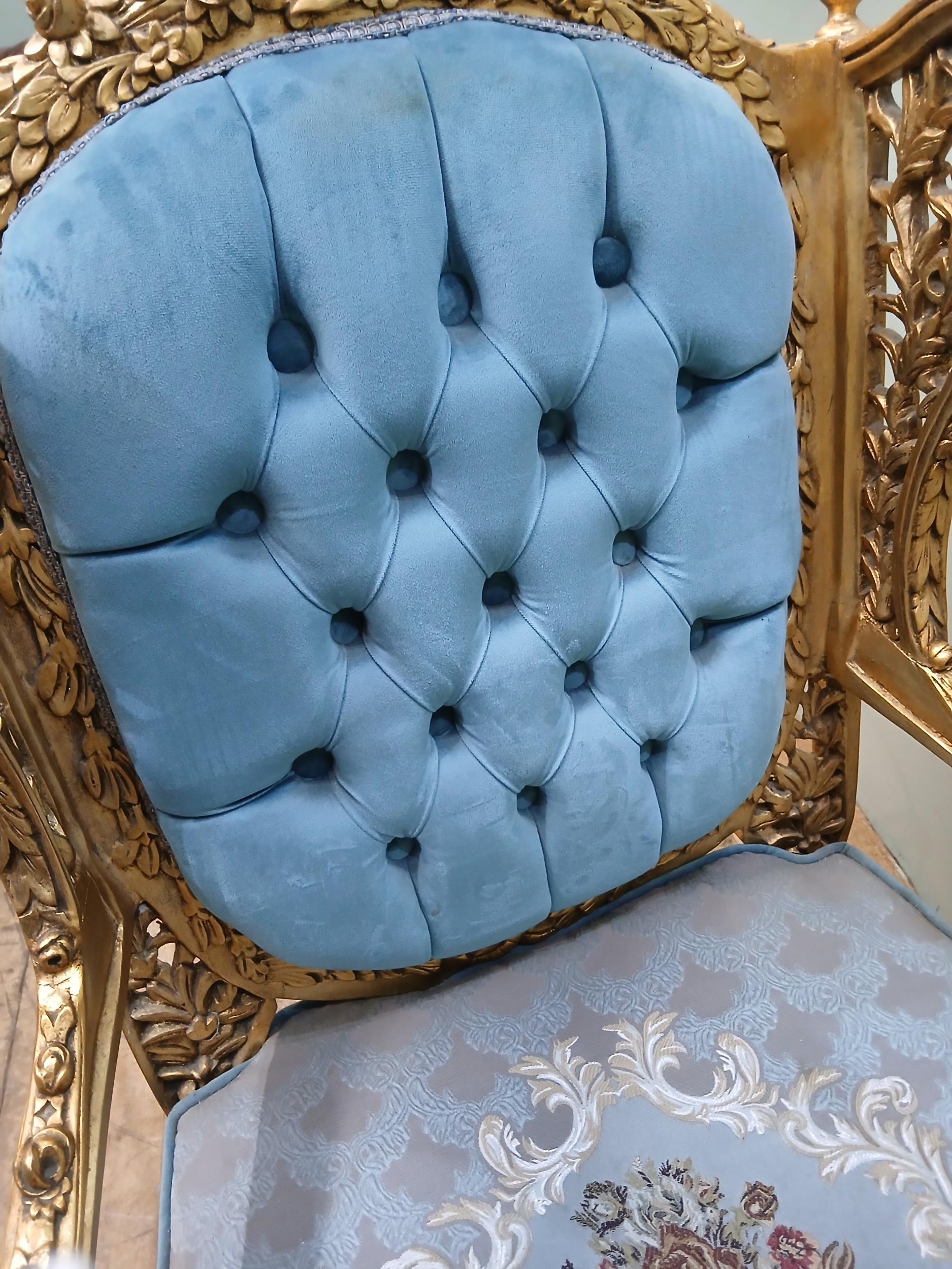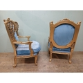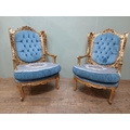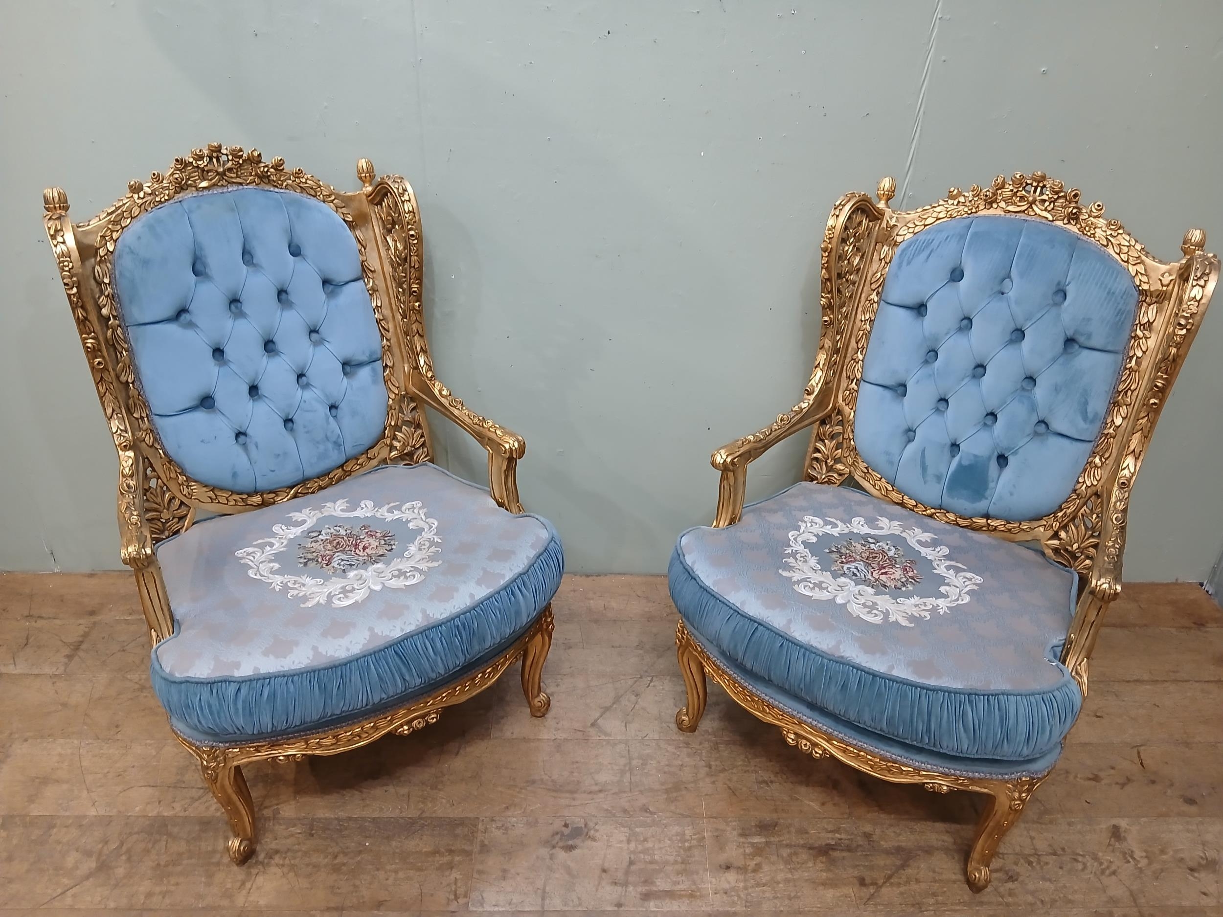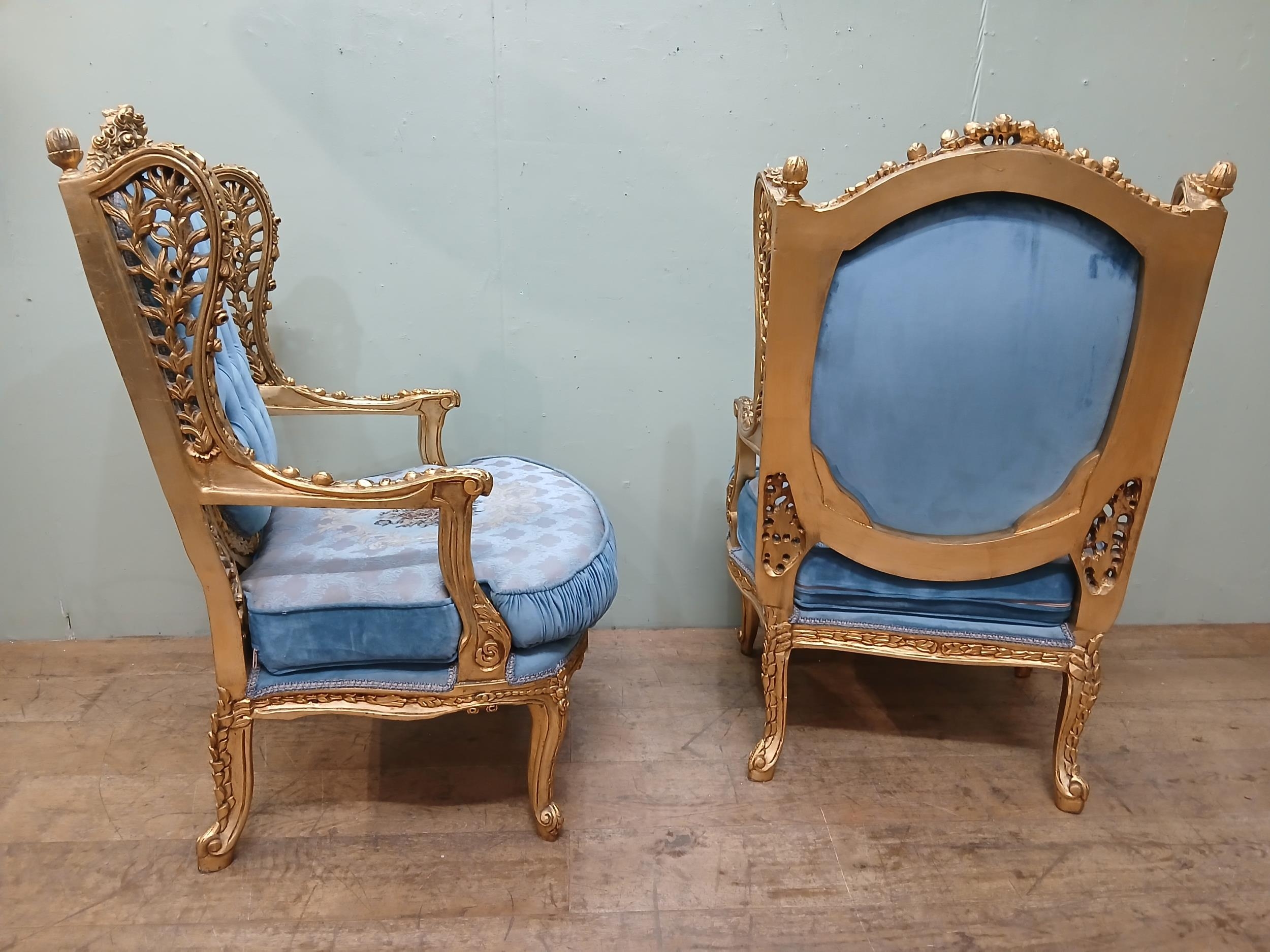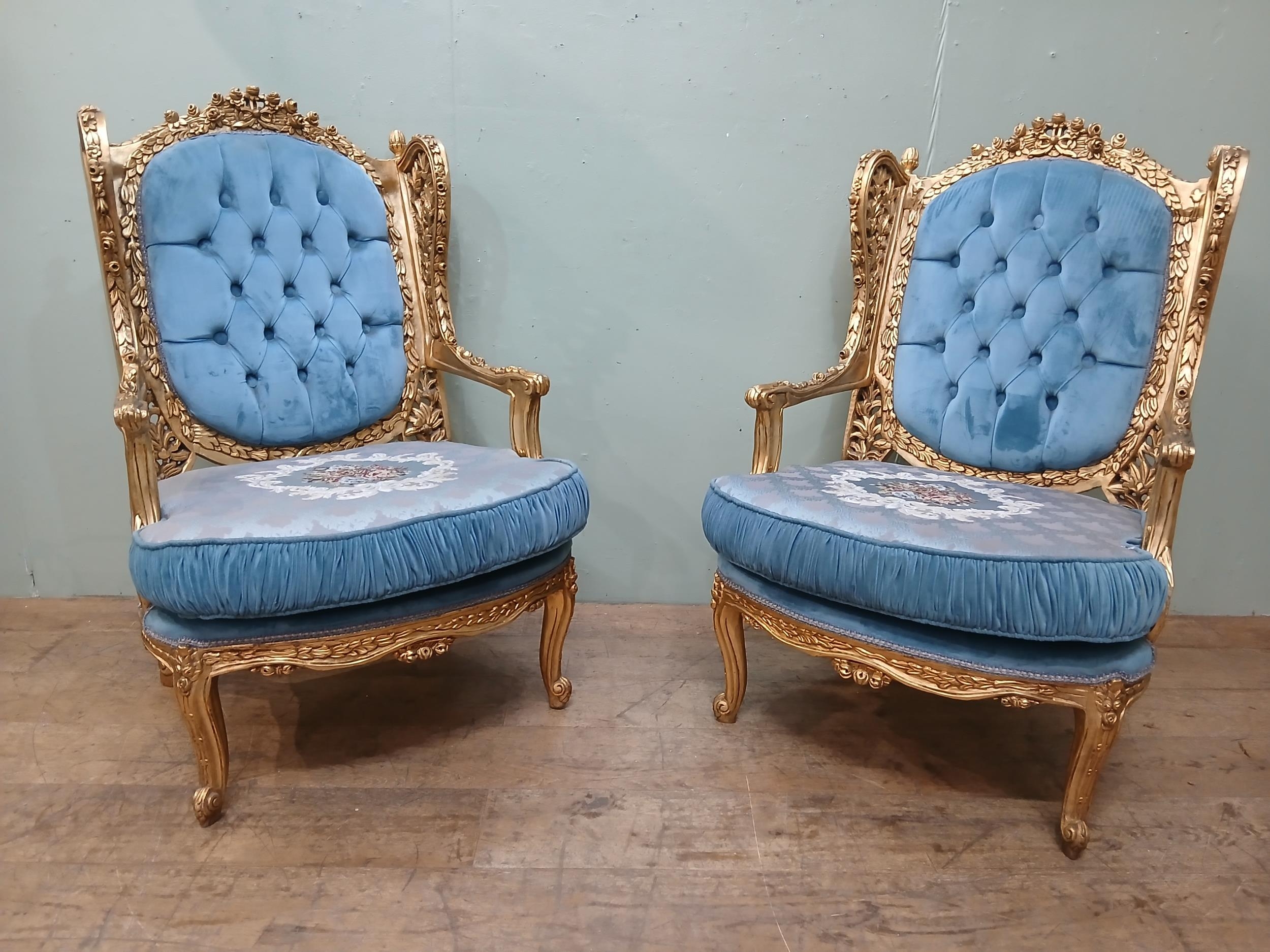 Pair of French gilt armchairs with blue velvet upholstery. {H 110cm x W 65cm x D 70cm }. NOT AVAILABLE TO VIEW IN PERSON.