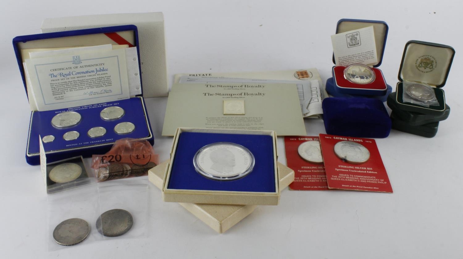 GB & Commonwealth silver coins and medals, 19th-20thC assortment including 2x Panama 2000 grain sterling 20 Balboas 1974 cased with certs; a couple of stilver stamp replicas, 1977 Jubilee Crowns, Virgin Islands proof set 1978, three Prince of Wales Investiture medals by Slade Hampton & Son, etc.