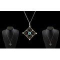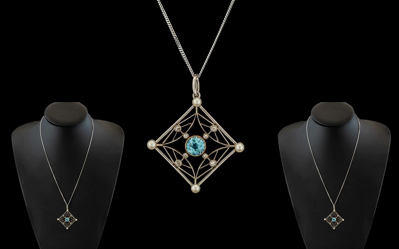 Art Nouveau - Exquisite 18ct White Gold and Petite Diamond and Aquamarine Set Pendant Drop, Attached to a 18ct White Gold Chain. Pendant Not Marked but Tests High Ct Gold. Pendant Size 1.25 x 1.25 Inches - 3.15 x 3,15 cms. Chain length 16 Inches - 40 cms. Both Pendant and Chain In Excellent Condition.