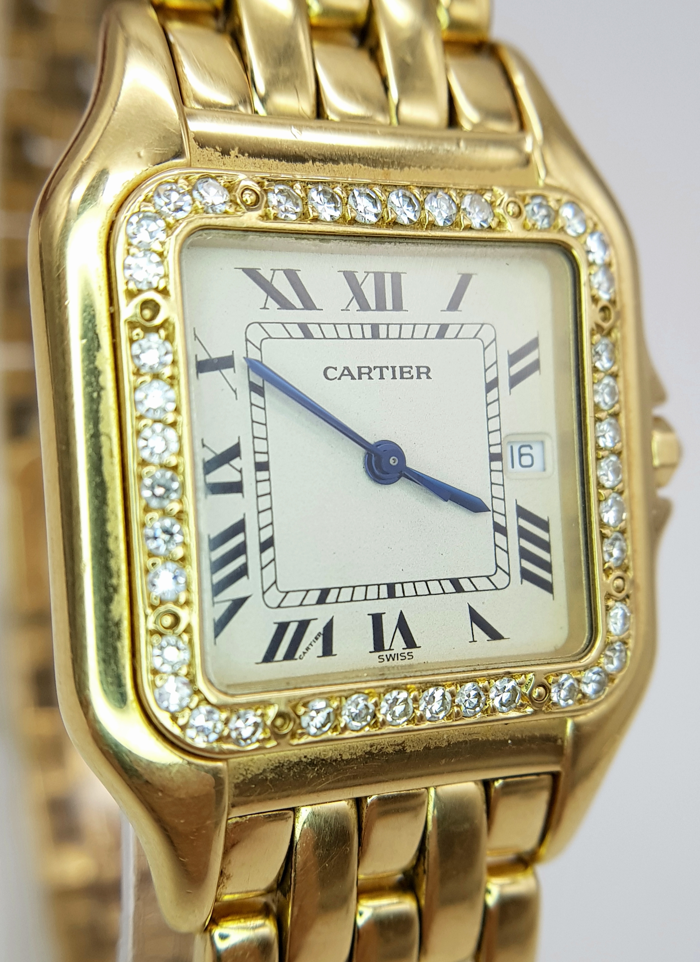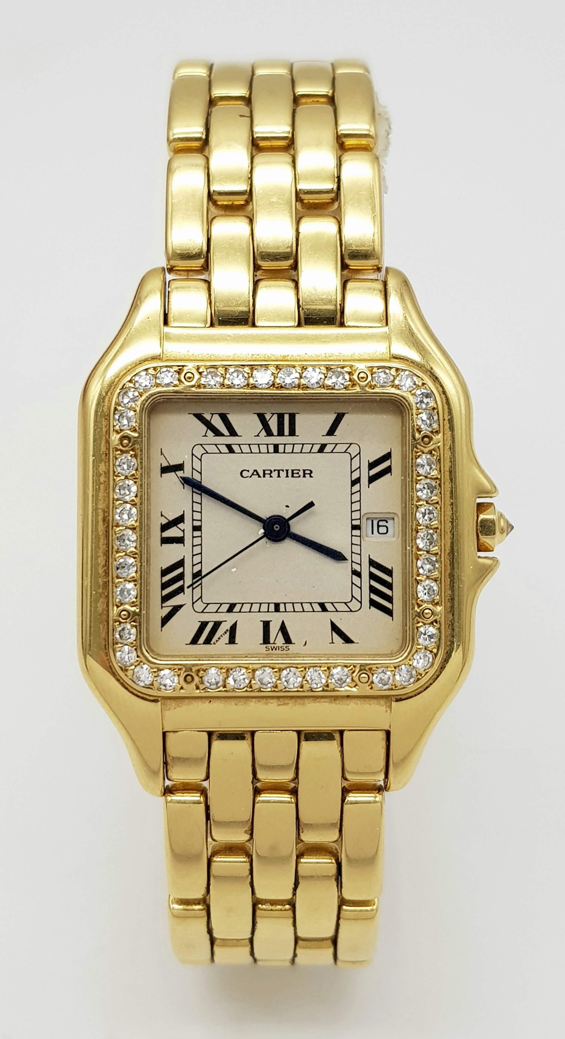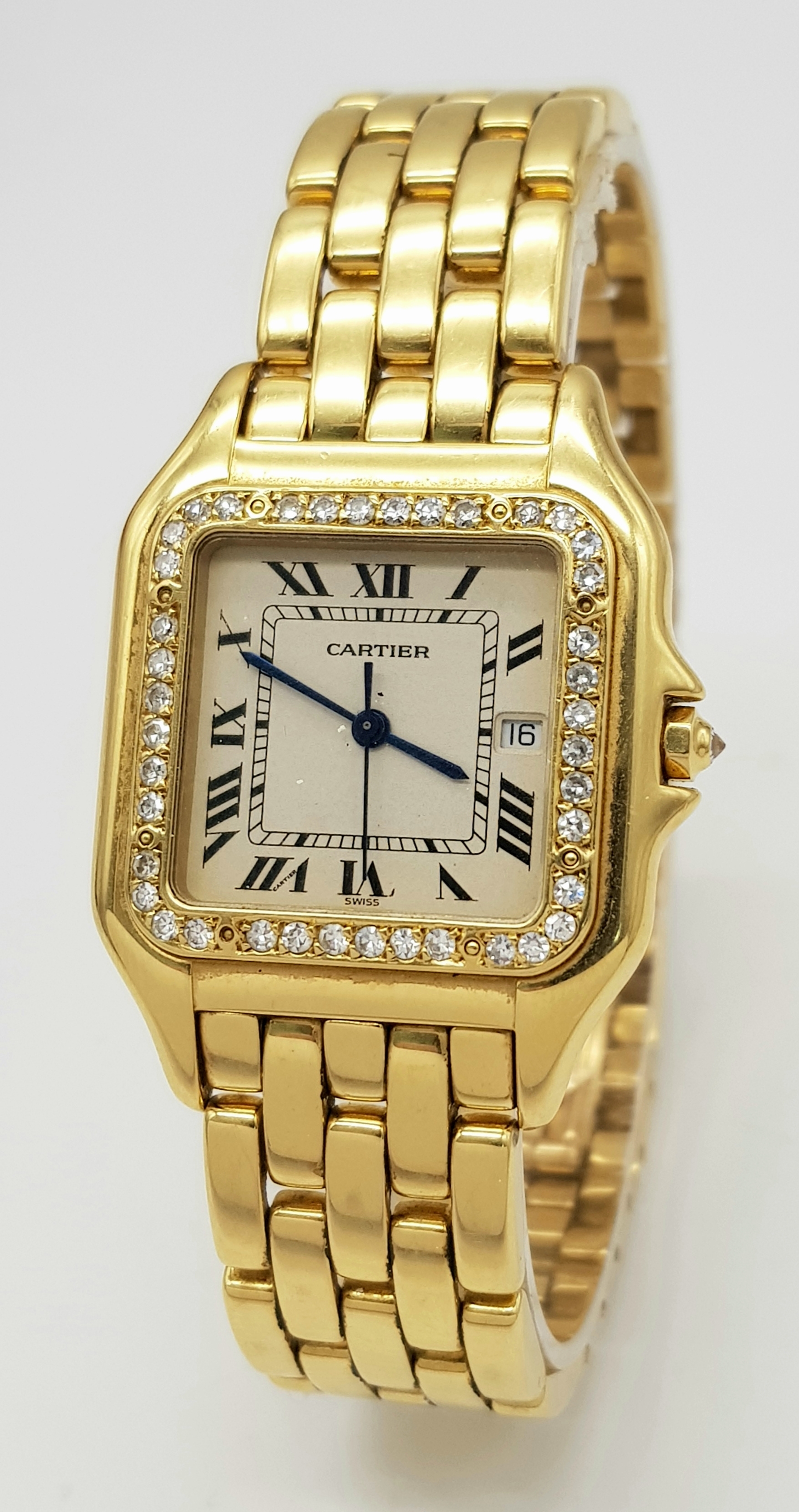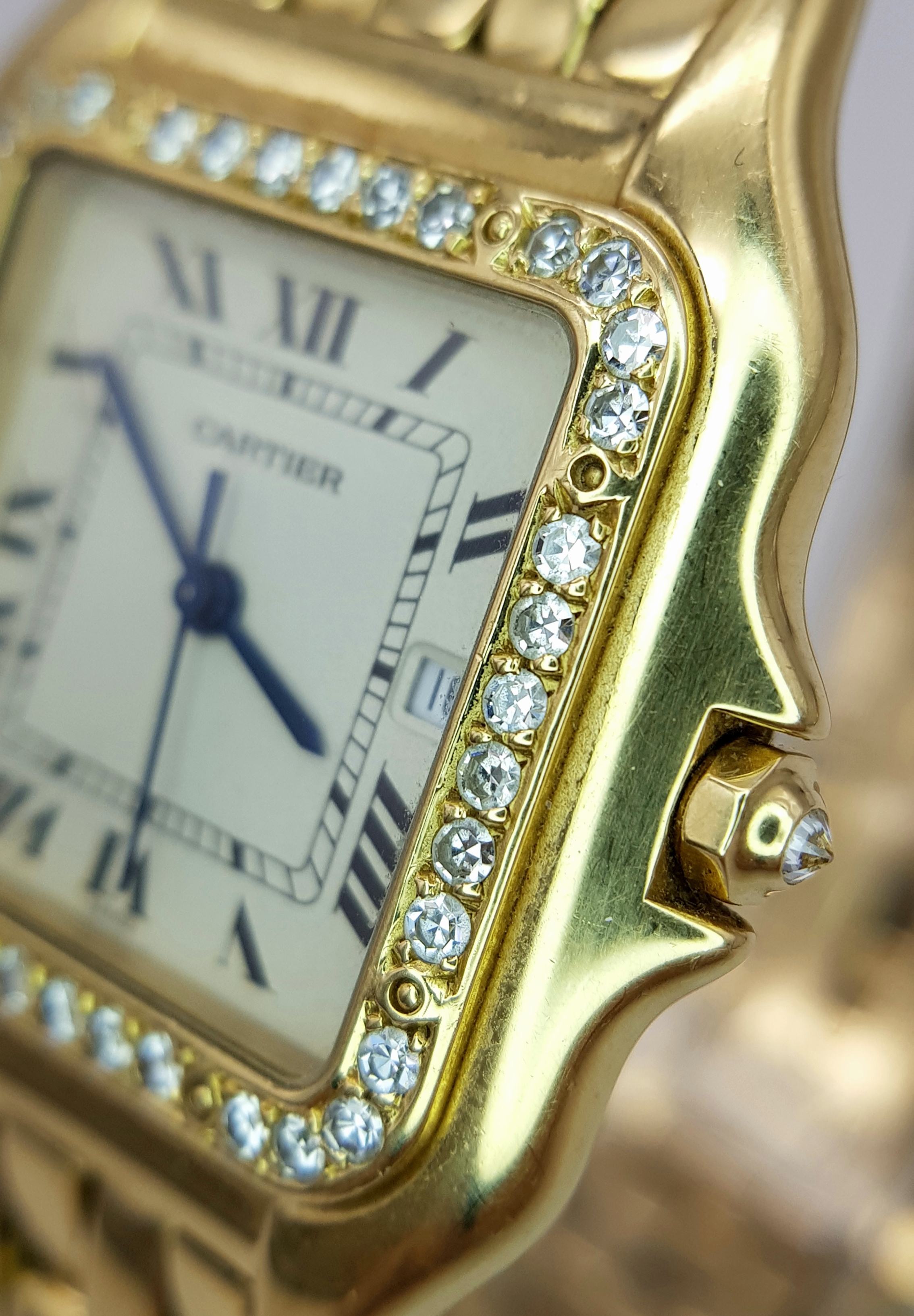 A Beautiful Vintage Cartier Diamond Panthere de Cartier 18K Gold Gents Watch - Model 8839610232. 18k gold bracelet and case - 33mm (with crown) x 41mm. Diamond bezel and crown end. White dial with Roman numerals. Quartz movement. In very good condition and working order. Comes with a Cartier case. 130g total weight.