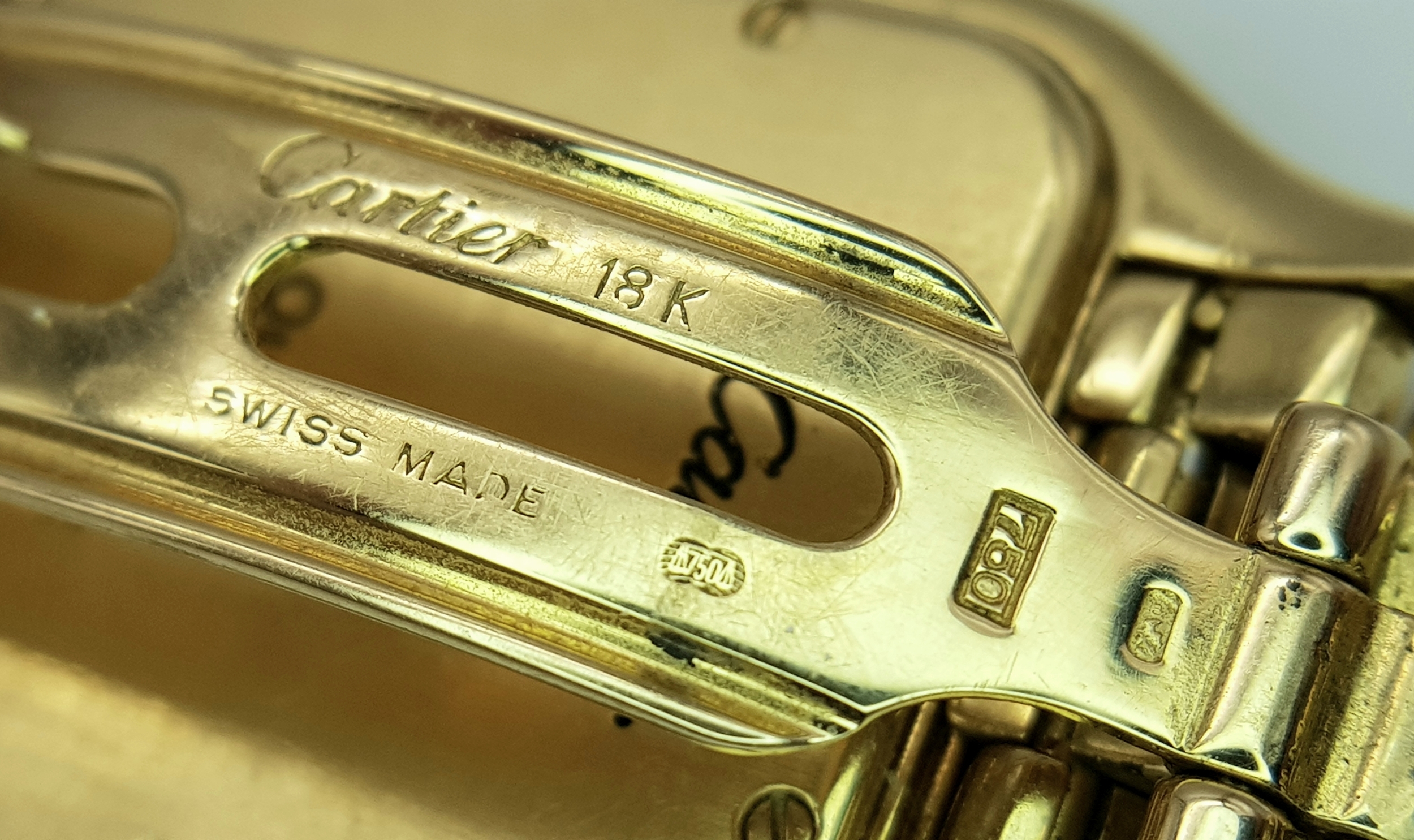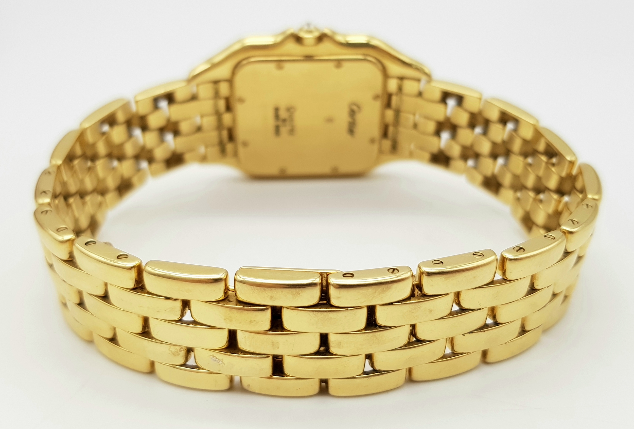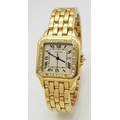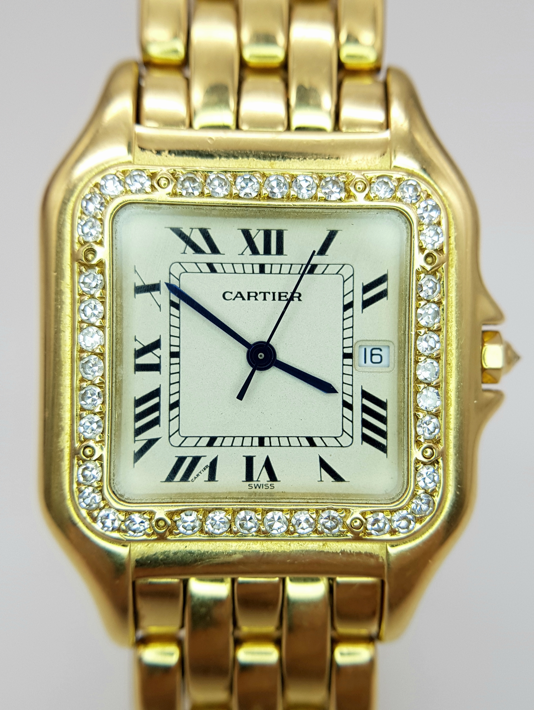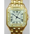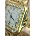 A Beautiful Vintage Cartier Diamond Panthere de Cartier 18K Gold Gents Watch - Model 8839610232. 18k gold bracelet and case - 33mm (with crown) x 41mm. Diamond bezel and crown end. White dial with Roman numerals. Quartz movement. In very good condition and working order. Comes with a Cartier case. 130g total weight.