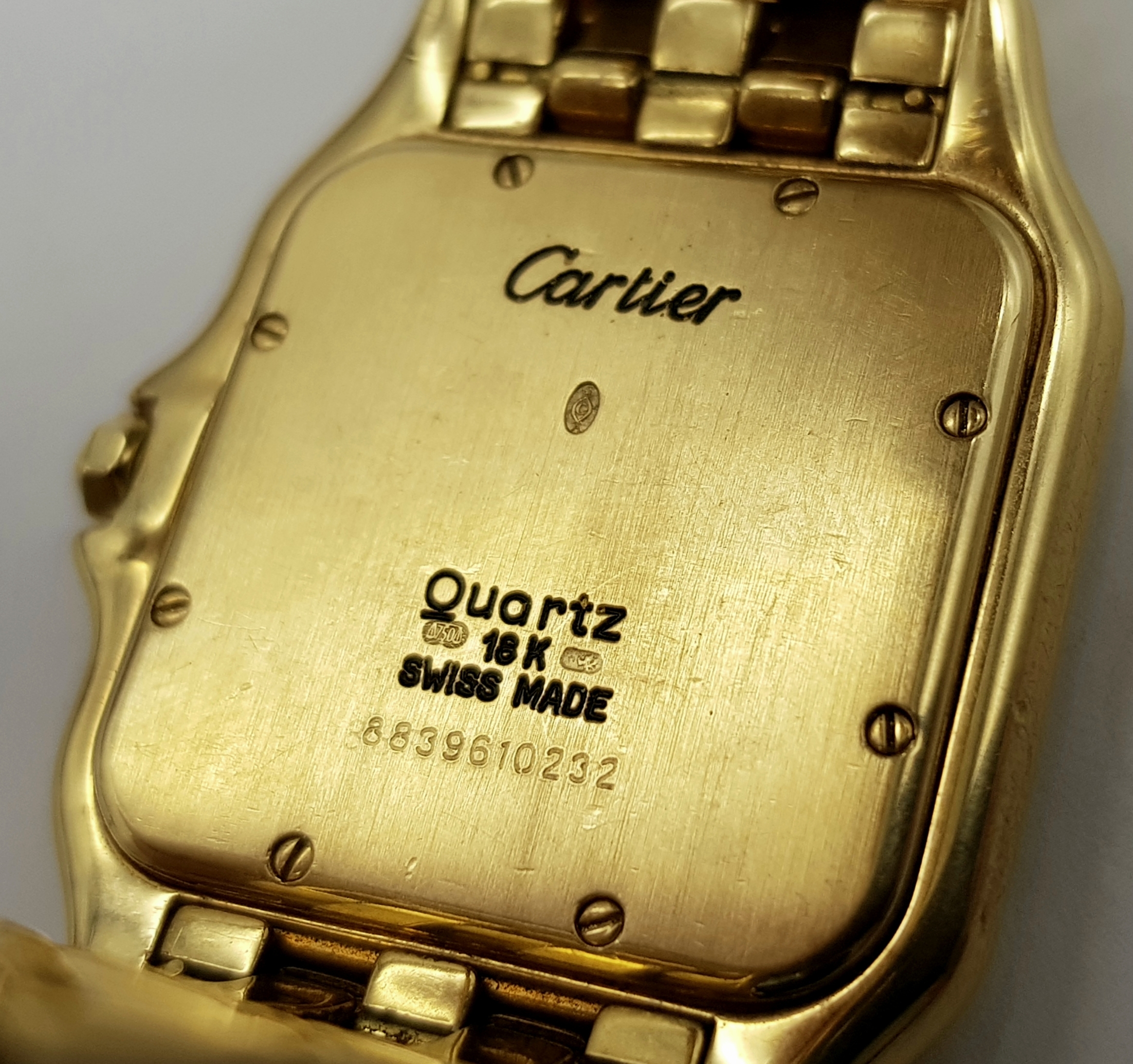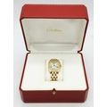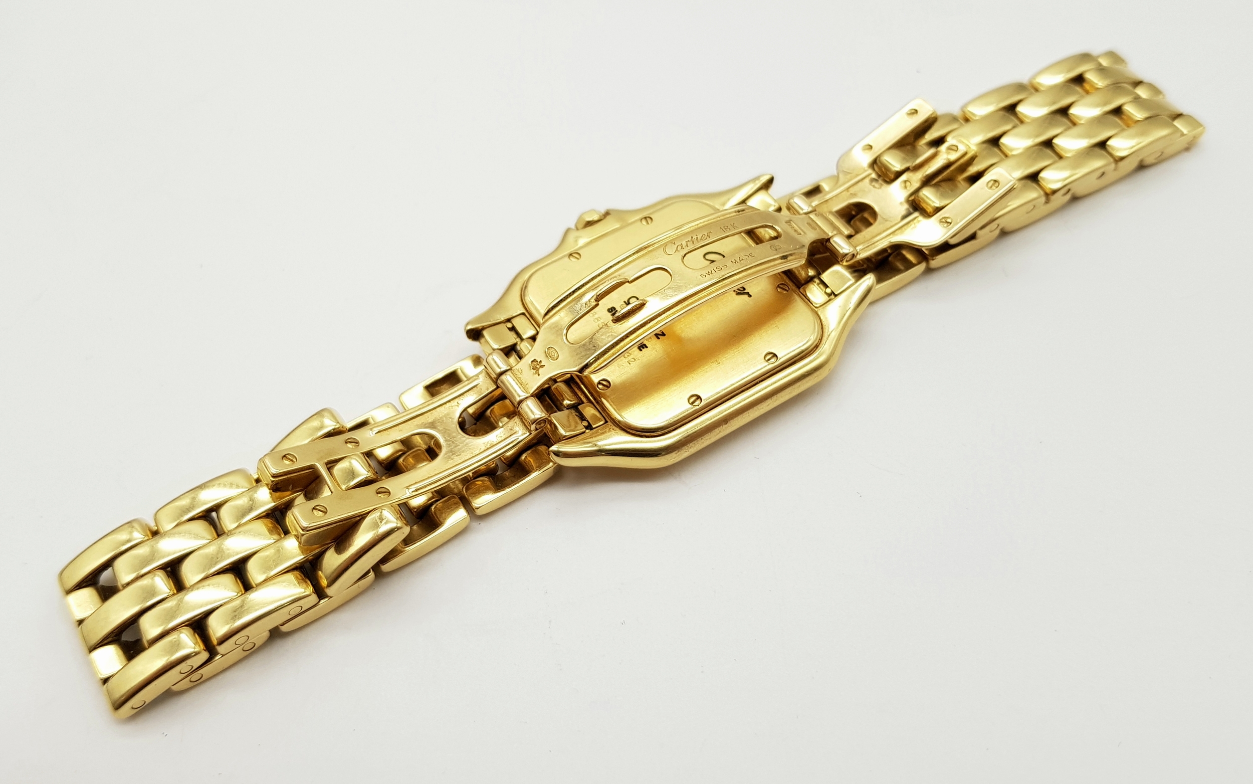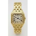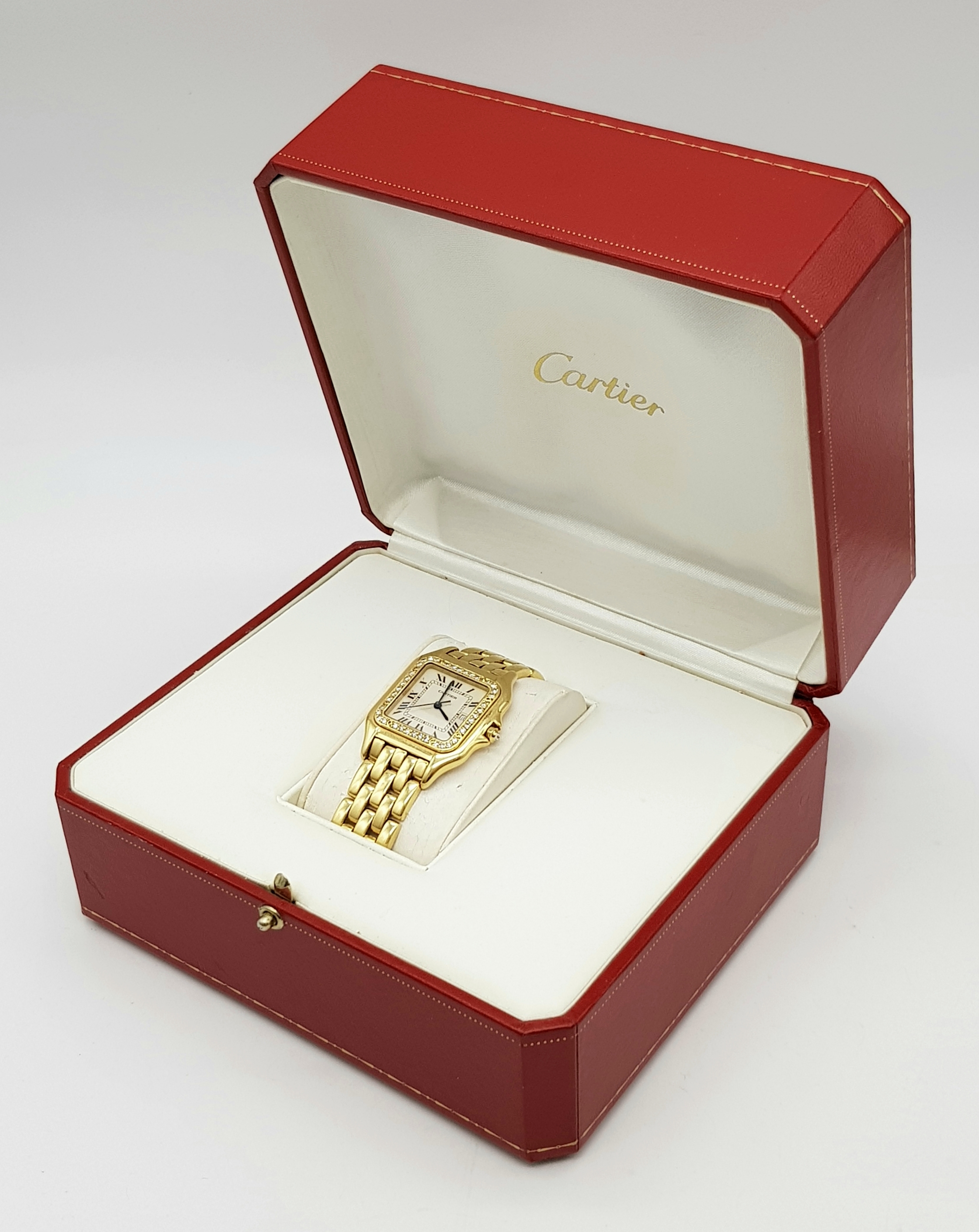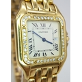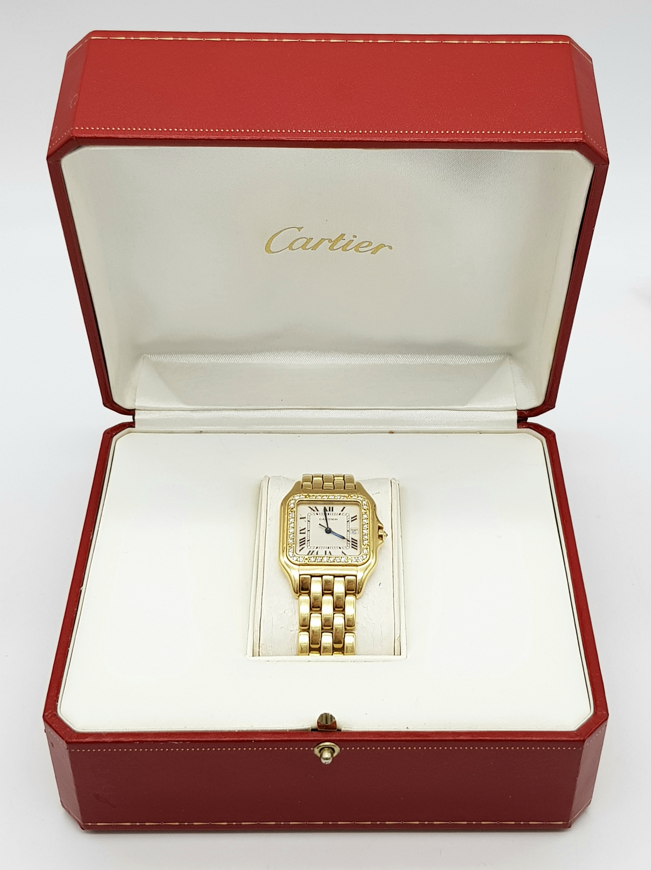 A Beautiful Vintage Cartier Diamond Panthere de Cartier 18K Gold Gents Watch - Model 8839610232. 18k gold bracelet and case - 33mm (with crown) x 41mm. Diamond bezel and crown end. White dial with Roman numerals. Quartz movement. In very good condition and working order. Comes with a Cartier case. 130g total weight.