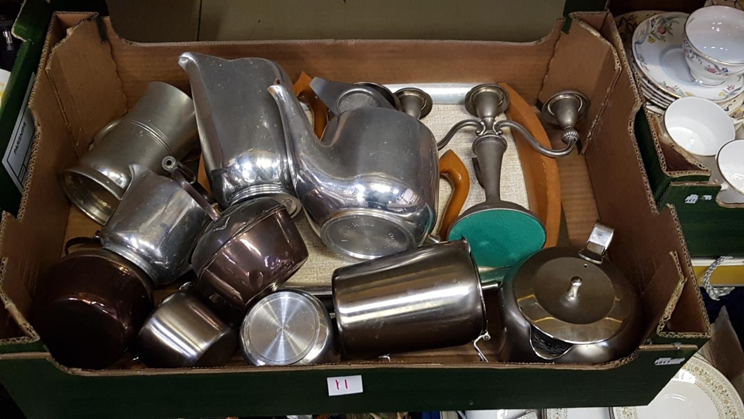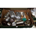Box of Plated, Stainless & Copper Ware to Include Piquot Ware Part Tea Service etc.