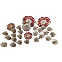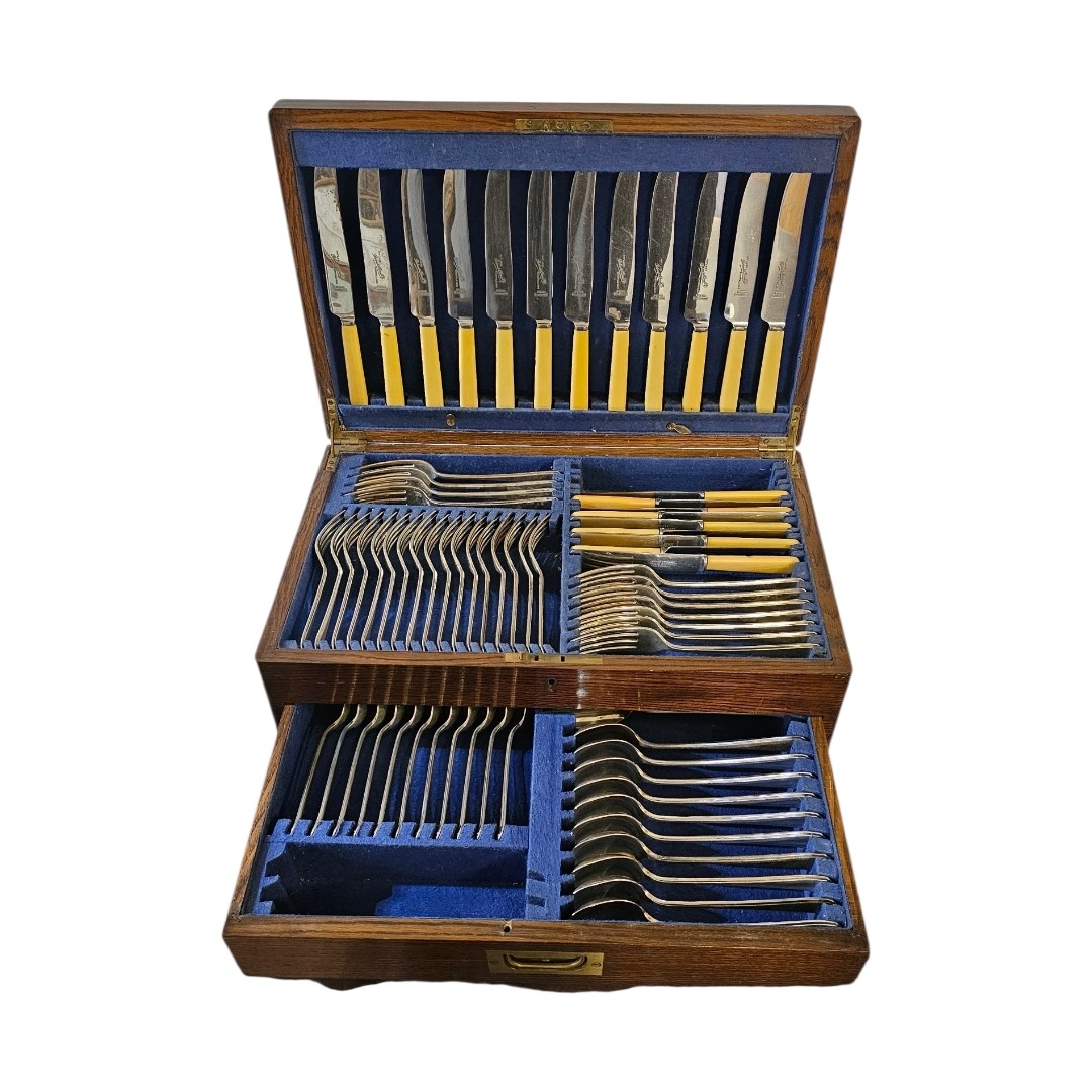 A part set service for twelve in a fitted two-tier oak case, featuring a geometric clipped corner pattern, the set includes dinner and dessert knives with xylonite handles, forks, soup, dessert, and serving spoons, the case with original brass fittings and royal blue velvet lining.