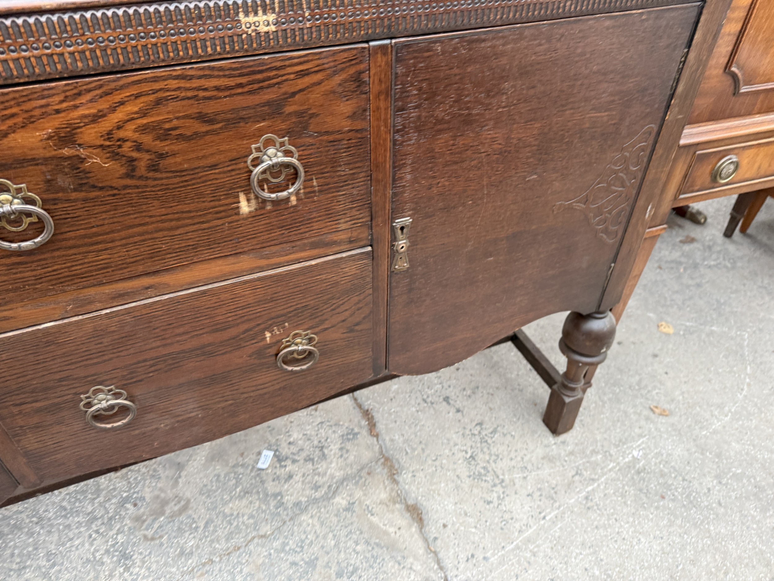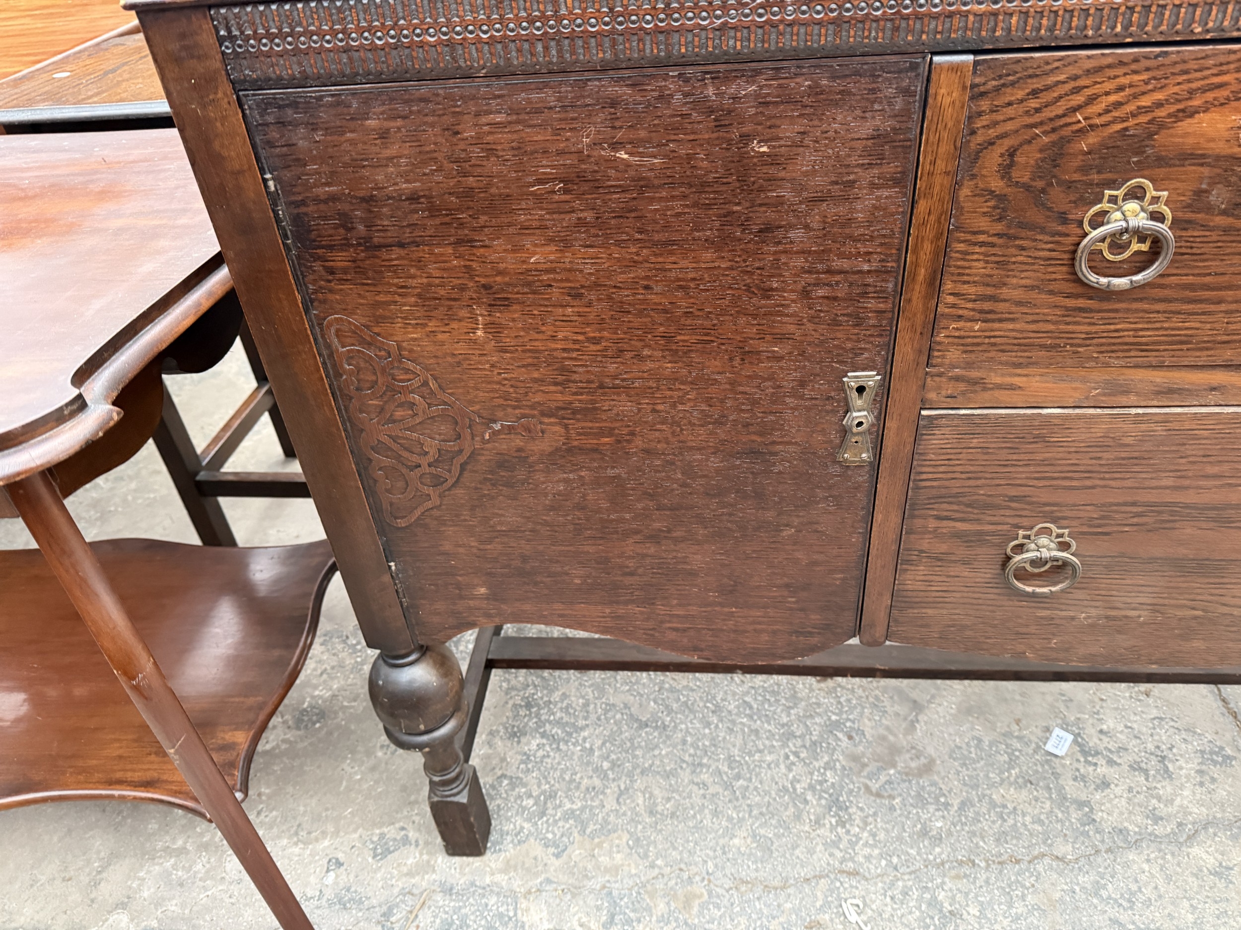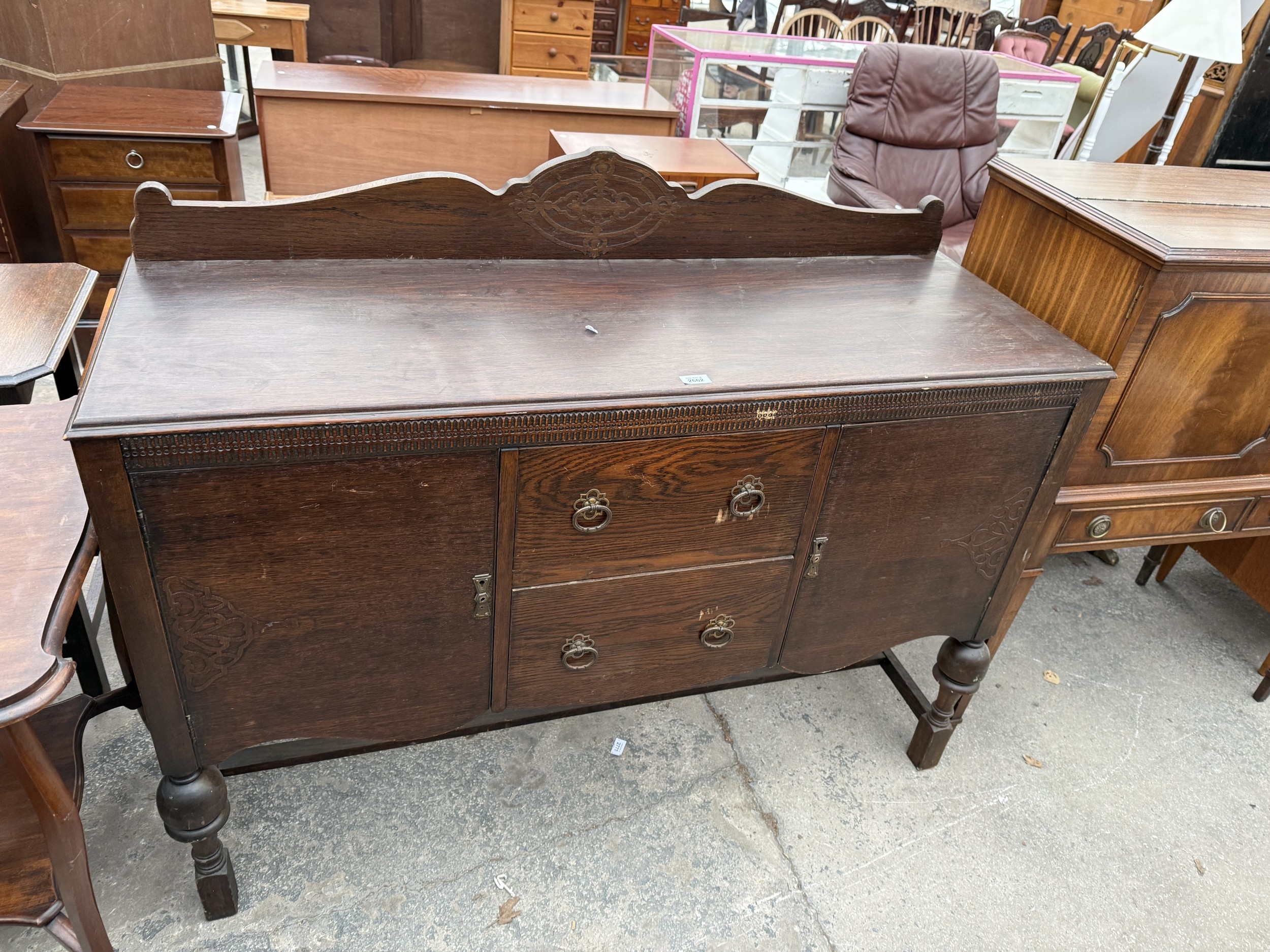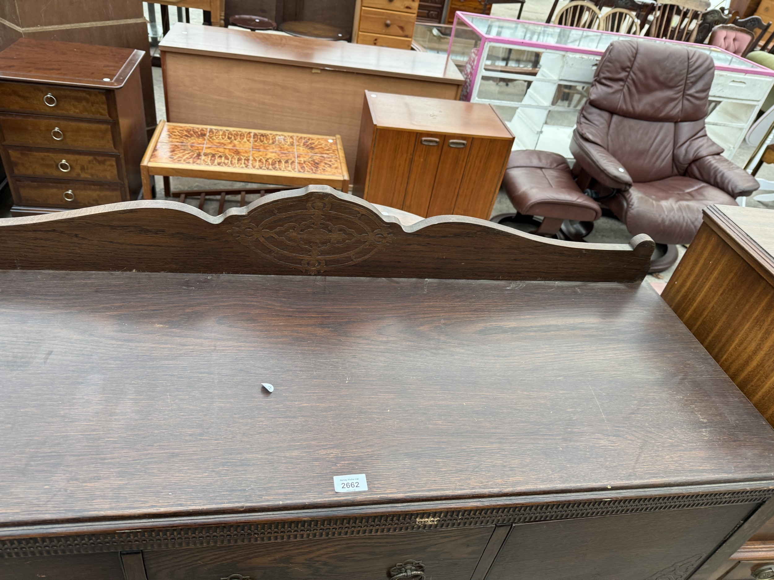 A MID 20TH CENTURY OAK SIDEBOARD WITH RAISED BACK, 54" WIDE
