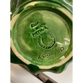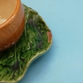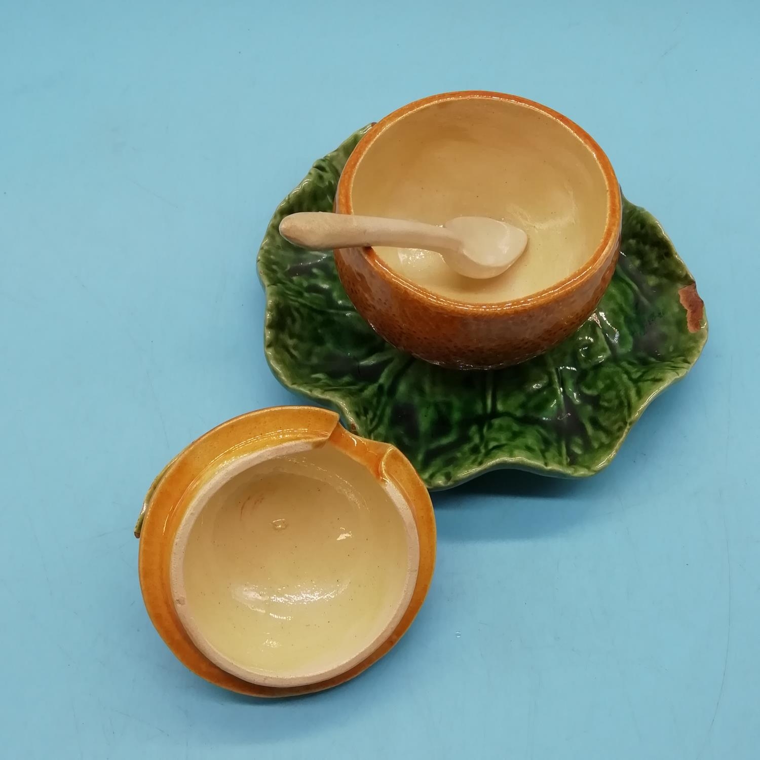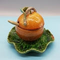 Old Bordallo Pinheiro (Portugal) Majolica Orange Marmalade Pot and Spoon. 12cm High, 15cm Diameter. Chip to Side of Dish.