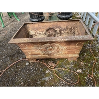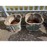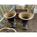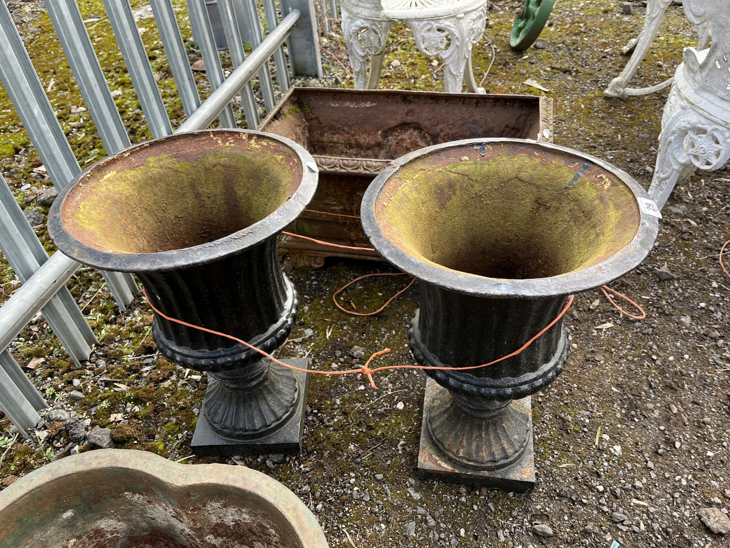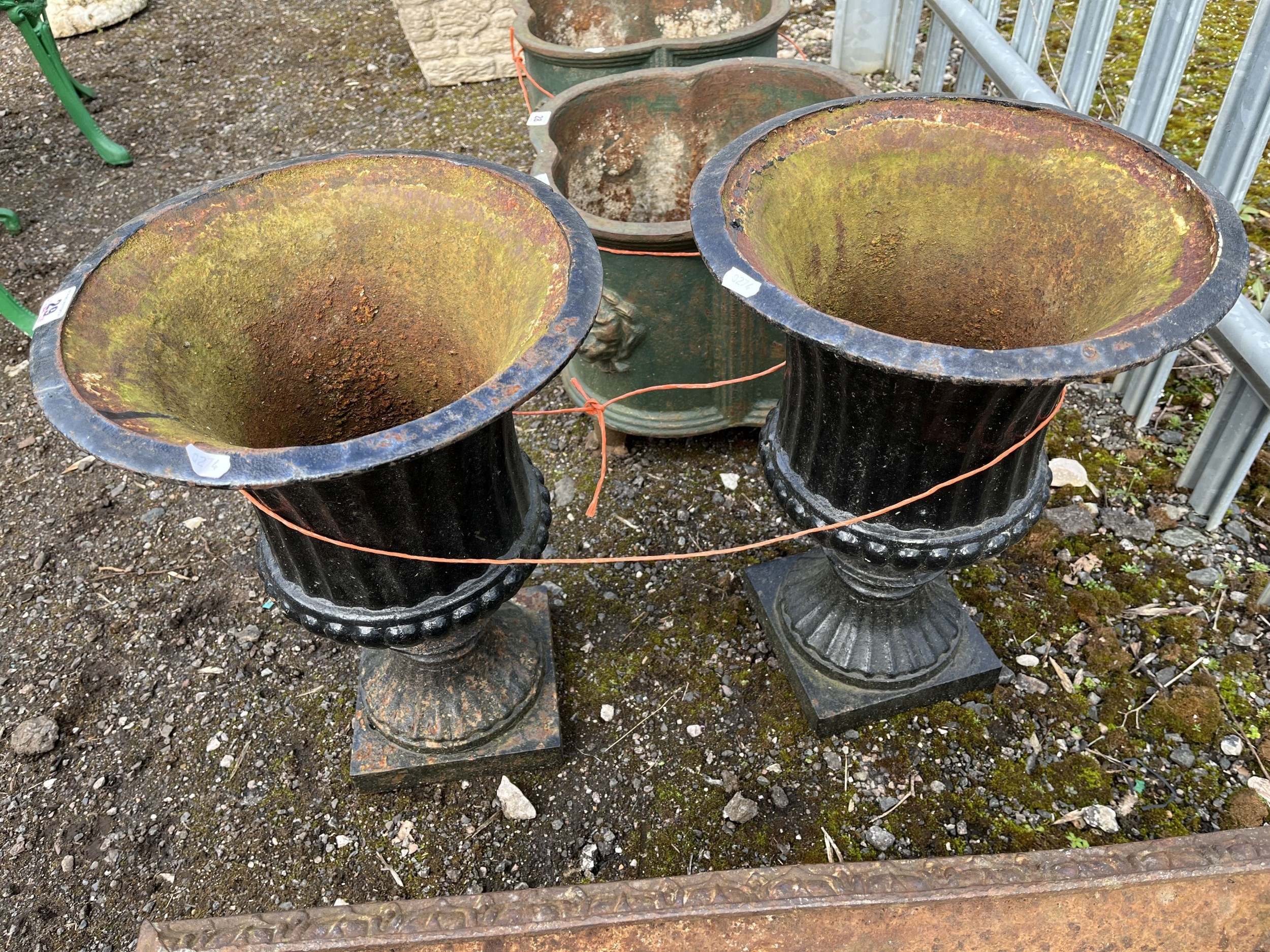 A PAIR OF CAST IRON CAMPAGNA URNS with fluted detailing, height 47cm. Condition Report: rust and paint losses