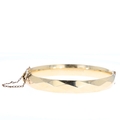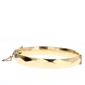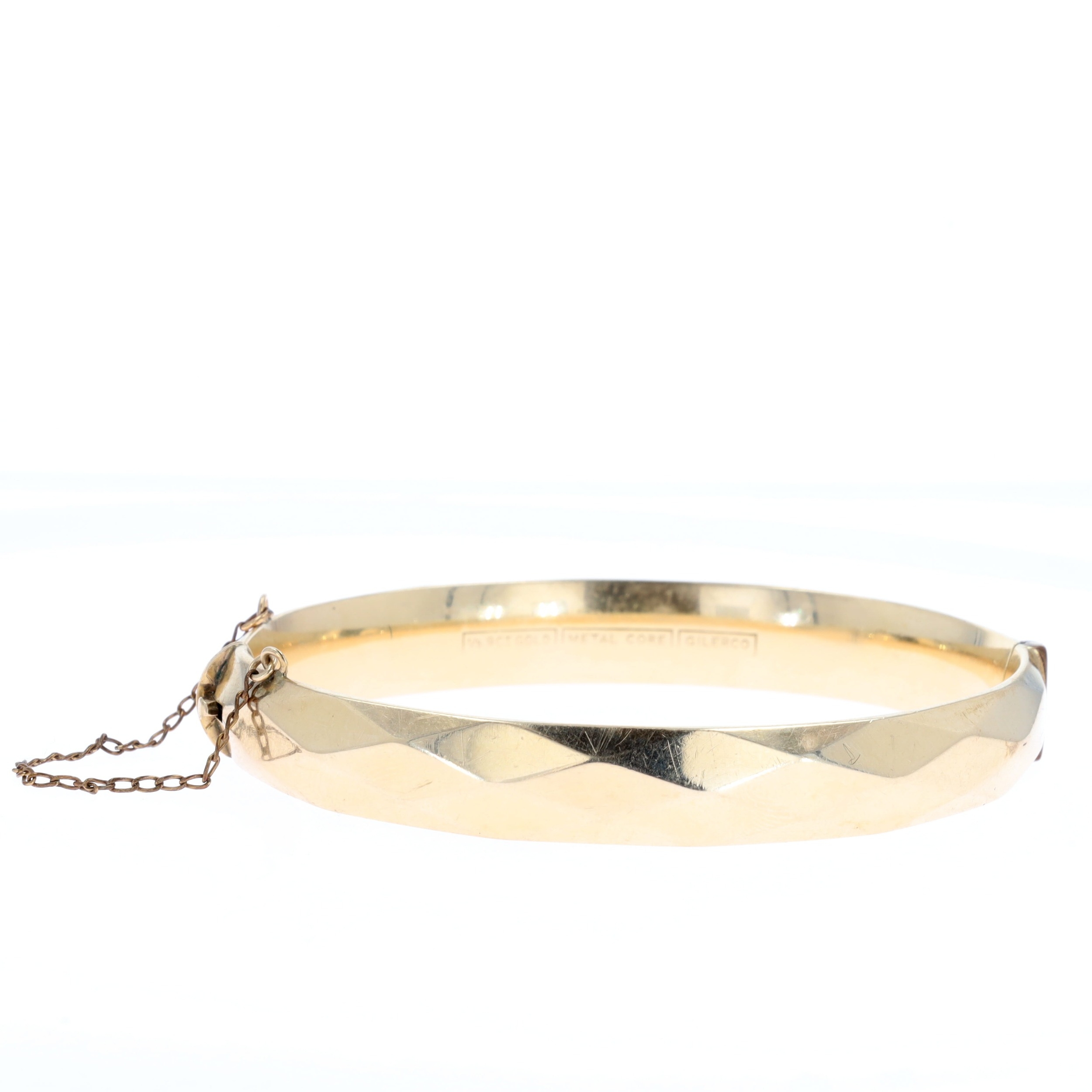 9ct Rolled Gold Bangle with Harlequin Design. Stamped on the inside 1/5th 9ct gold metal core. Safety chain intact, clasp and hinge are in working order, minimal wear to plating, minor surface scratches. Measures internally approx. 6 x 5.2cm. Weighs in total 37.6g.