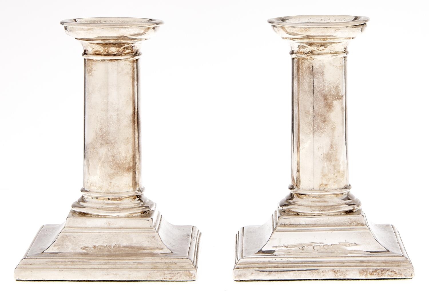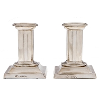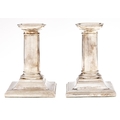 A pair of Victorian silver dwarf columnar candlesticks, nozzles, 10.5cm h, by Horace Woodward & Co Ltd, London 1894, loaded