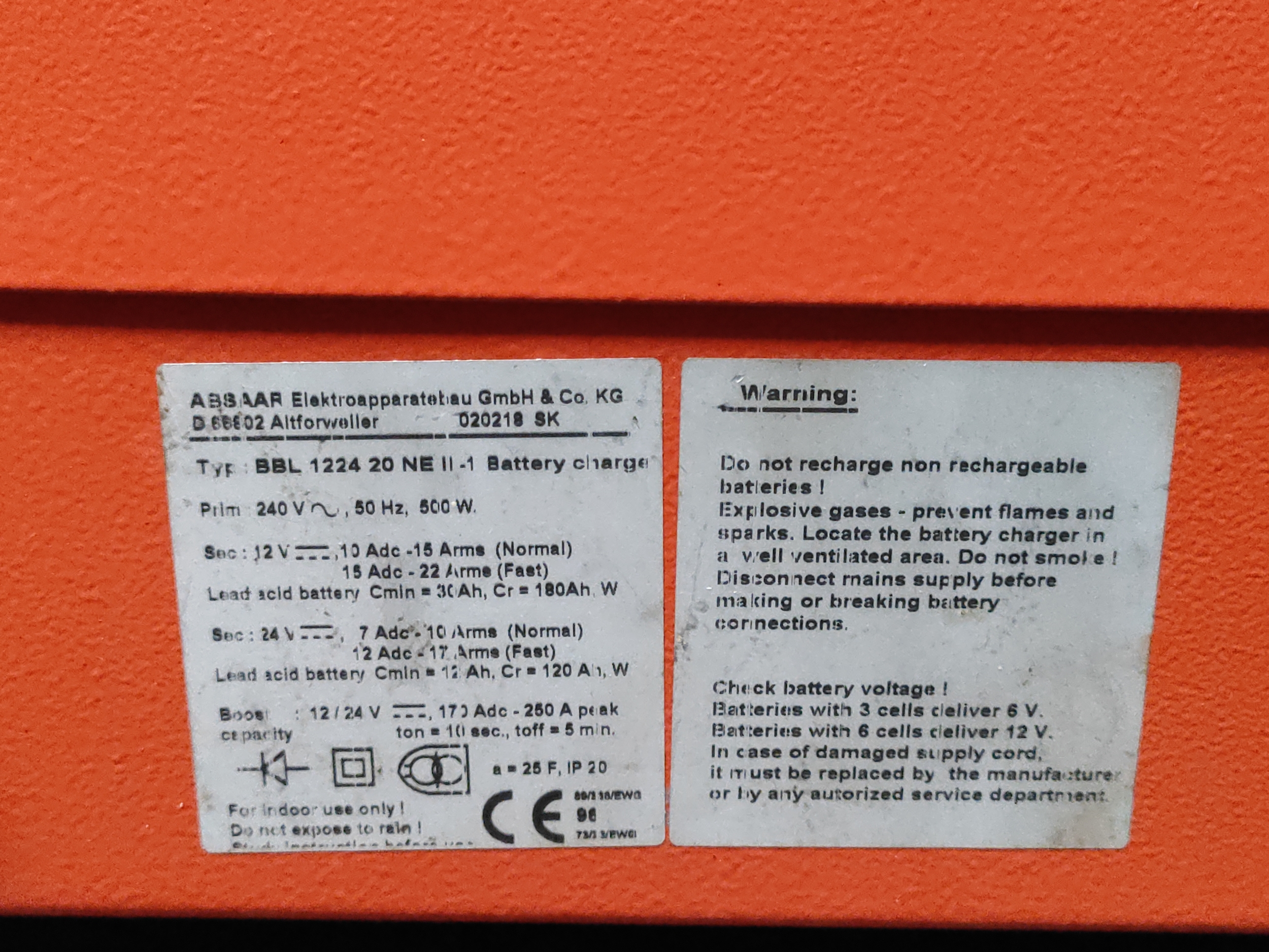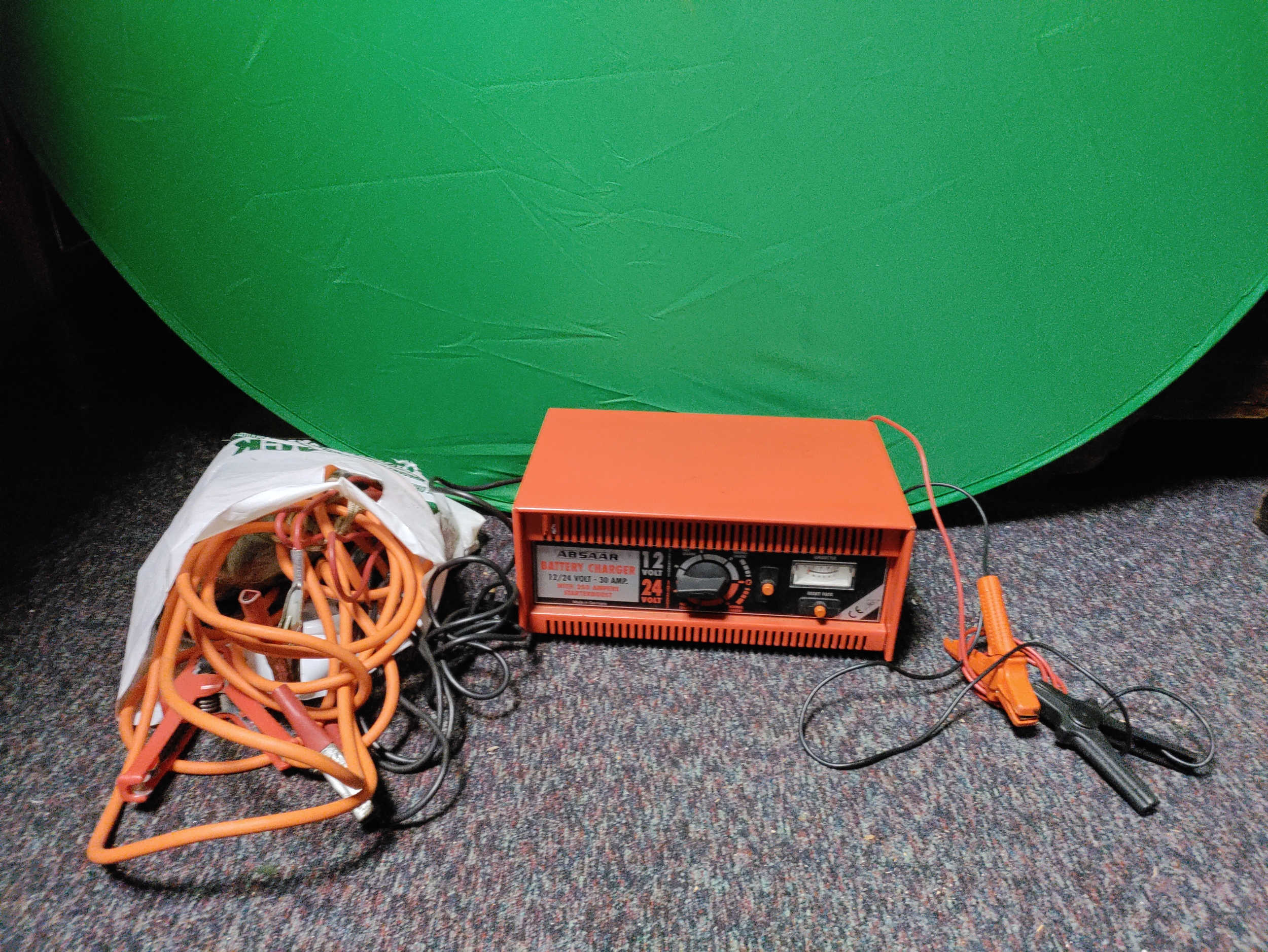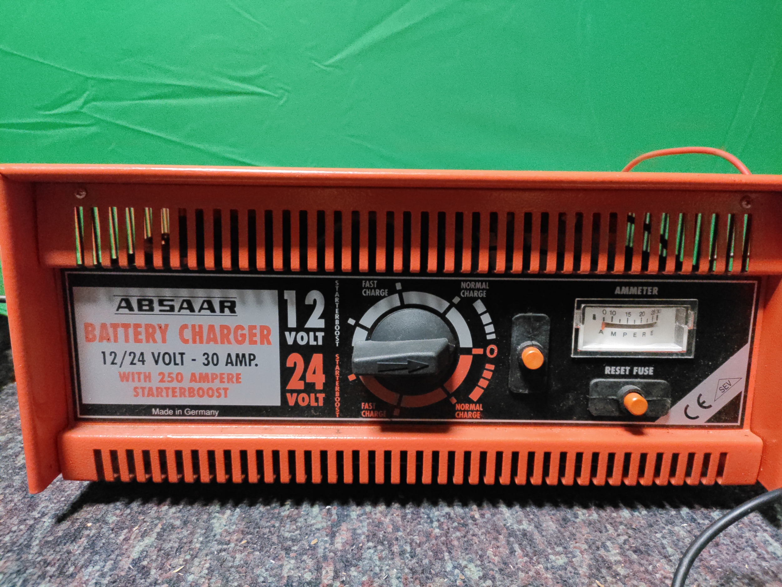 An Absaar battery charger 12/24 volt - 30 AMP with 250 ampere starter boost . Untested, believed working & battery clamps.