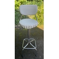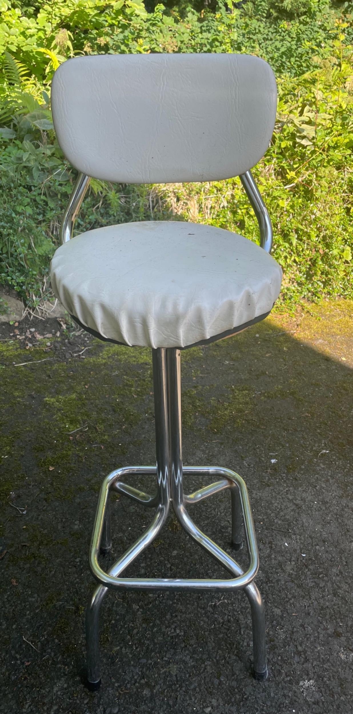 A retro 1970's cream leatherette and stainless steel bar stool (100cmH x 37cmW) and a retro swivel footstool in beige vinyl (68cm L x 55cmD)