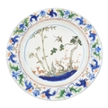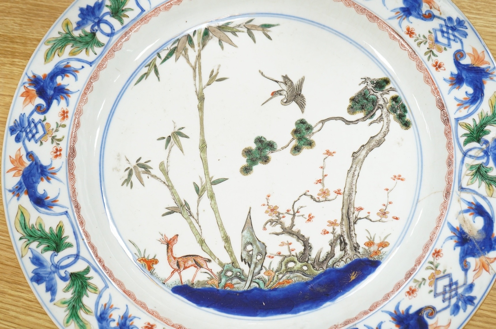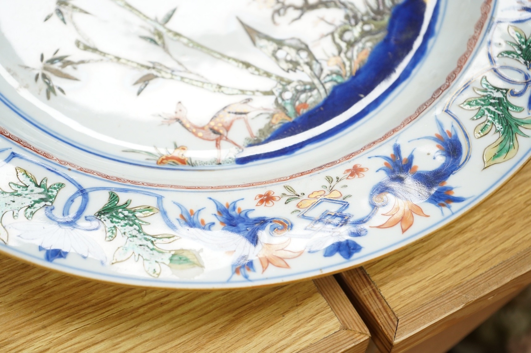 A Chinese famille verte dish, Kangxi period, painted with deer and foliage, 39cm in diameter