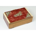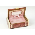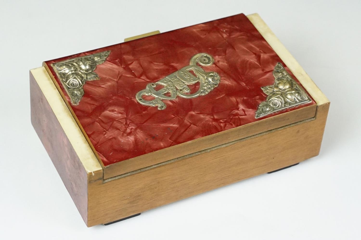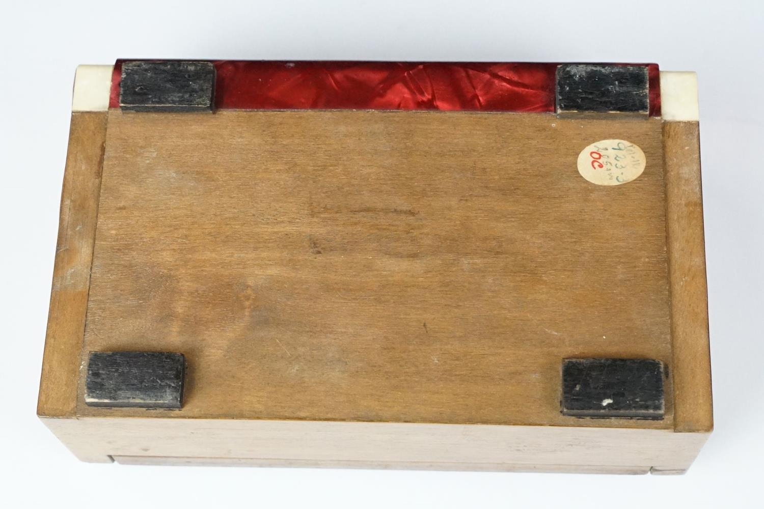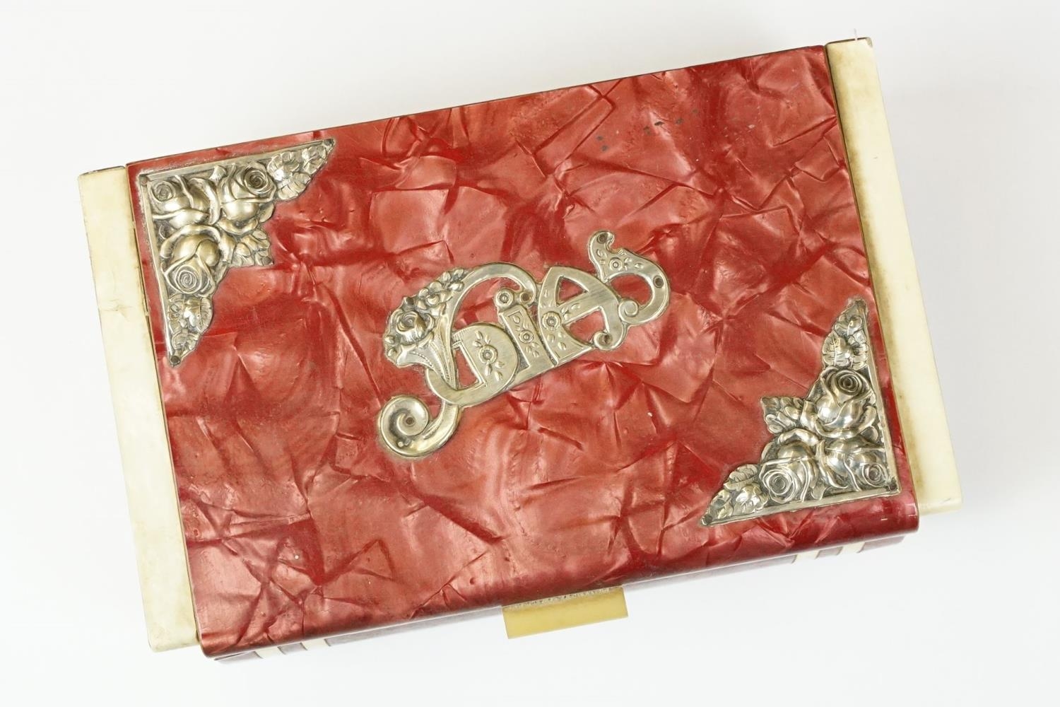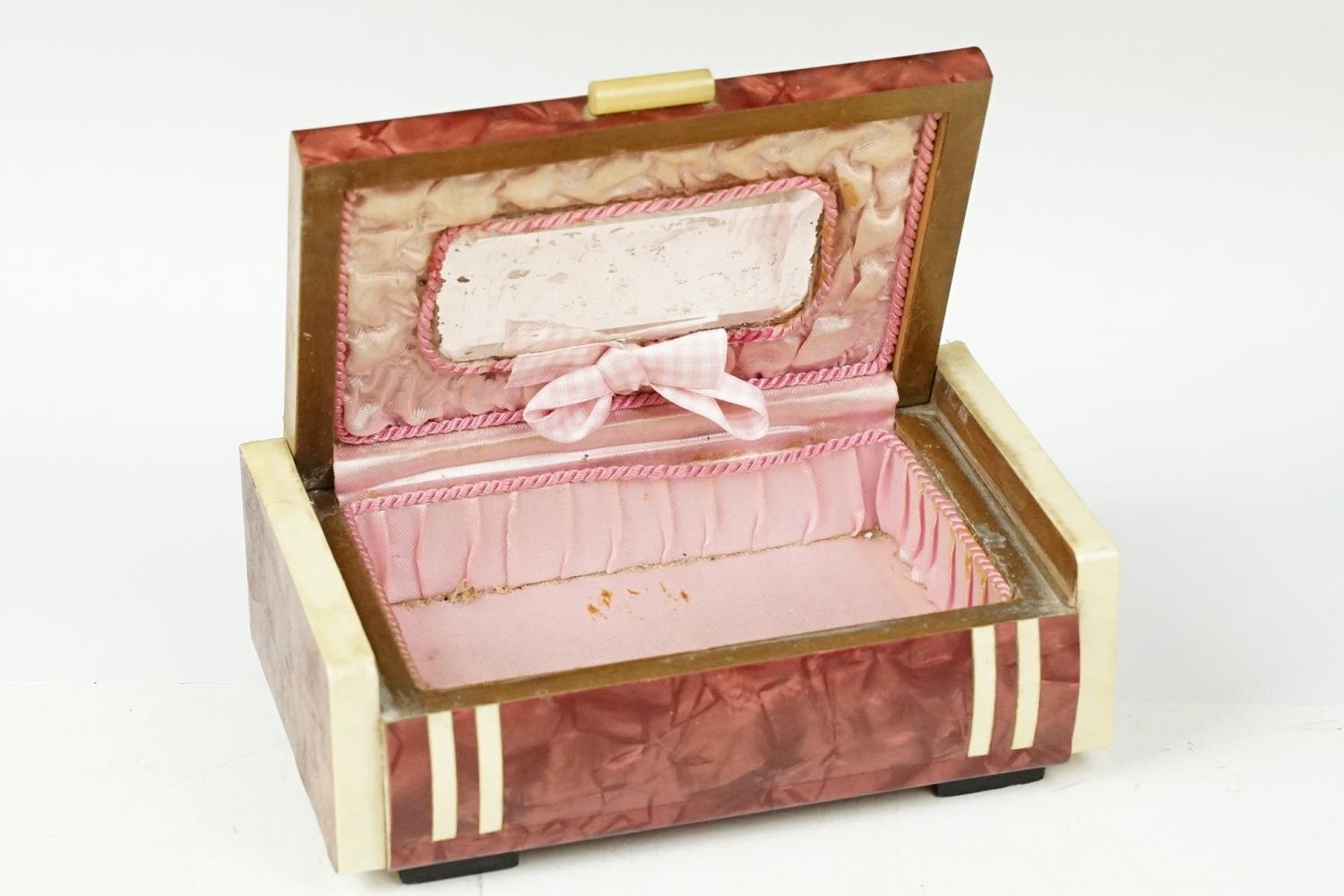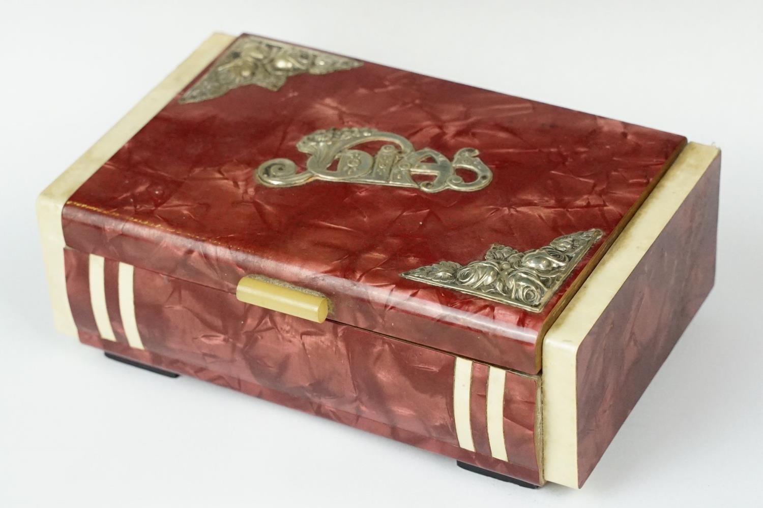 Art Deco celluloid covered Art Deco jewellery box with silk lined interior. Measures 18cm wide.