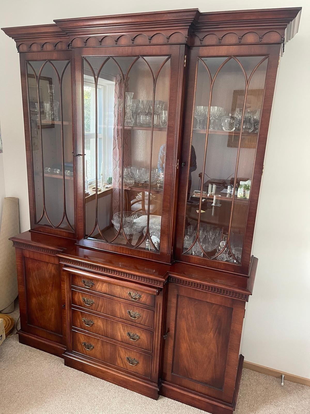 NICE QUALITY! A large mahogany GEORGIAN revival breakfront library bookcase with two cupboards and four drawers with a scroll fronted pull-out writing pad - this is a substantial piece with three astral glazed doors.