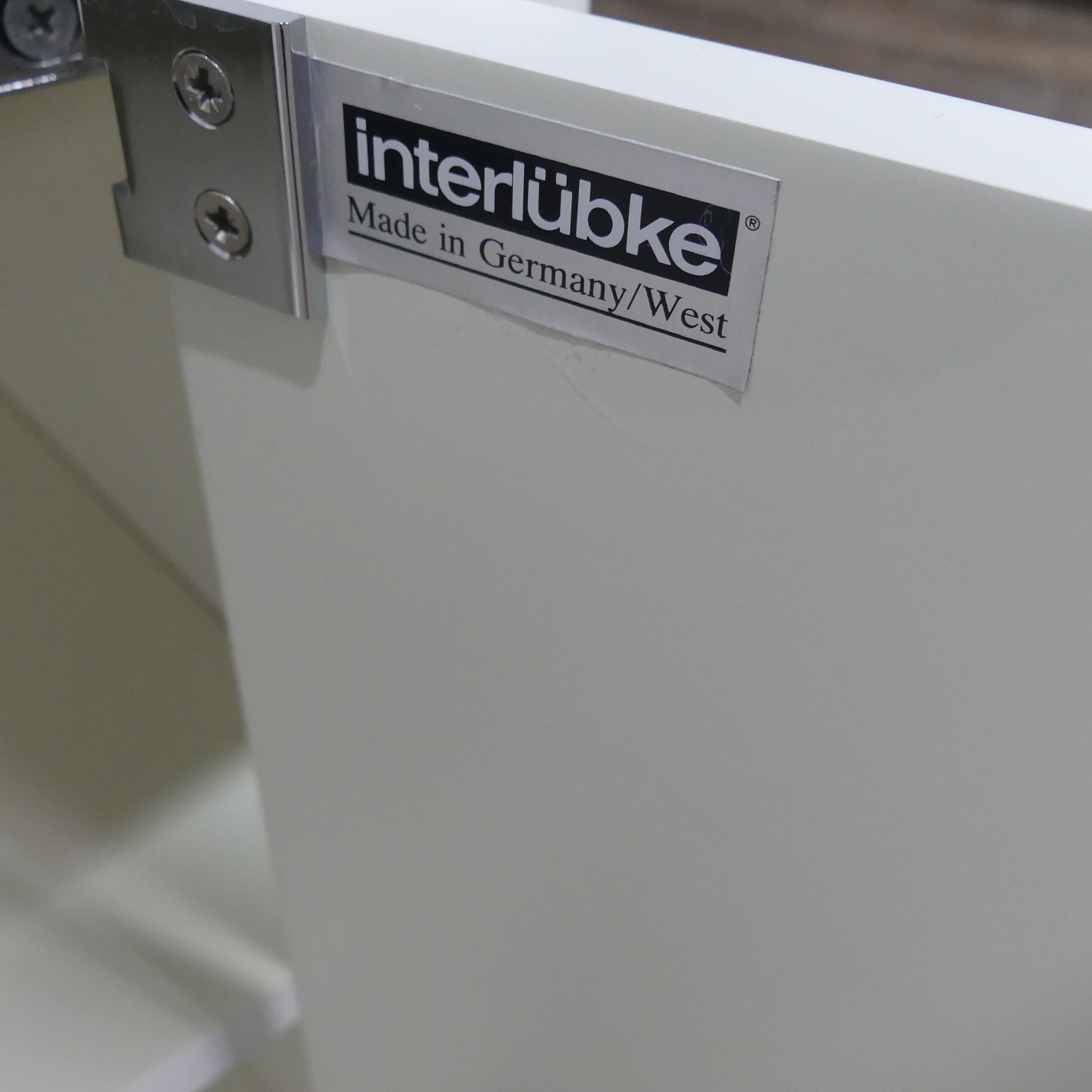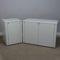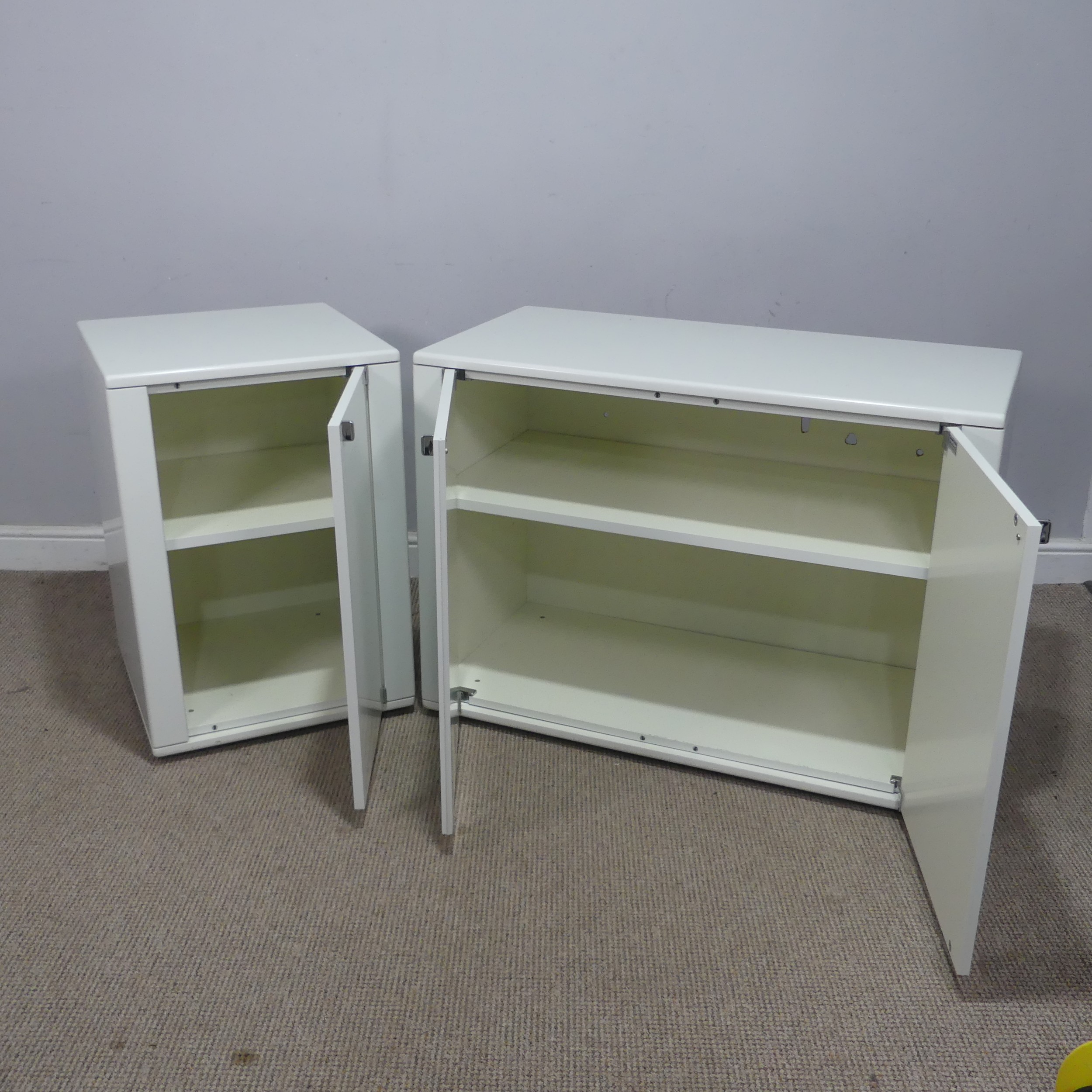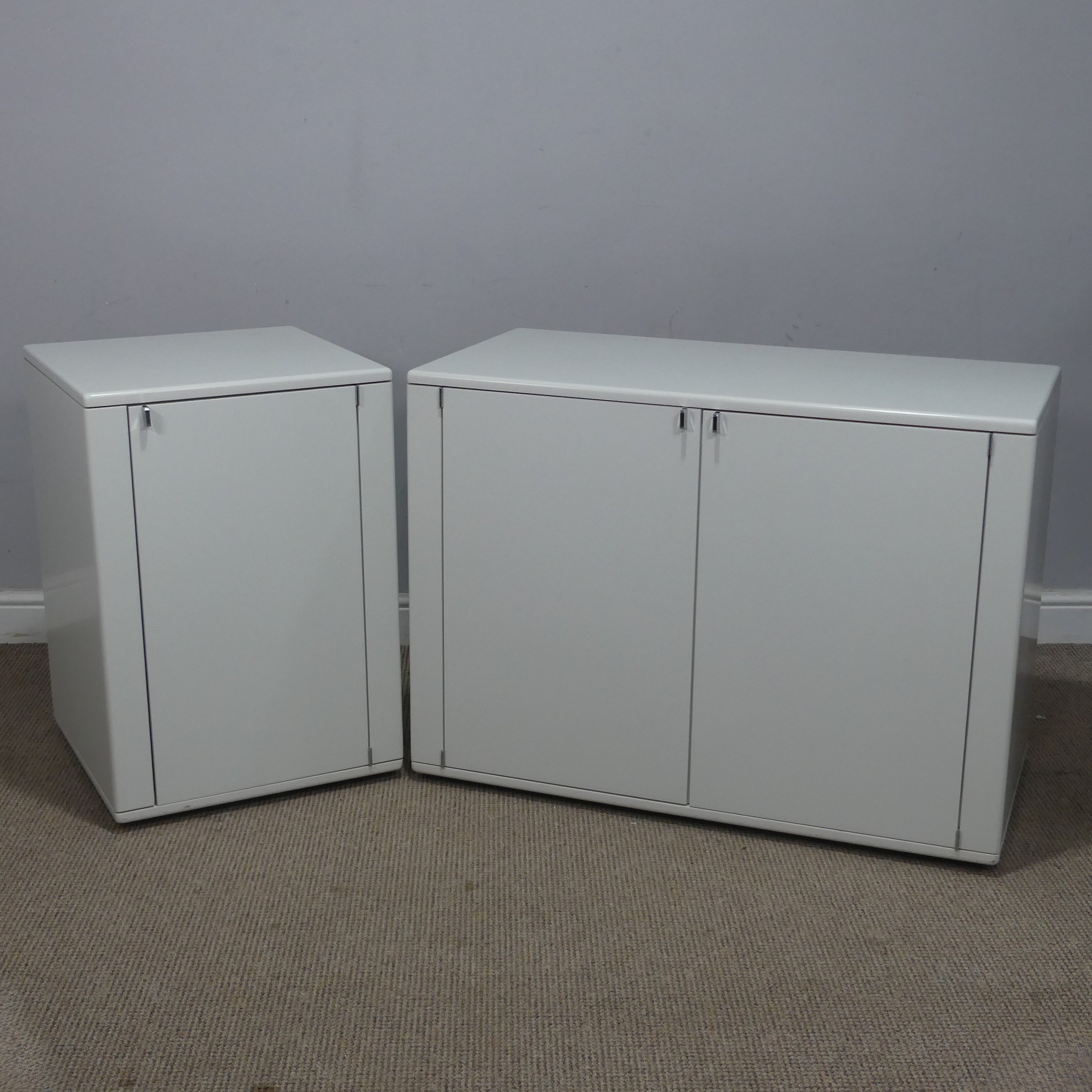 A Mid-20th century Interlubke of West Germany modular white Sideboard, W 96 cm x H 70 cm x D 48 cm, together with a squared side Cabinet, W 48 cm x H 72 cm x D 48 cm. (2)