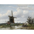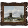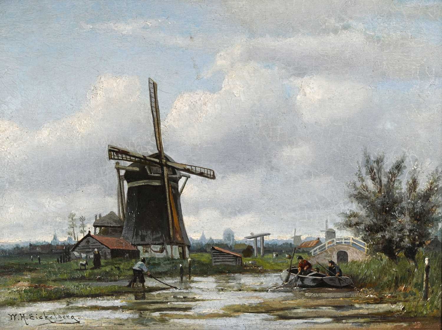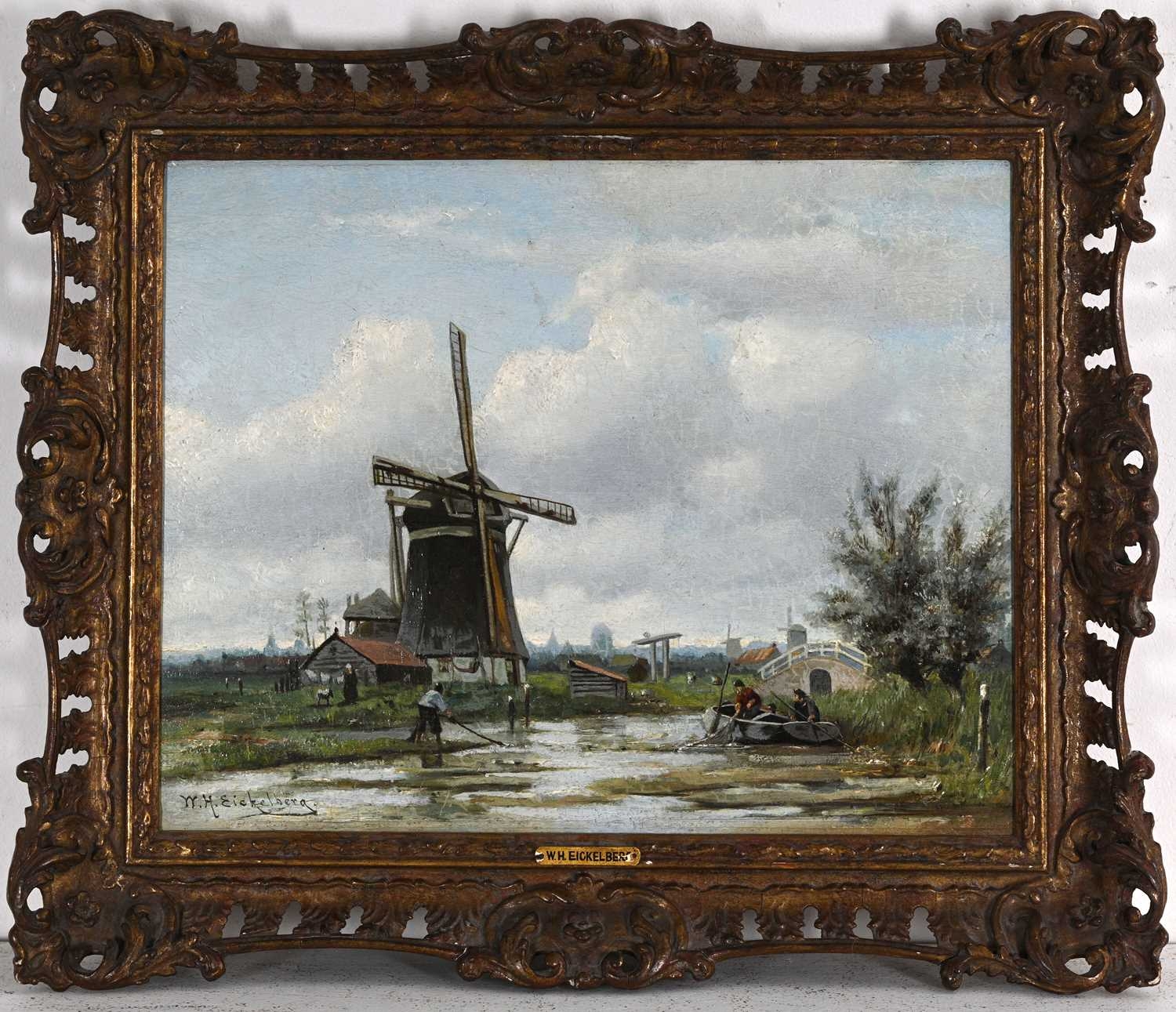 Willem Hendrik Eickelberg (Dutch, 1845-1920), a Dutch river landscape with windmills and fisherfolk, signed l.l., oil on panel, 26 by 34cm, gilt frame. Provenance: with MacConnal-Mason, London