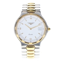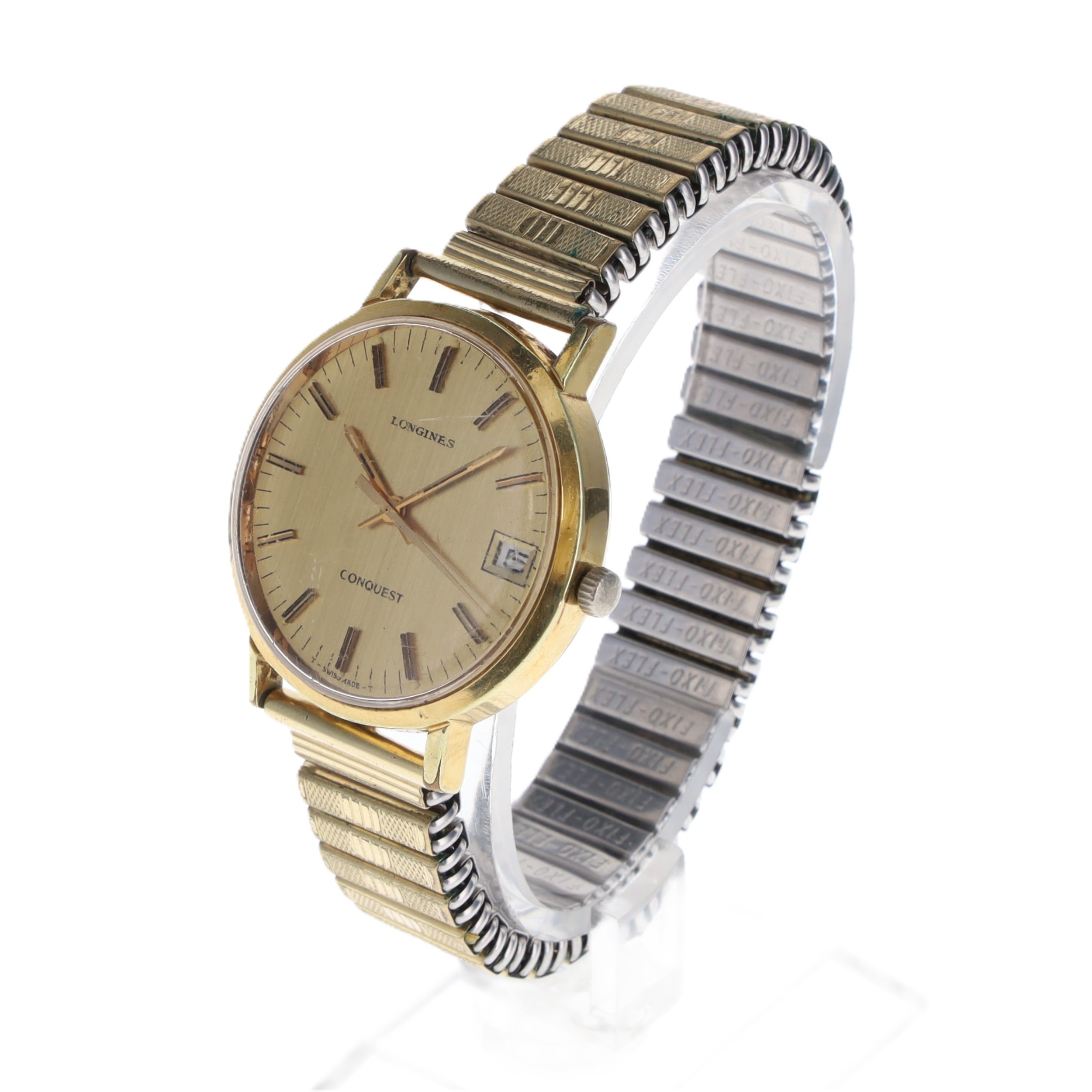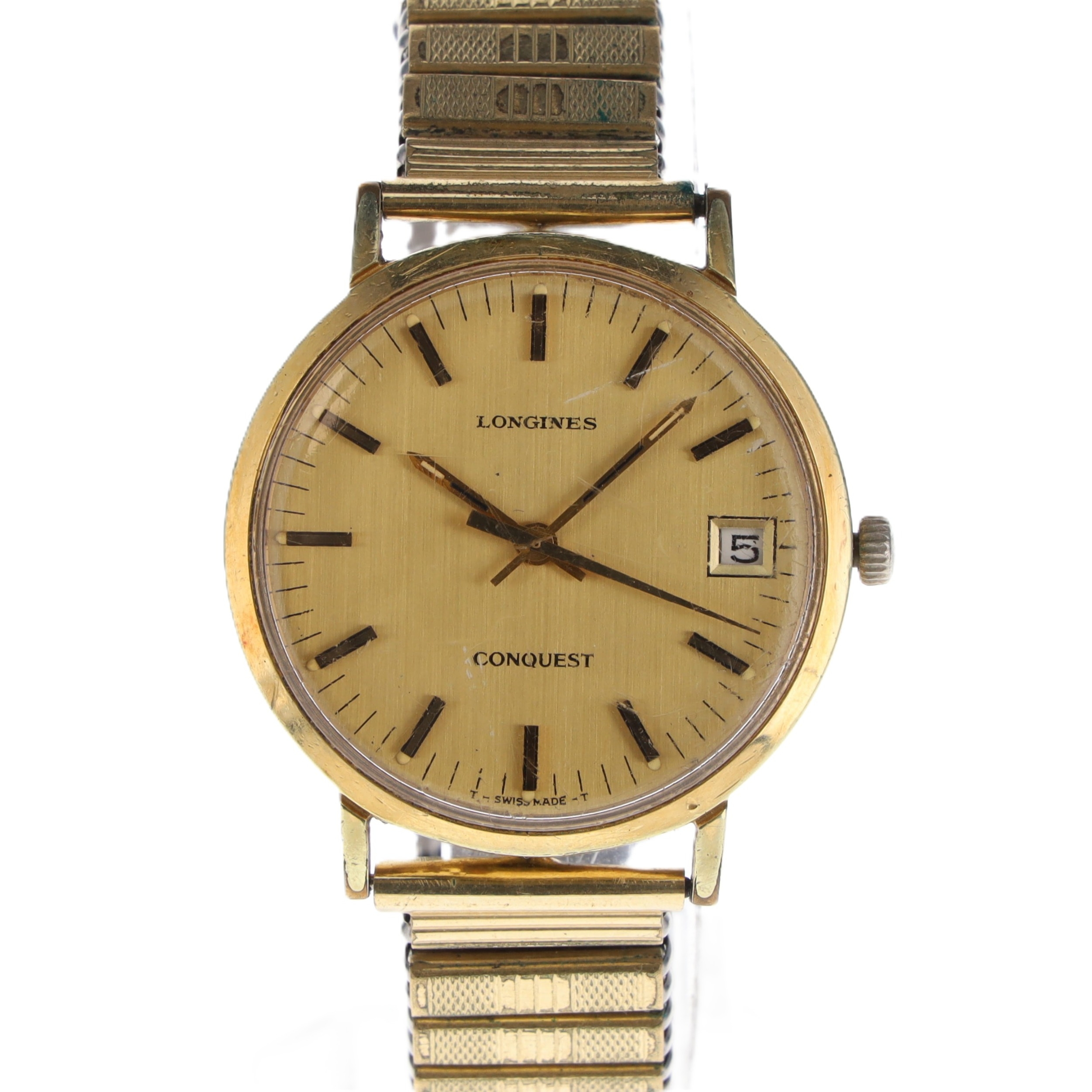 Longines - Conquest Gold Tone Watch. Hand-wind movement. Gold tone metal case and gold tone expandable bracelet. Acrylic crystal has some scratches present. Intended for spares, repairs and restoration, offered without original box or papers.