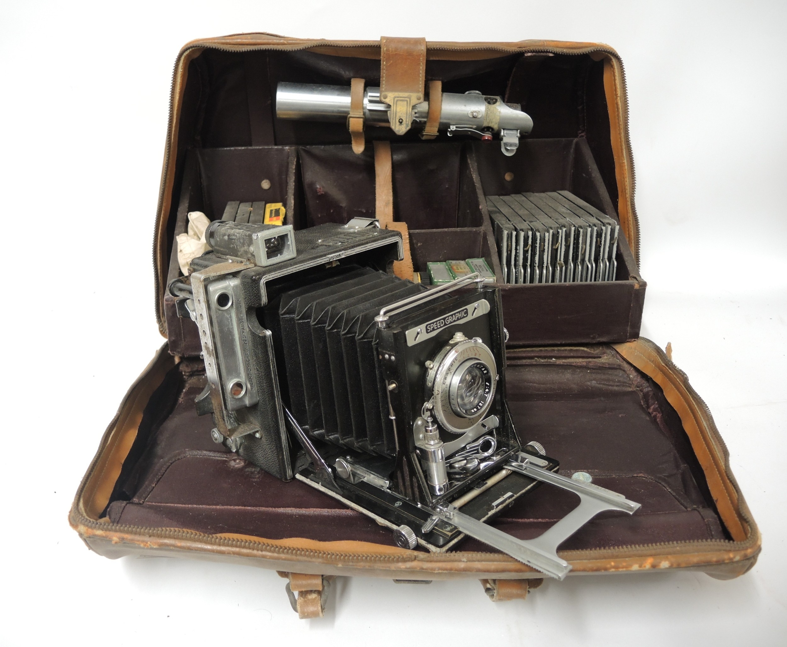 Graflex Speed Graphic camera outfit in original fitted leather case, with accessories