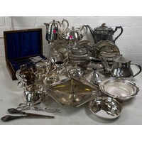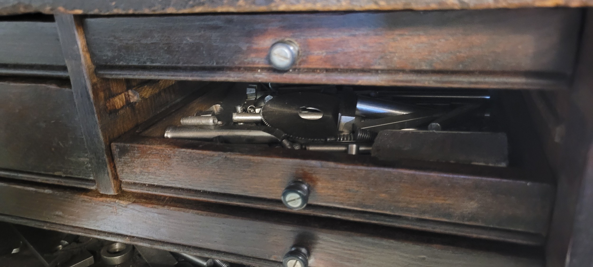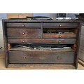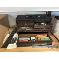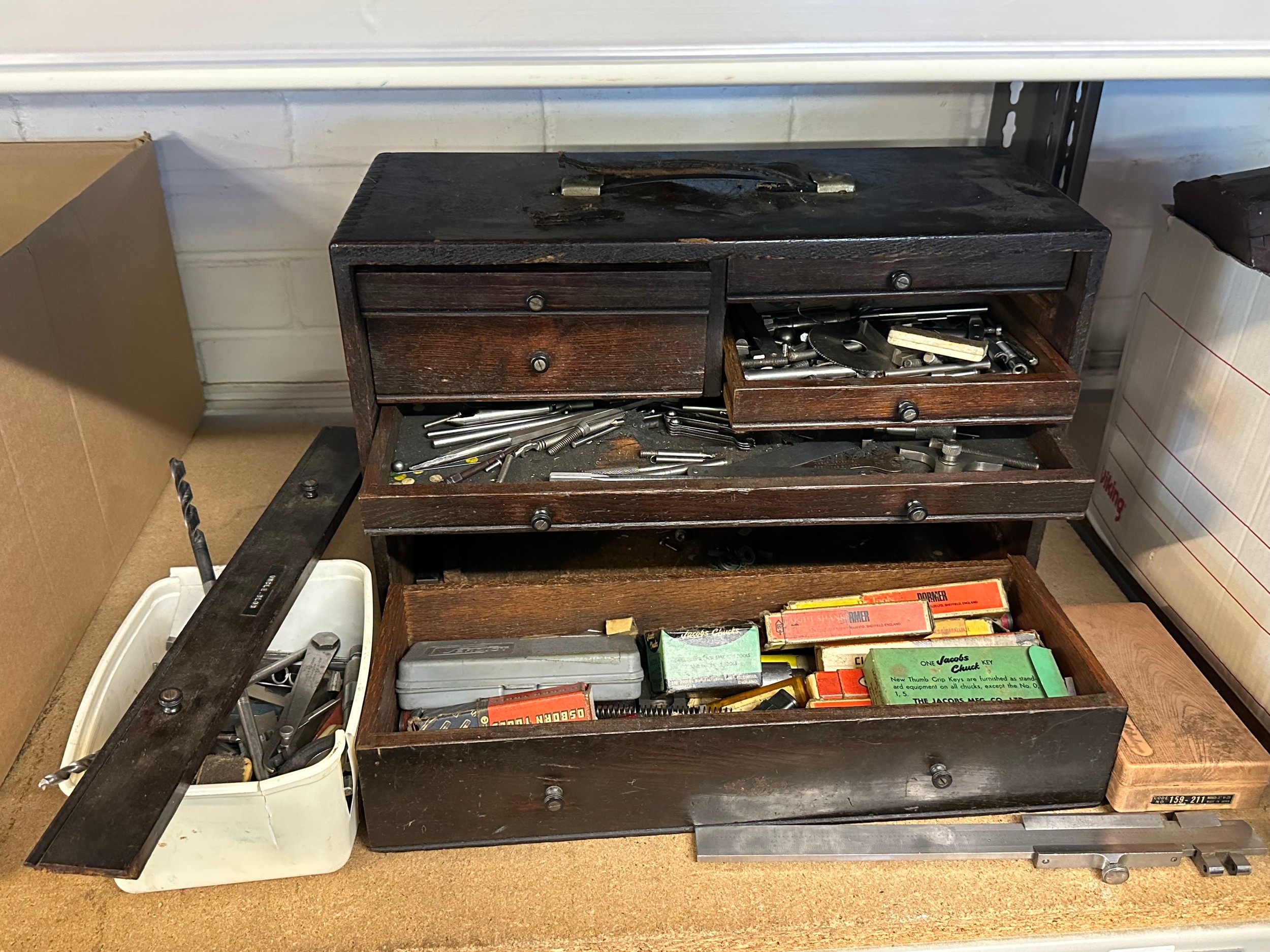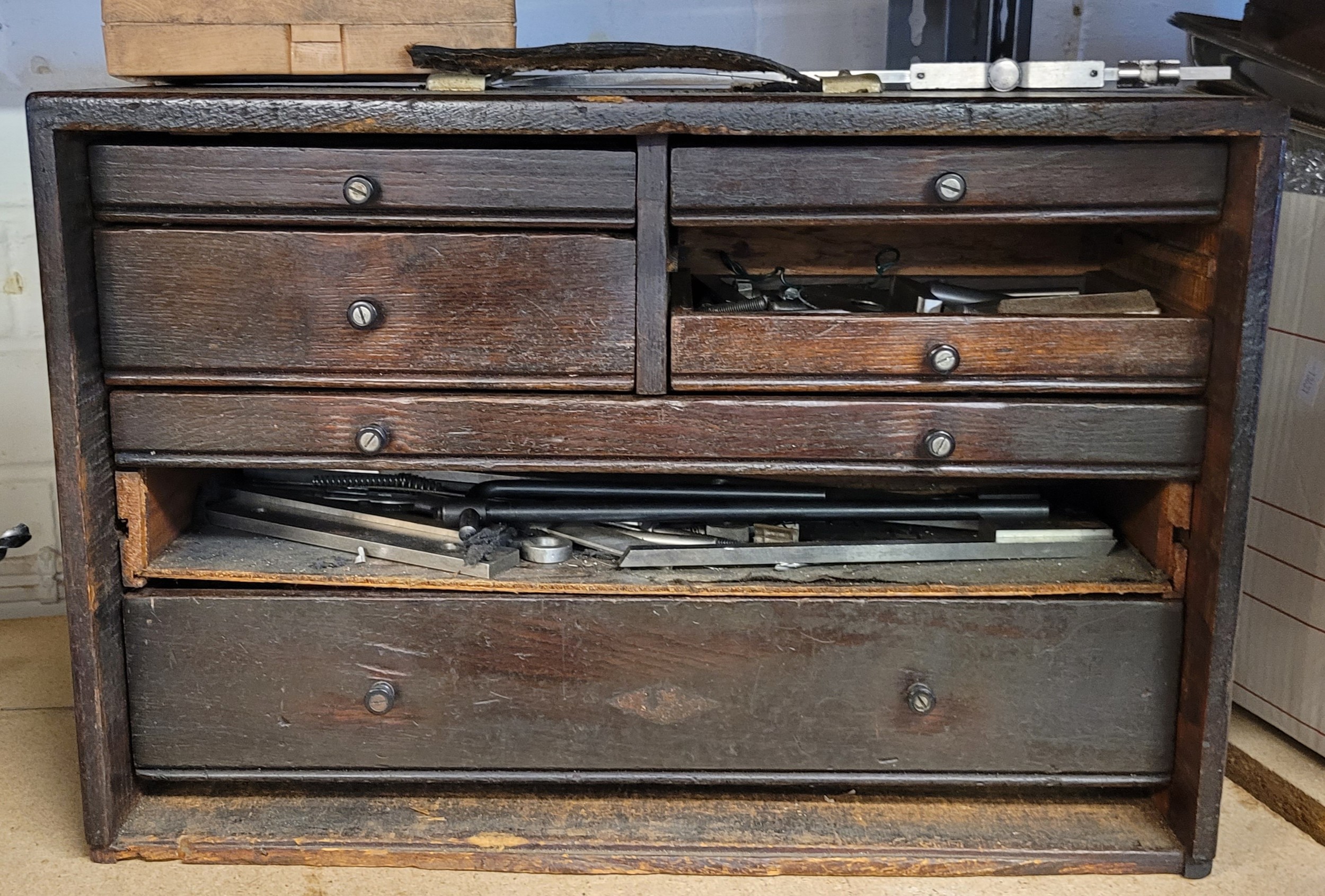 Engineers wooden toolbox in need of repair containing assorted tools, drill bits, etc (large draw front is present, missing small drawer to front right)