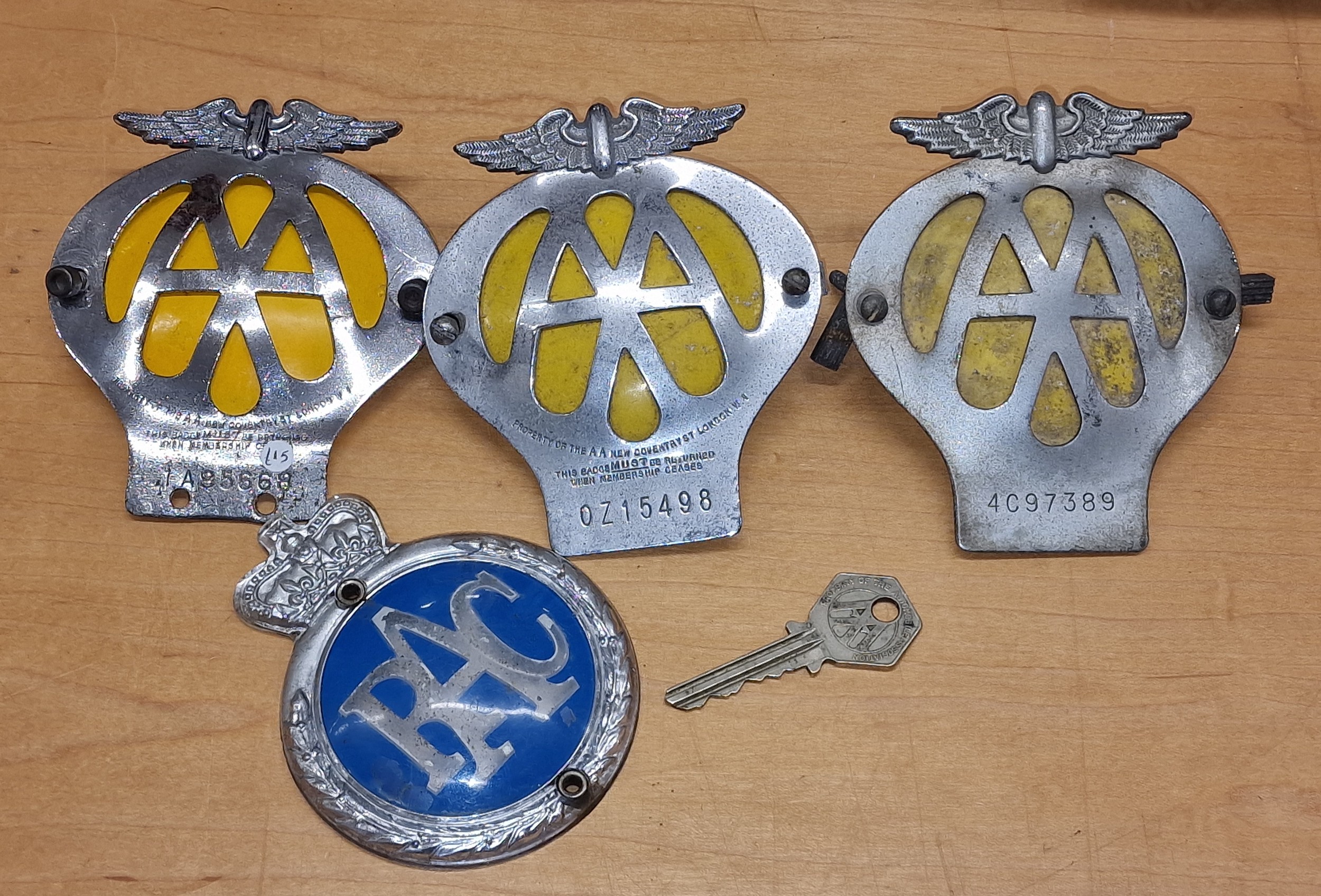 3 x vintage AA car badges, AA key and RAC car badge