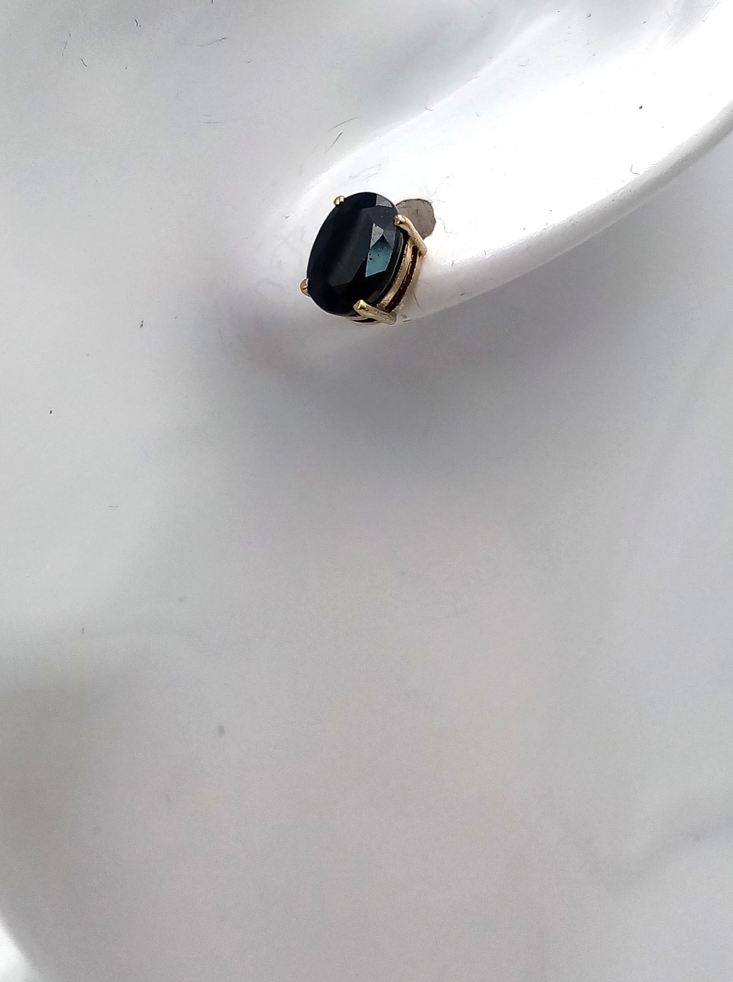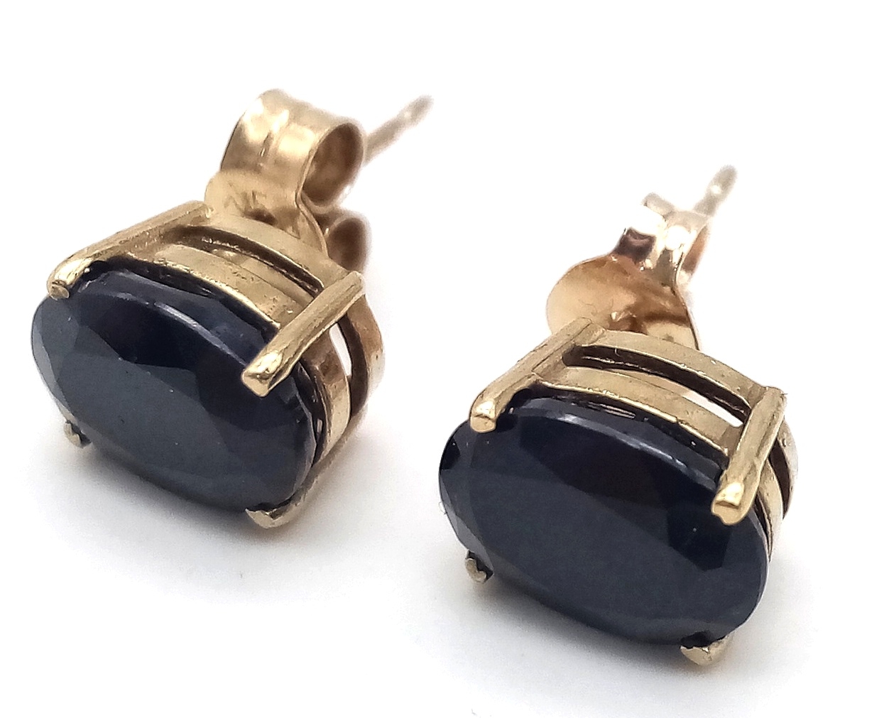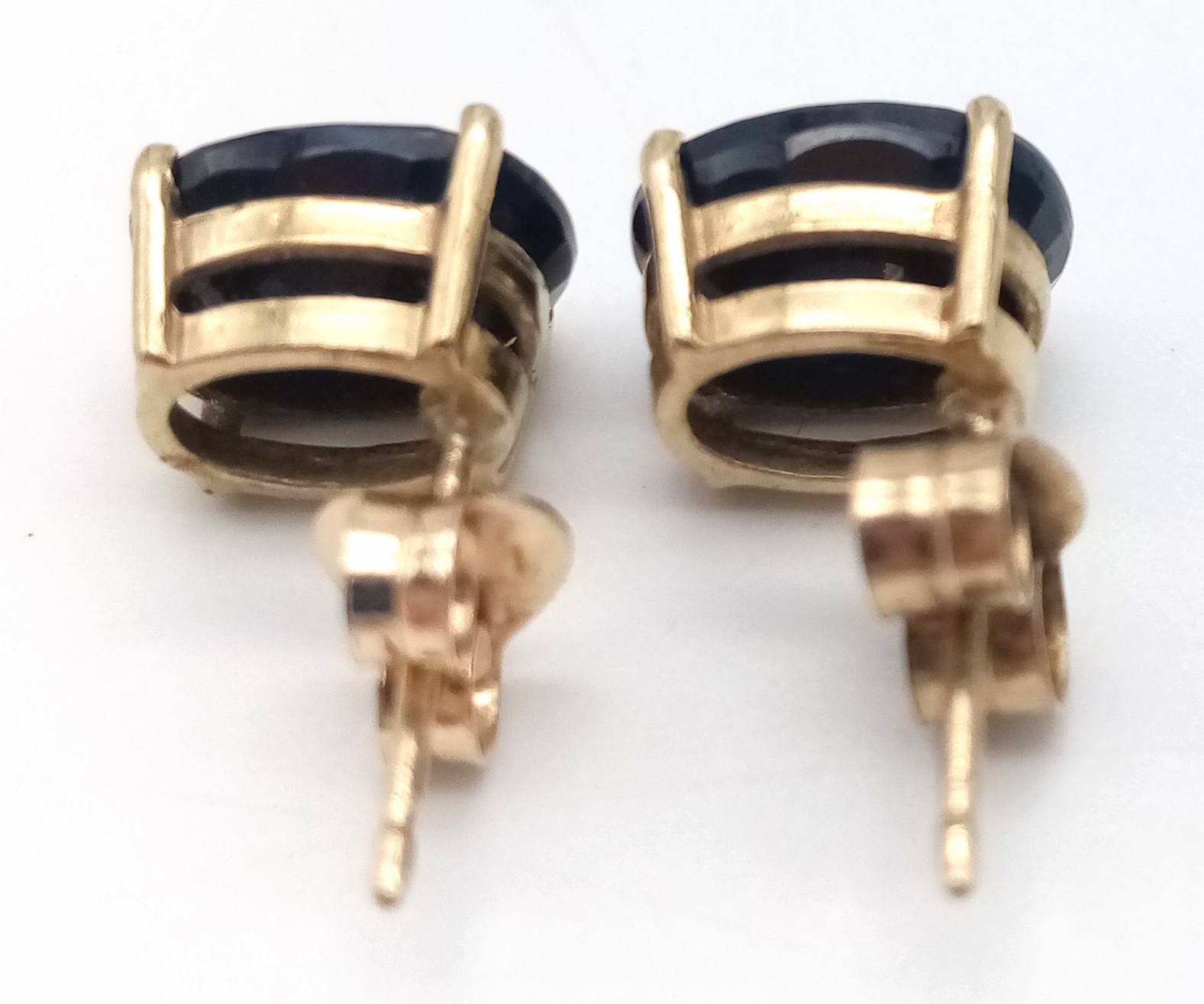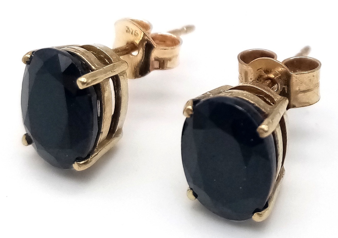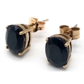 A Pleasing Pair of 9K Gold Oval Cut Midnight Blue Sapphire Stud Earrings. Set with 8 x 6mm Oval Cut Sapphires, approximately 1.4 carat each. Combined Gross weight 1.56 Grams.