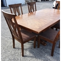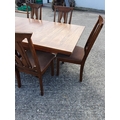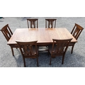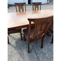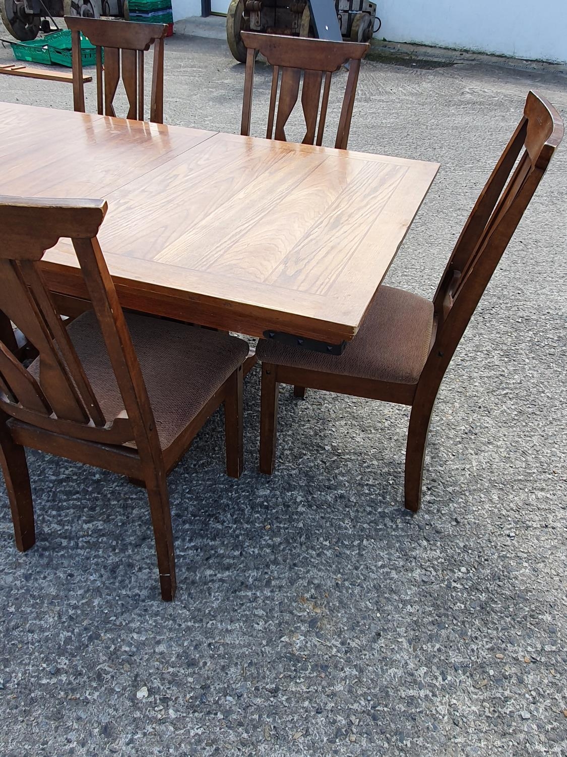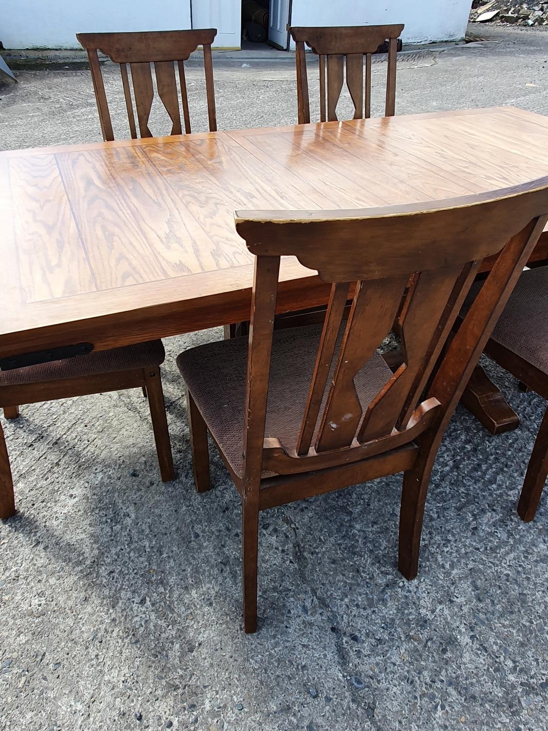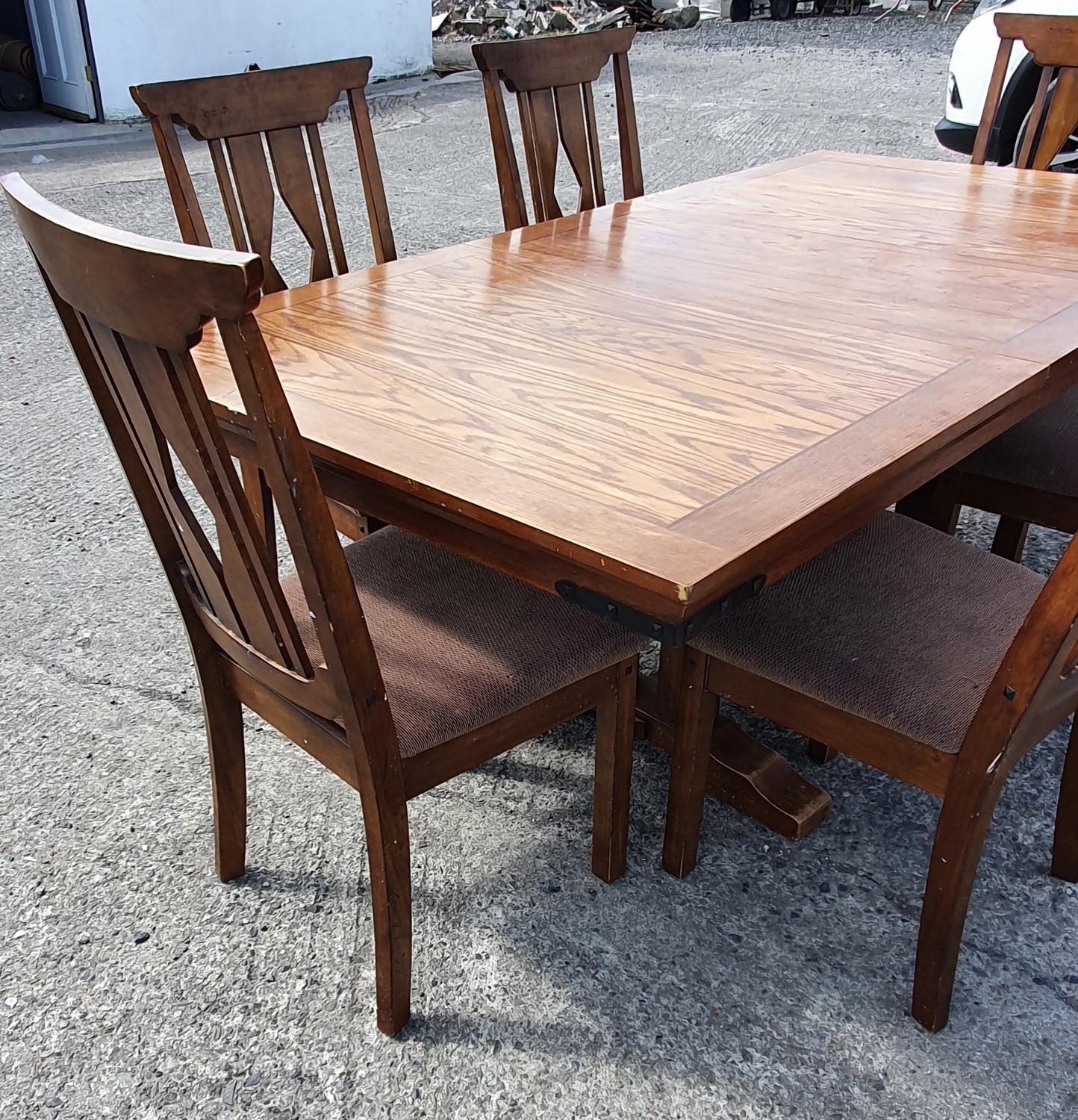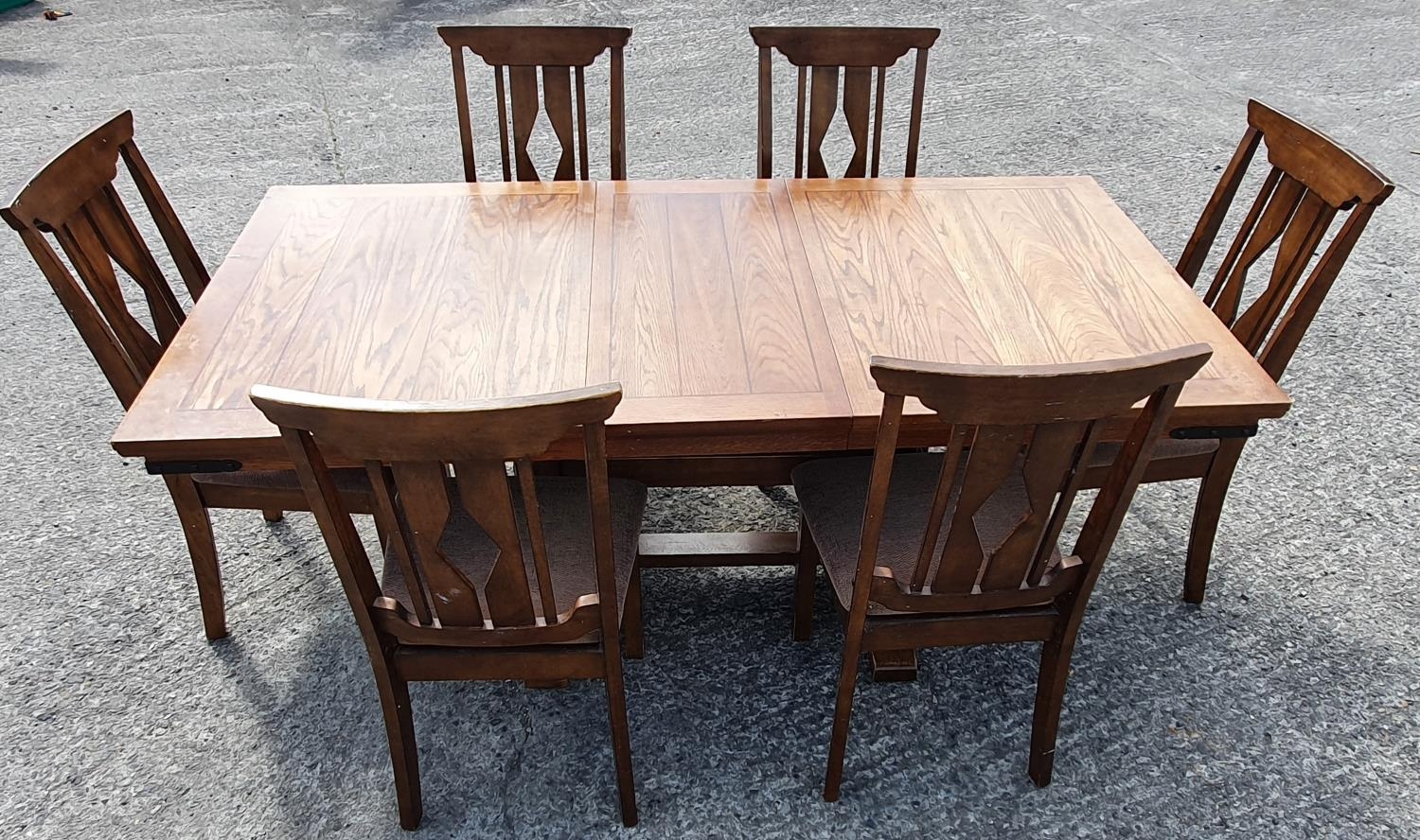 An Oak Drawer leaf style Table and set of six Chairs. 152 x 107 closed.