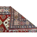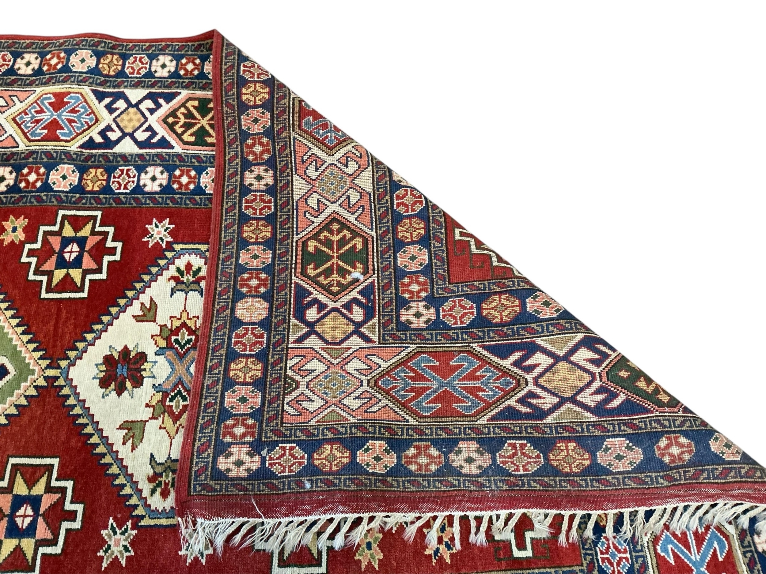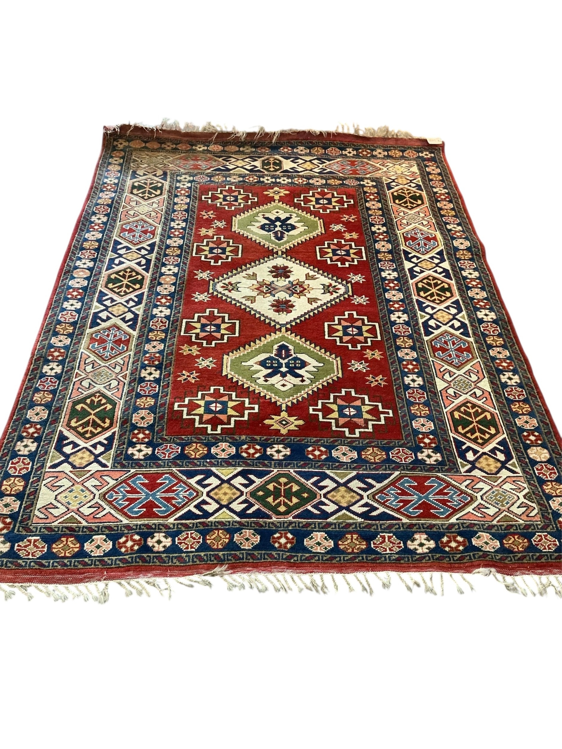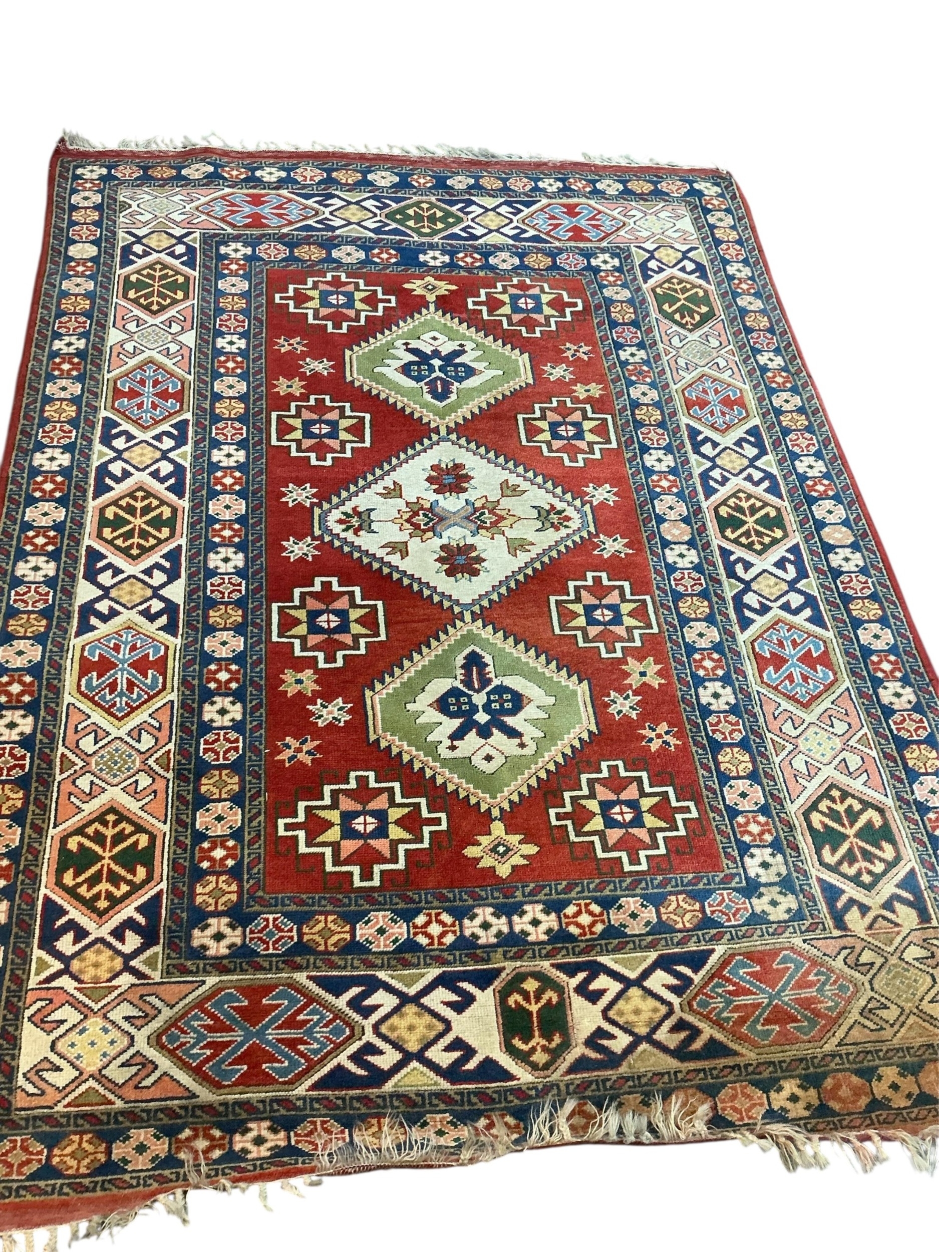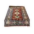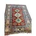 A Caucasian Kazak style rug, woven with geometric designs in iron red and blue, 200cm x 146cm