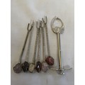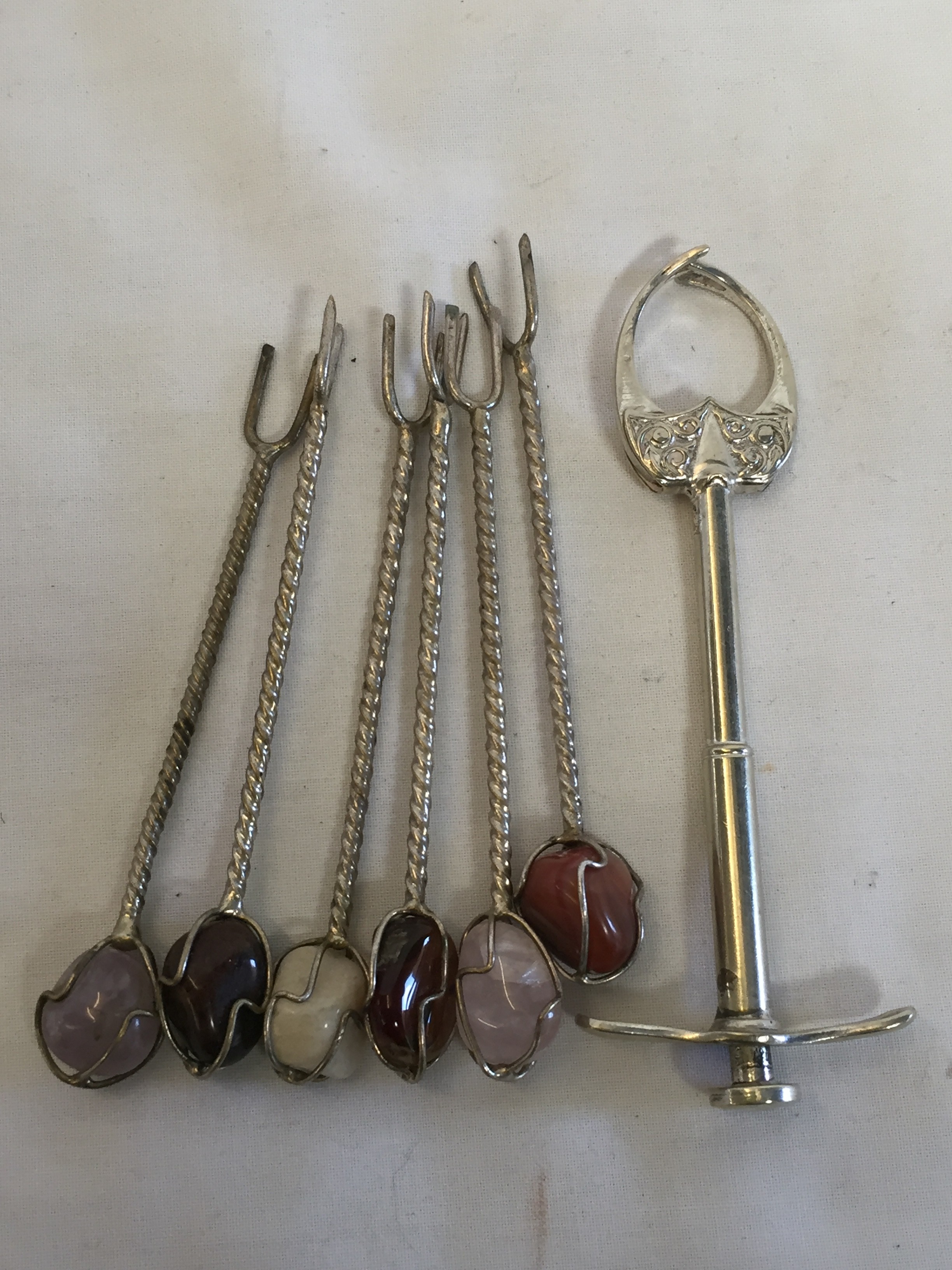 SET OF 6 METAL PICKLE FORKS WITH GEMSTONE TOPS AND PAIR OF RETRACTABLE PICKLE / SUGAR NIPS